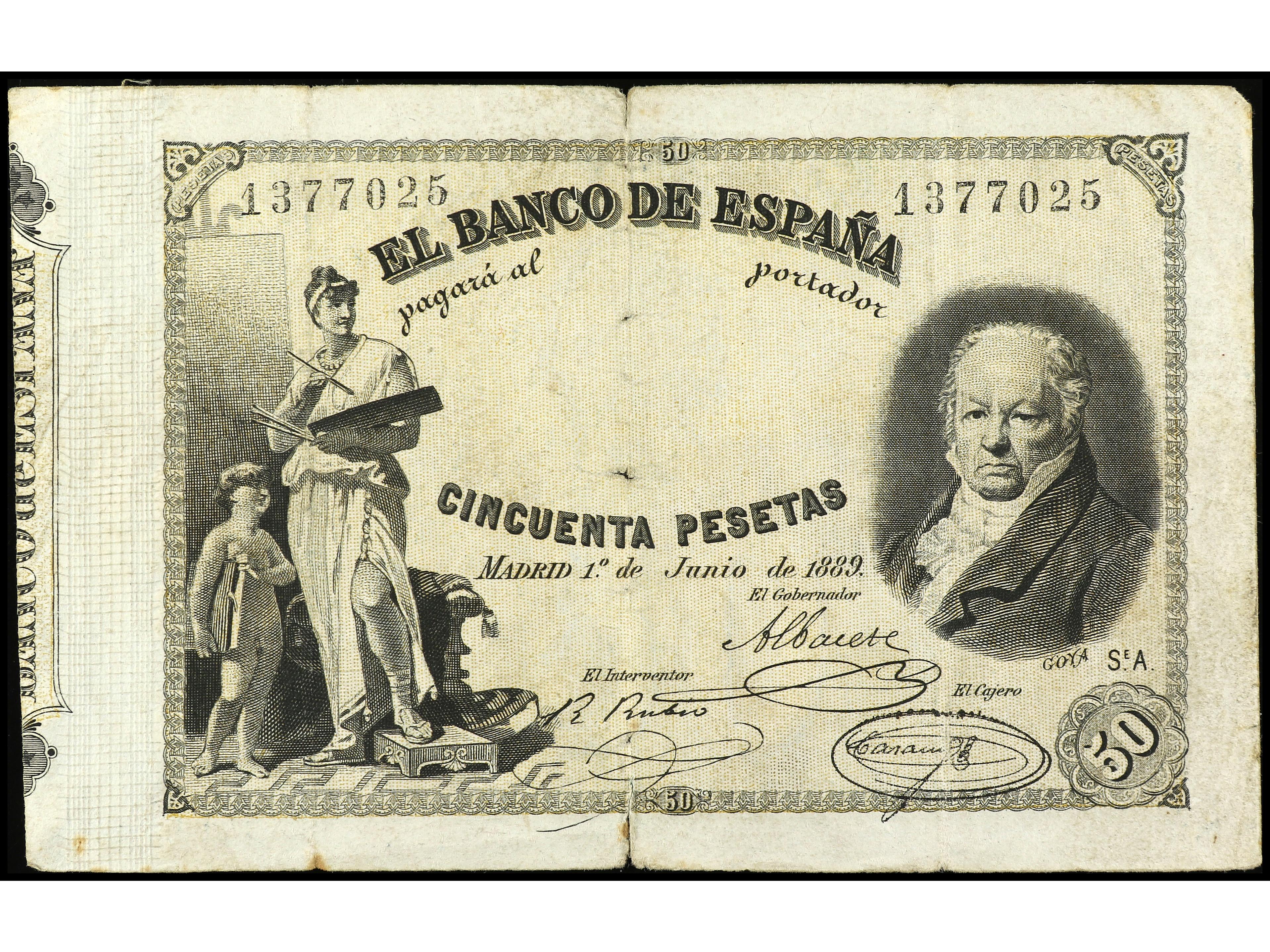50 Pesetas. 1 Junio 1889. Goya. (Roturas y manchitas). RARO. Ed-298. BC+. (Image1) (Image2)