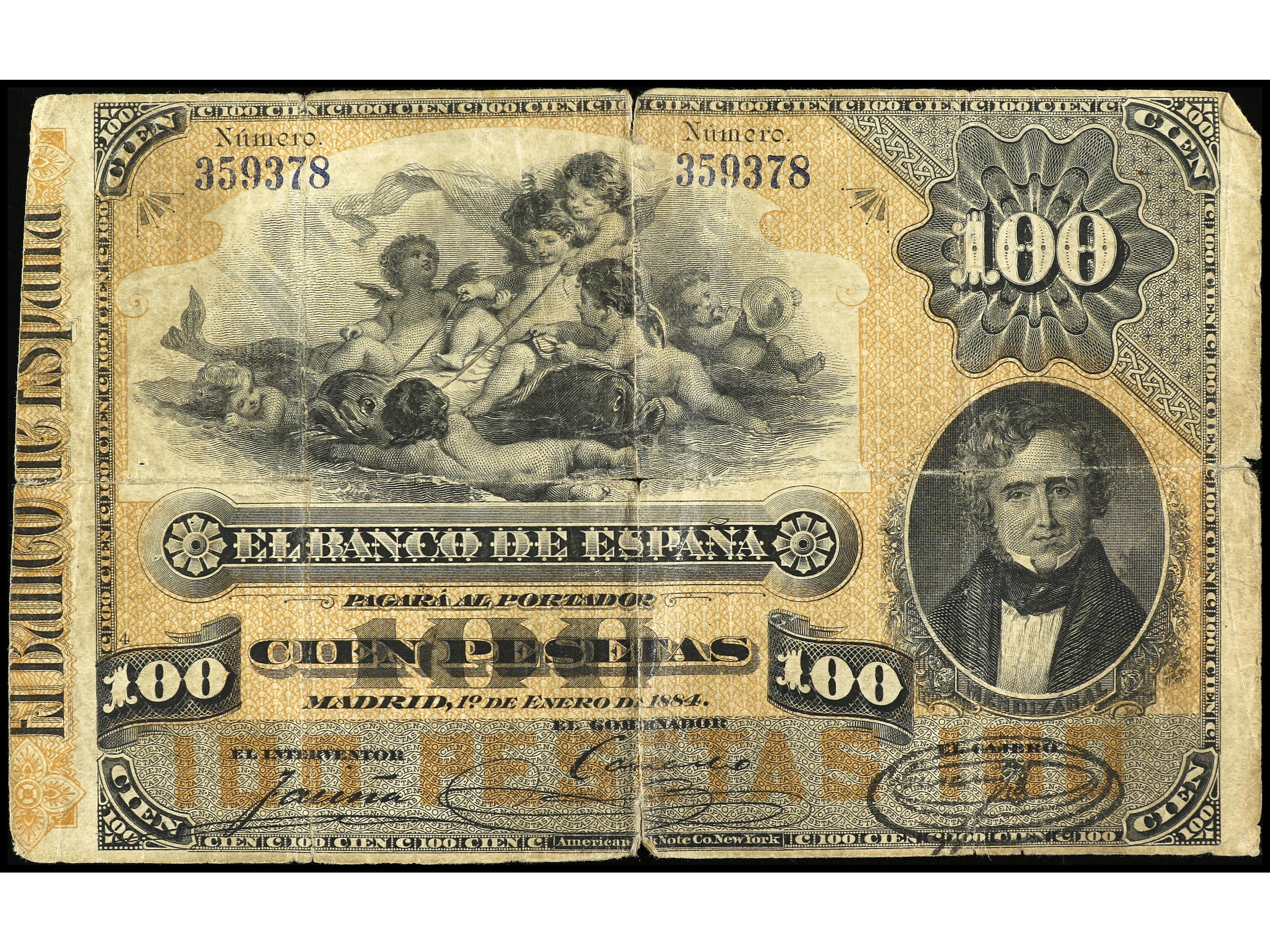 100 Pesetas. 1 Enero 1884. Mendizábal. (Roturas). RARO. Ed-284. BC. (Image1) (Image2)