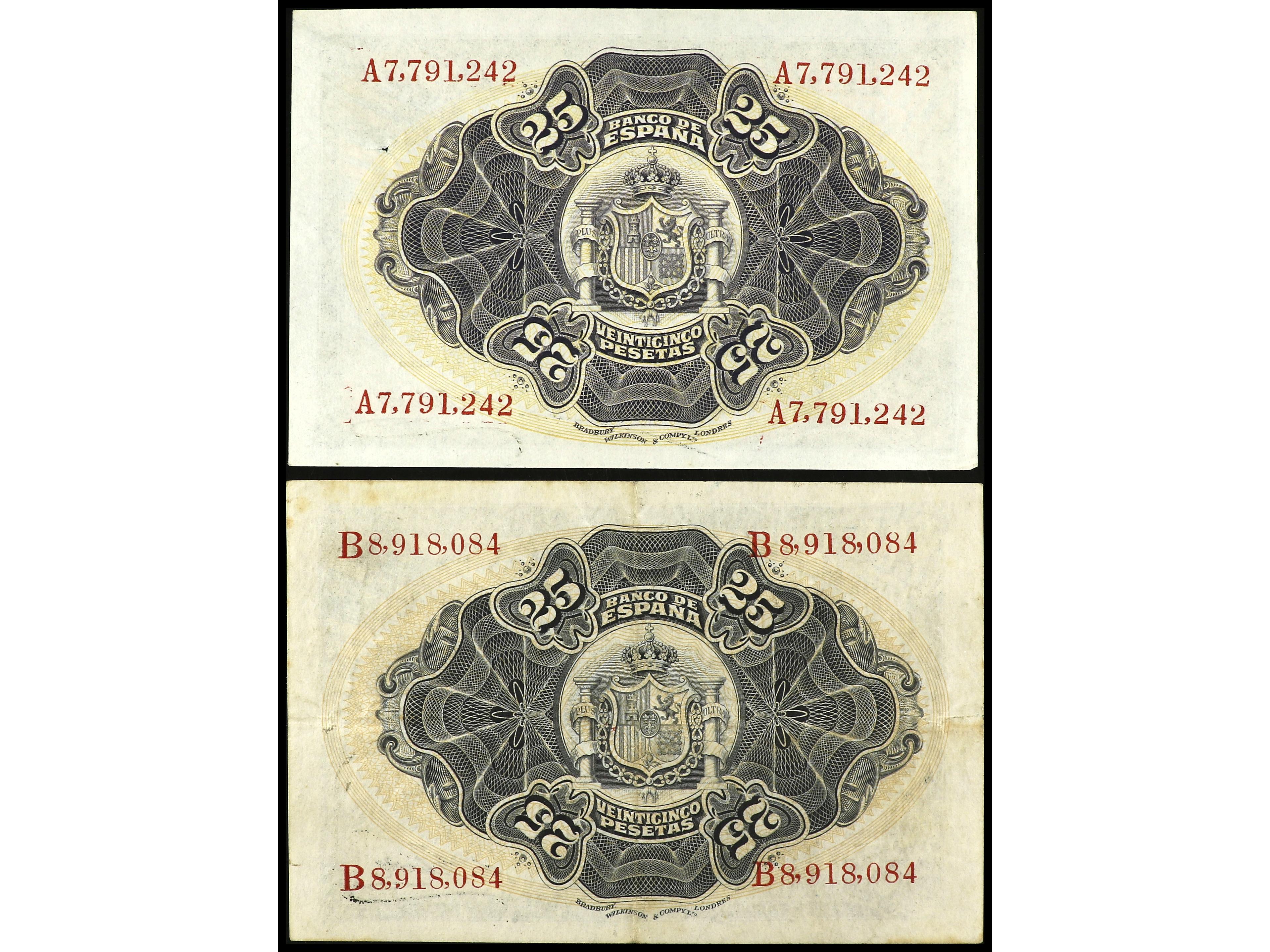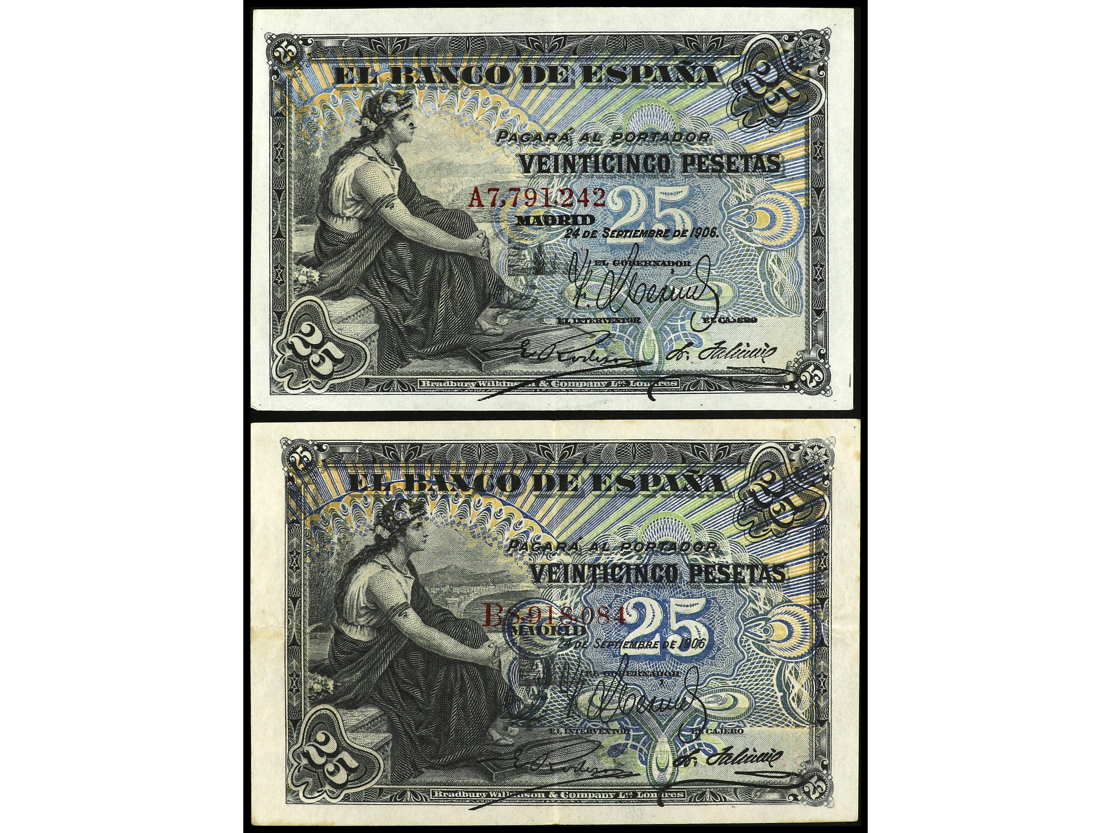 Lote 2 billetes 25 Pesetas. 24 Septiembre 1906. Serie A y B. (Puntos de grapa). Ed-314a. MBC+ y EBC-. (Image1) (Image2)