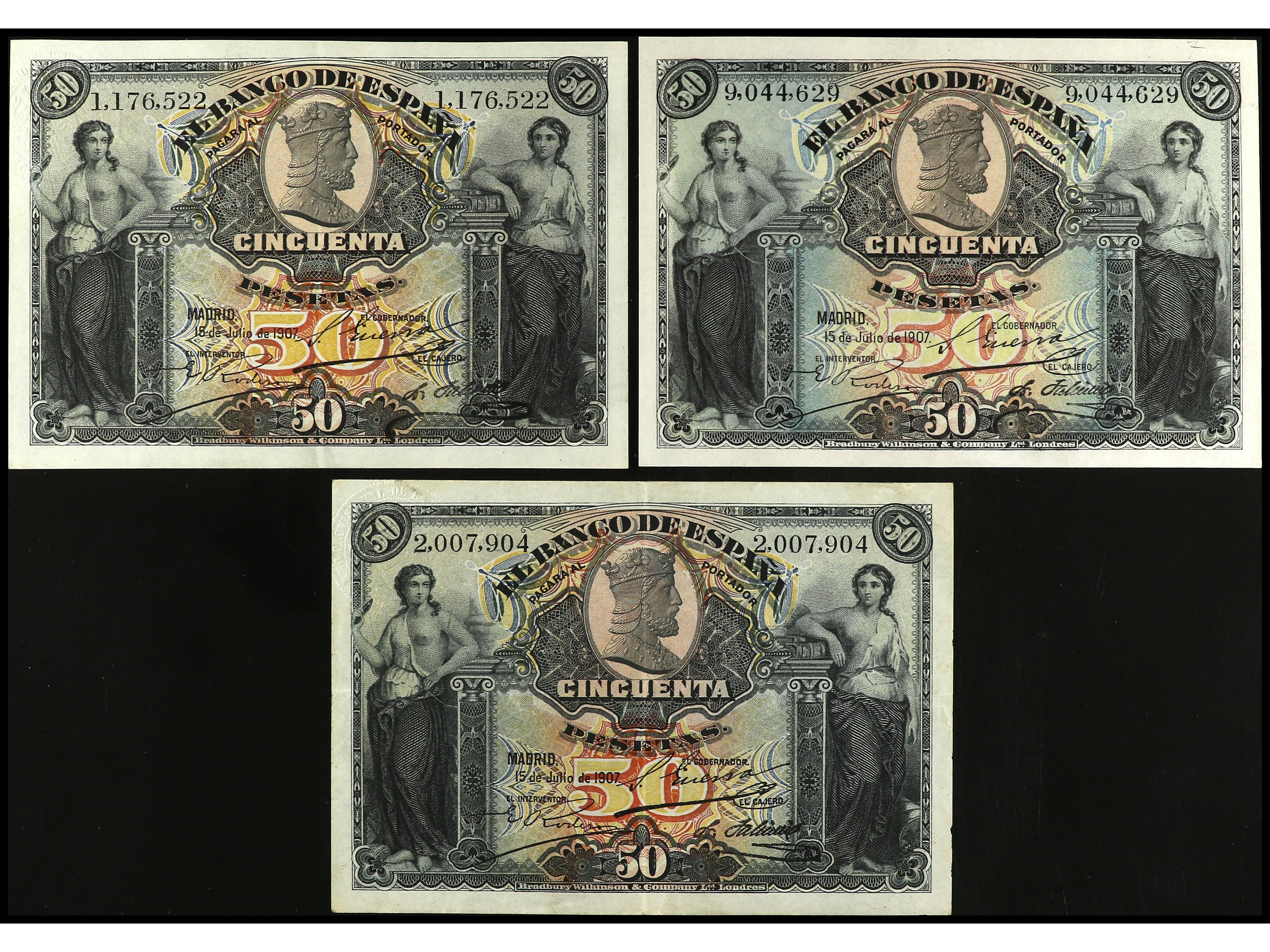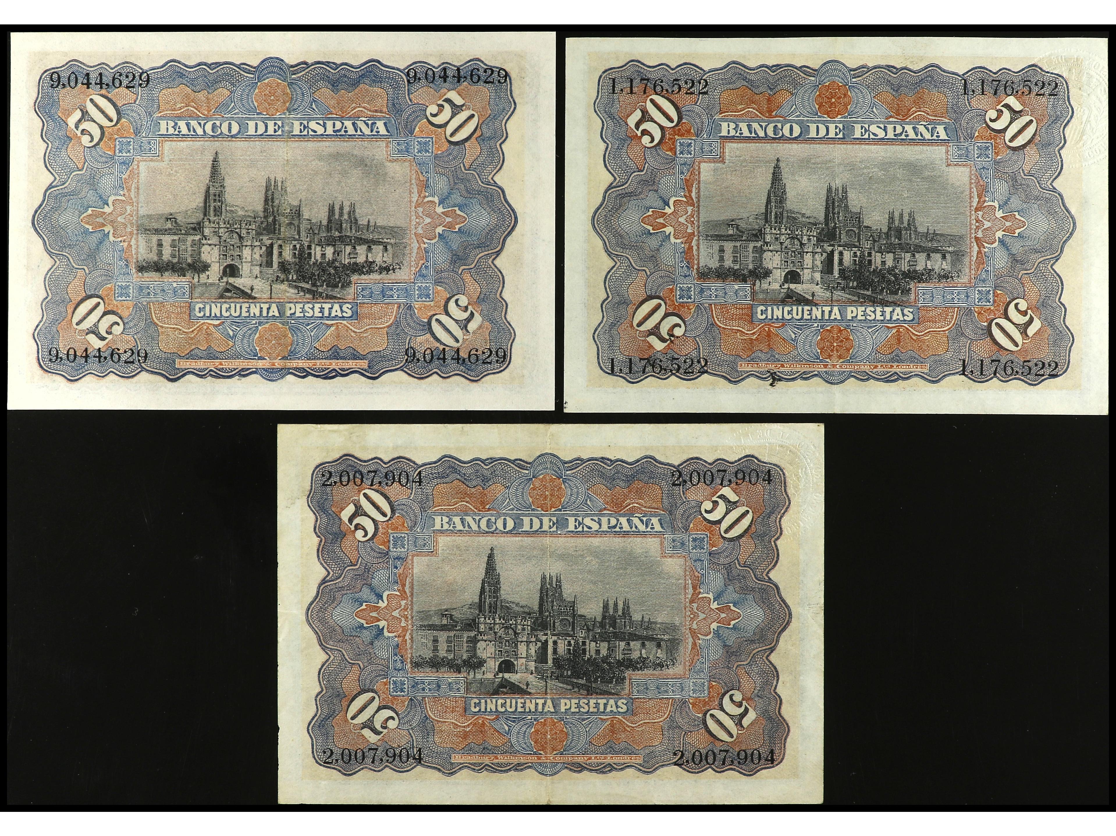 Lote 3 billetes 50 Pesetas. 15 Julio 1907. Catedral de Burgos. Dos con sello en seco GOBIERNO PROVISIONAL. Ed-319, 339. MBC+.