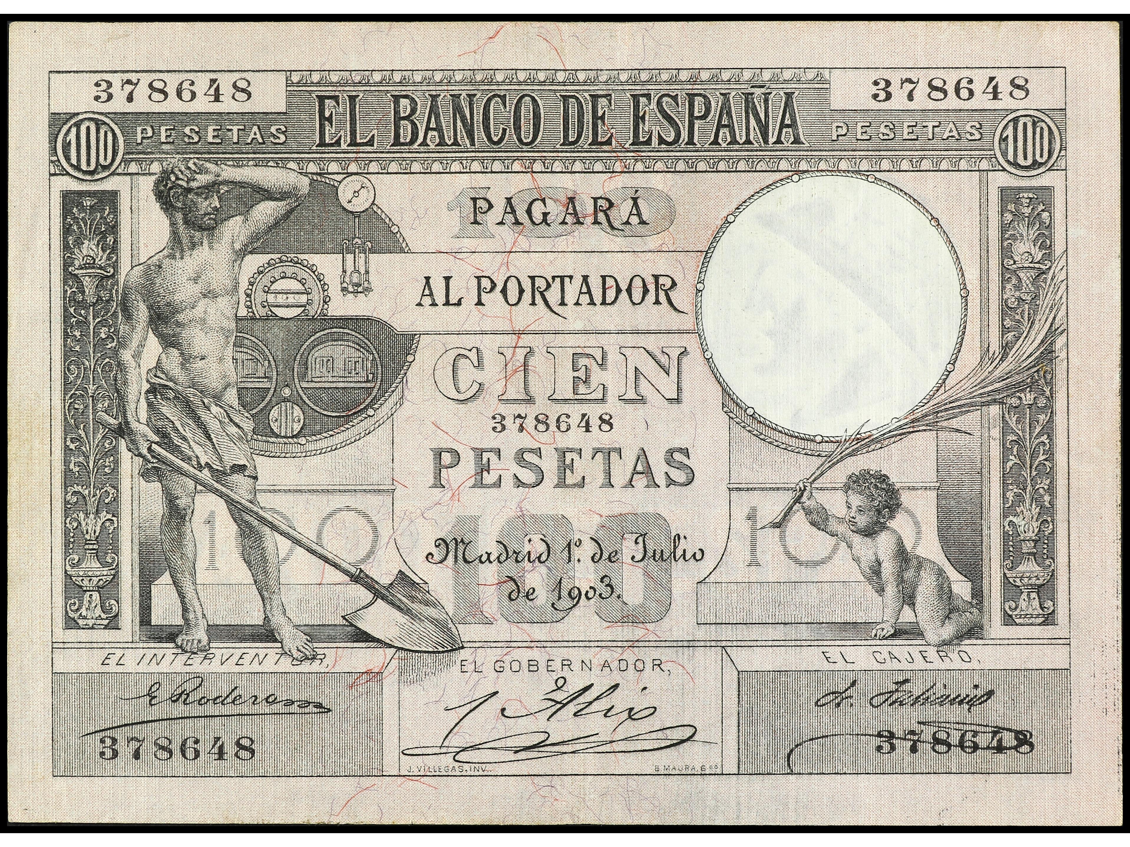 100 Pesetas. 1 Julio 1903. Fogonero. MUY RARO. Ed-310; FR y JA-147; LB-94. MBC+. (Image1) (Image2)