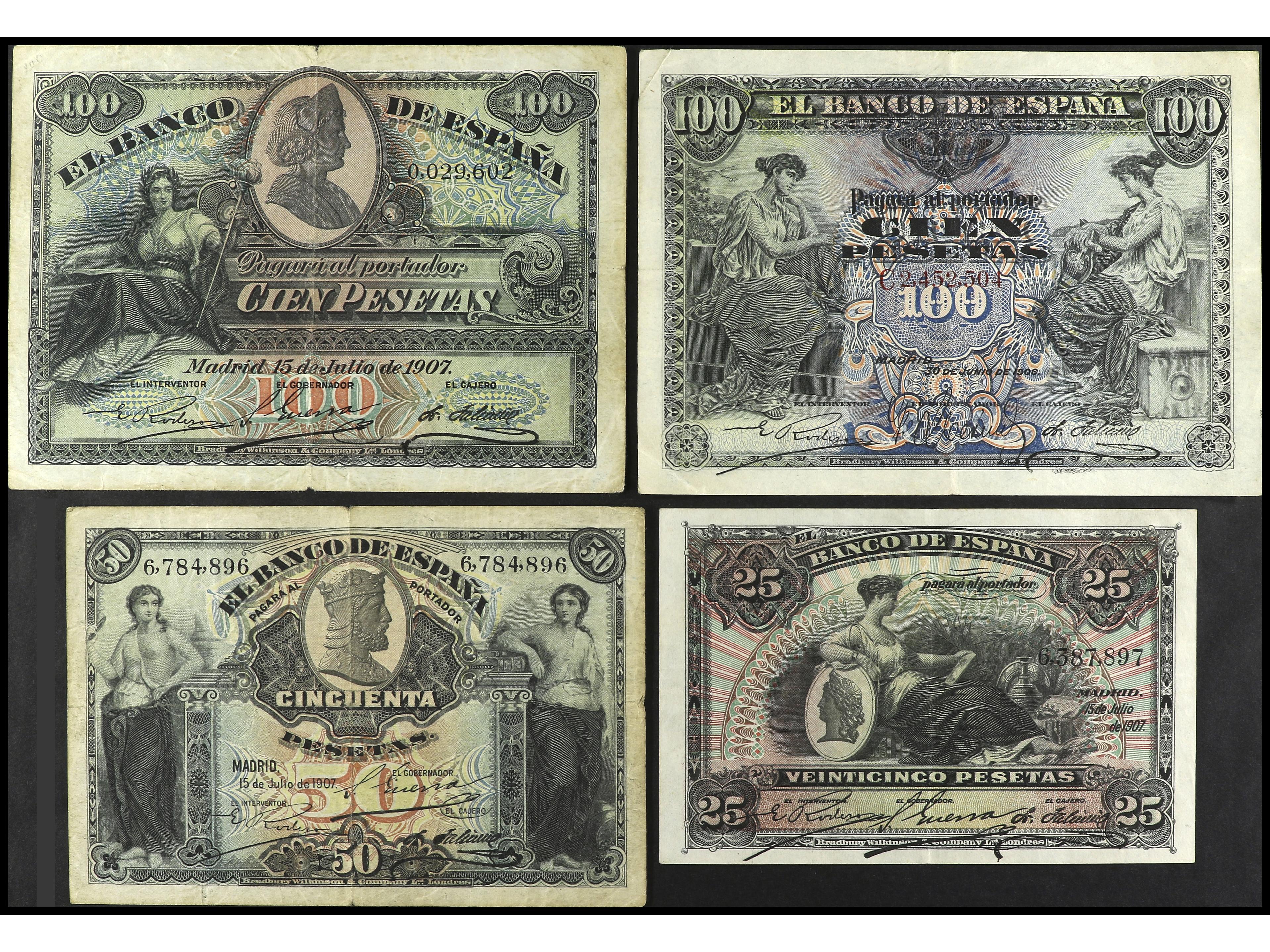 Lote 4 billetes 25, 50 y 100 Pesetas (2). 1906, 1907. Ed-313a, 314, 319, 320. MBC- a MBC+. (Image1)