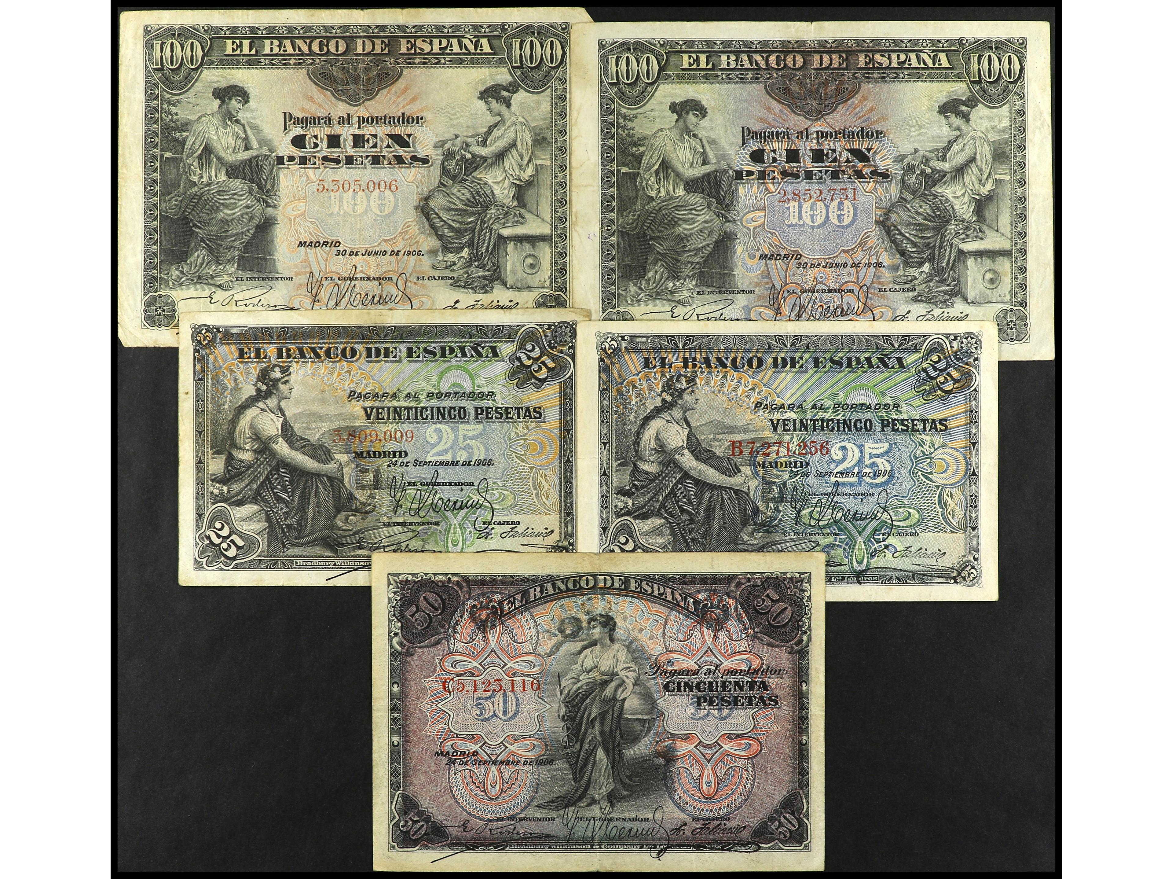 Lote 5 billetes 25 (2), 50, 100 Pesetas (2). 1906. Ed-313 (2), 314, 314a, 315a. MBC- a MBC. (Image1)