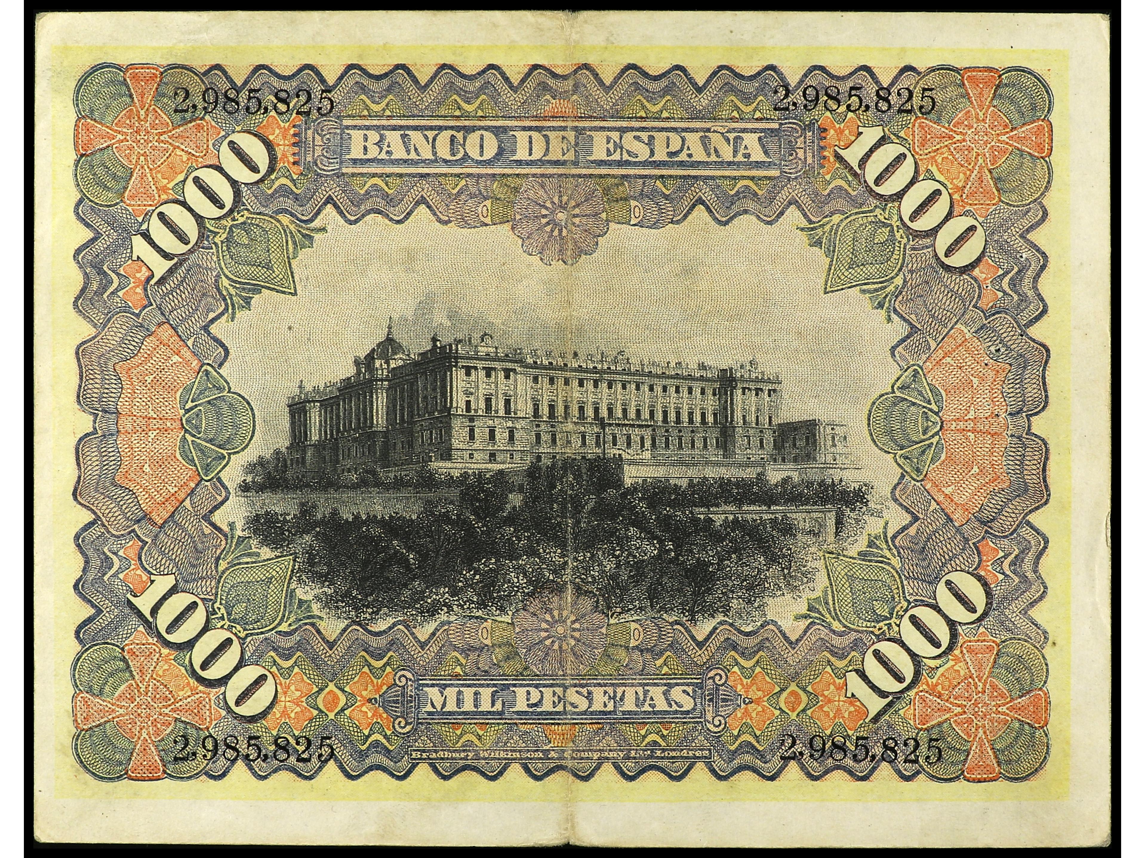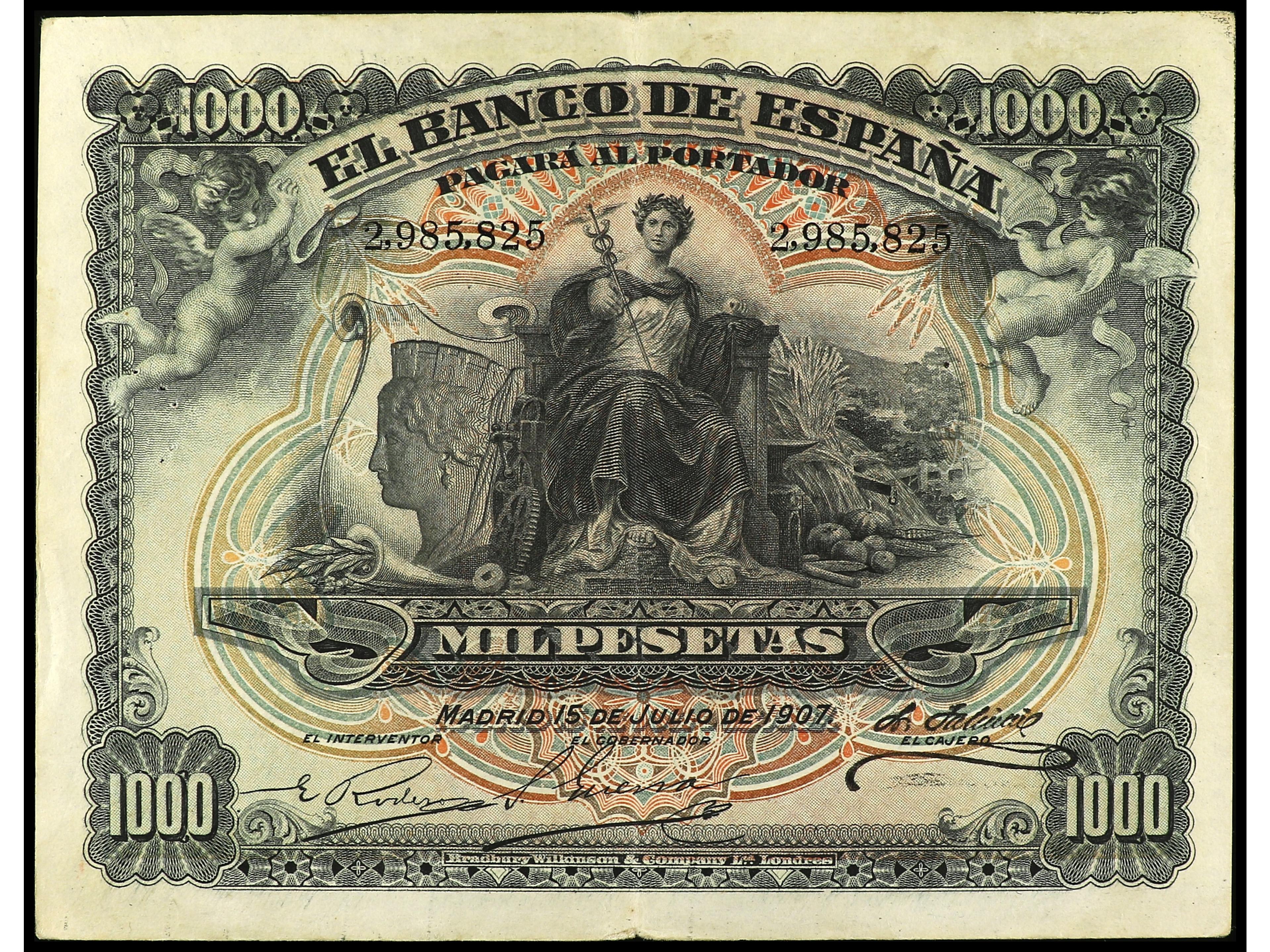 1.000 Pesetas. 15 julio 1907. Palacio Real de Madrid. (Puntos de aguja y pequeñas roturas). ESCASO. Ed-322. MBC-. (Image1) (Image2)