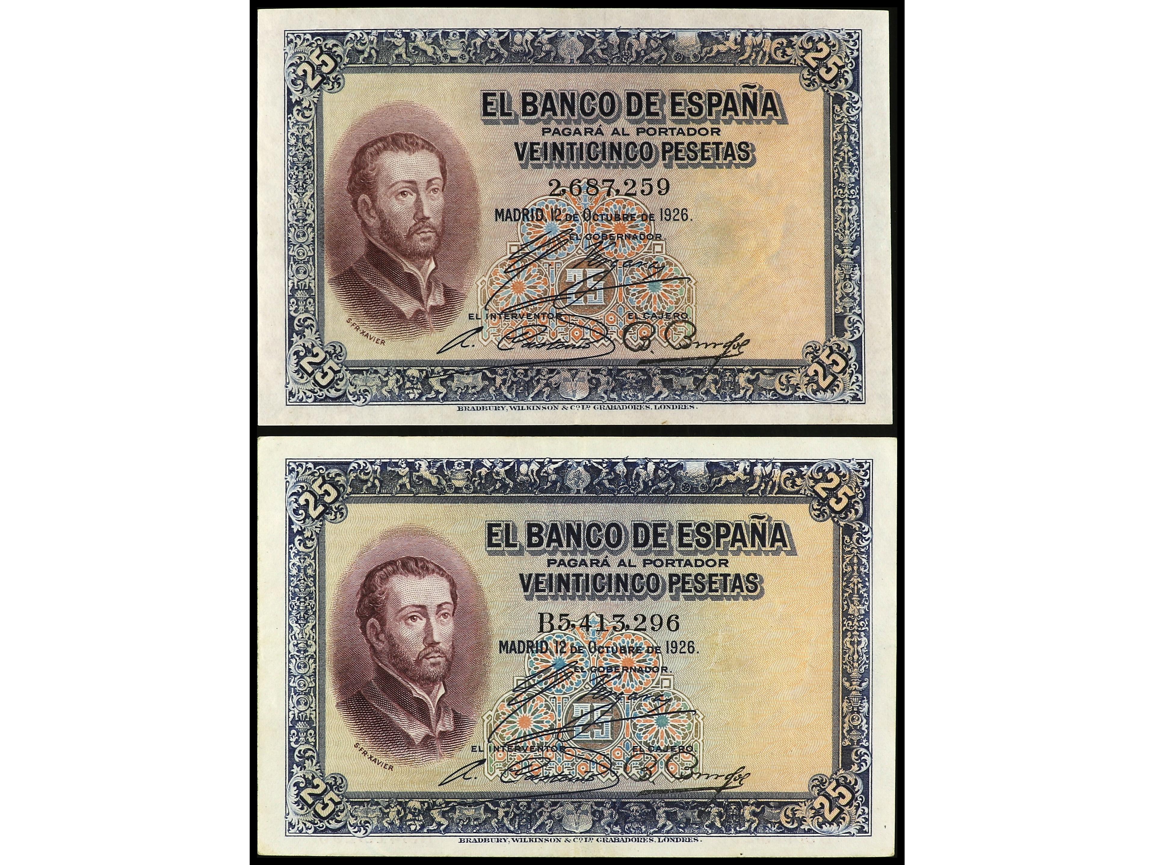 Lote 2 billetes 25 Pesetas. 12 Octubre 1926. San Francisco Javier. Sin Serie y Serie B. Ed-325, 325a. MBC+. (Image1) (Image2)