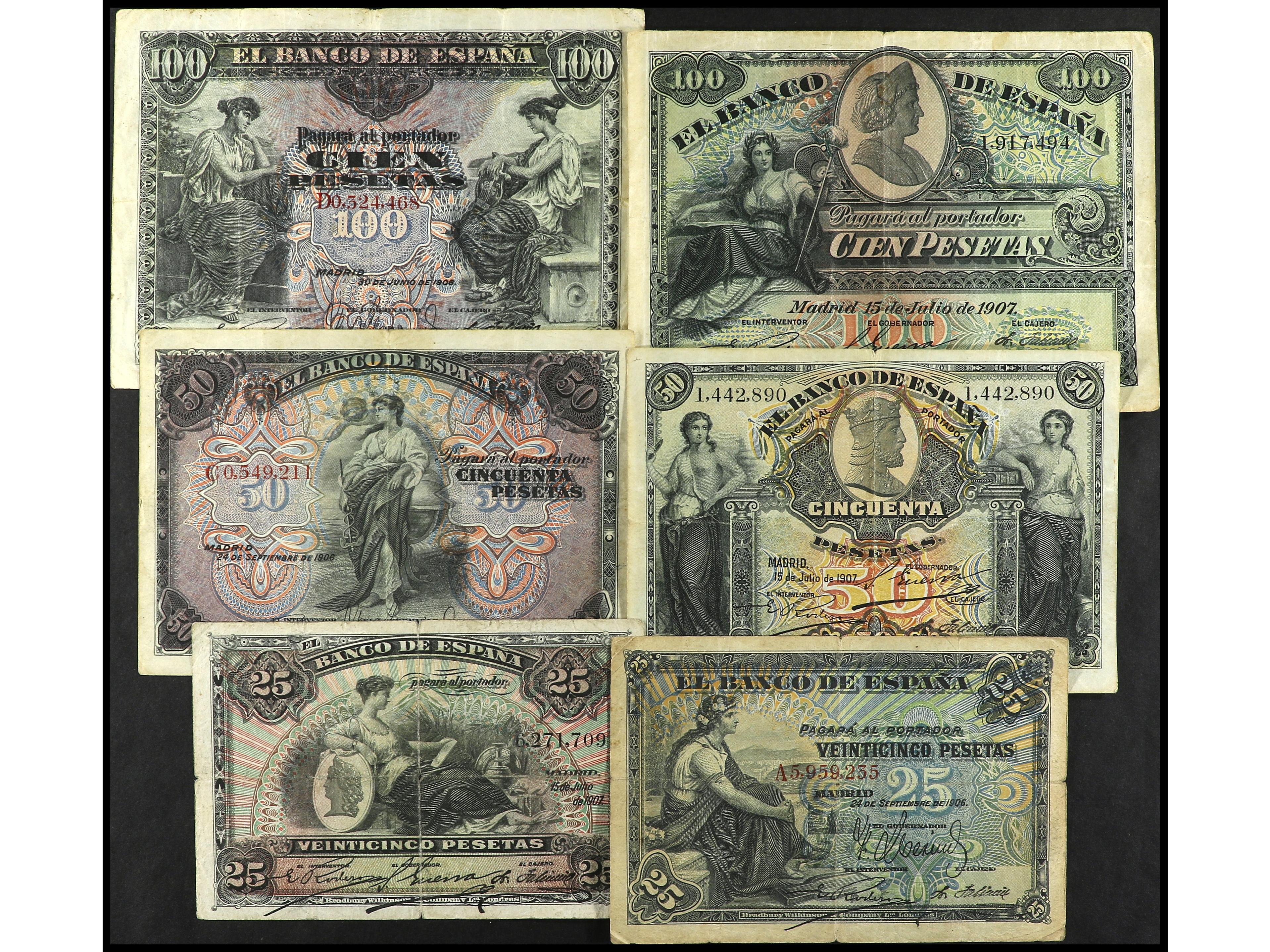Lote 6 billetes 25 (2), 50 (2), 100 Pesetas (2). 1906 a 1907. A EXAMINAR. Ed-313, 314a, 315a, 318, 319. MBC- a MBC. (Image1)