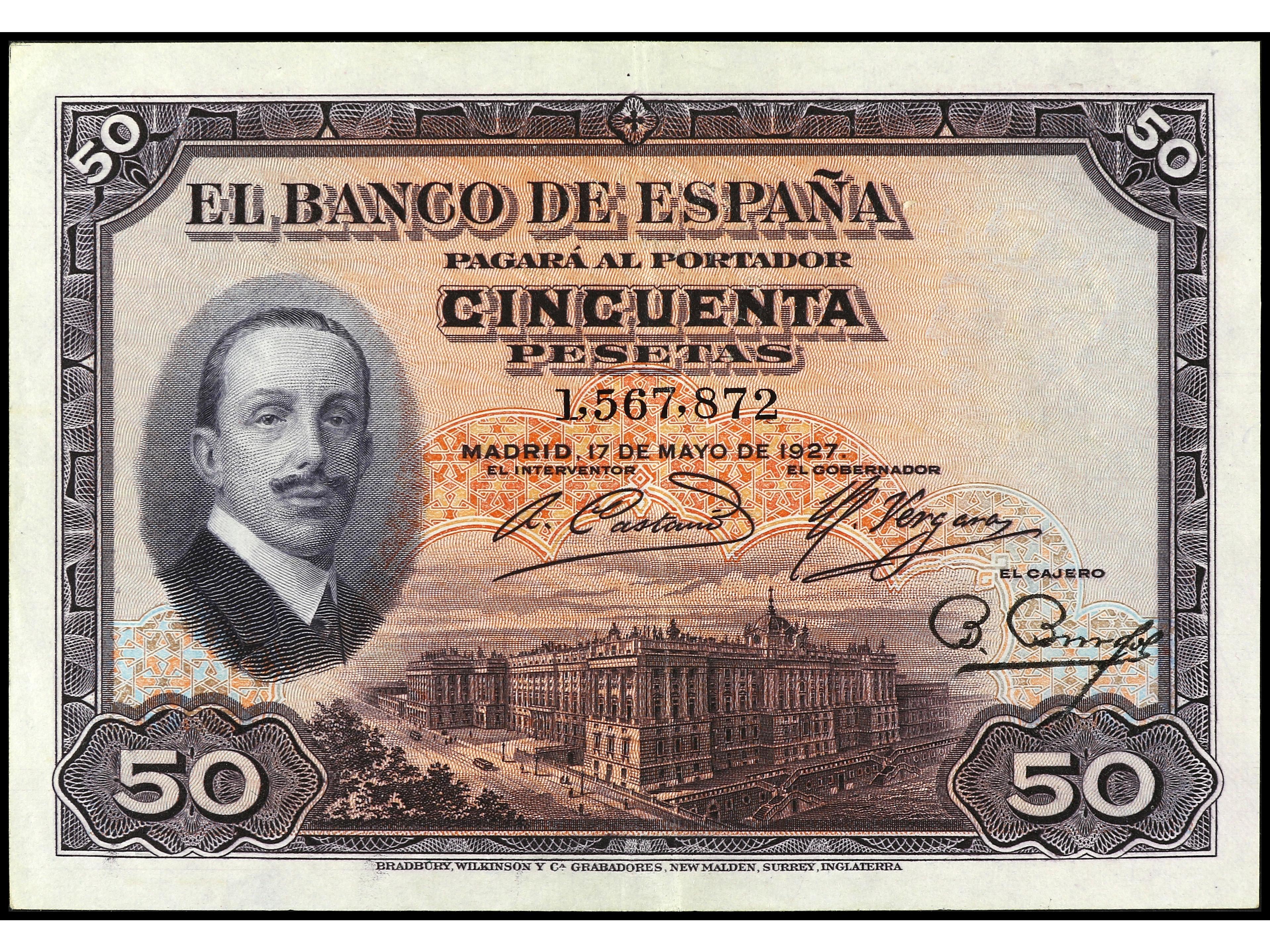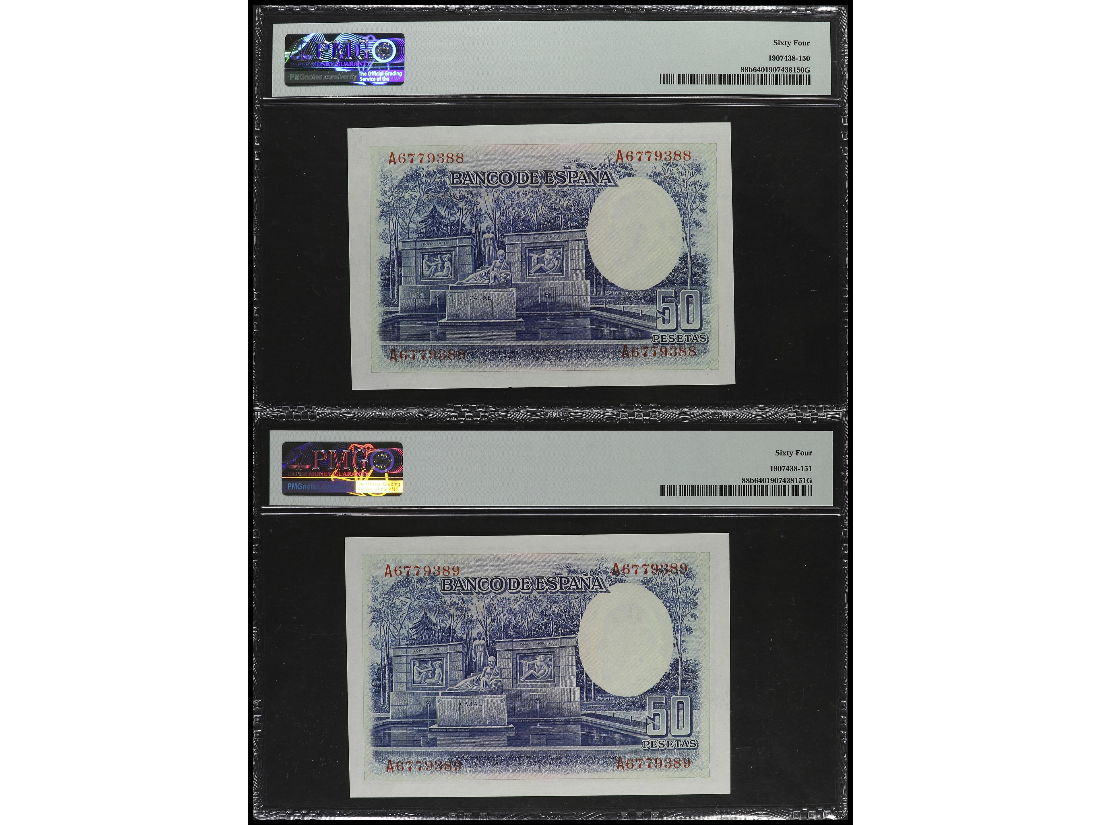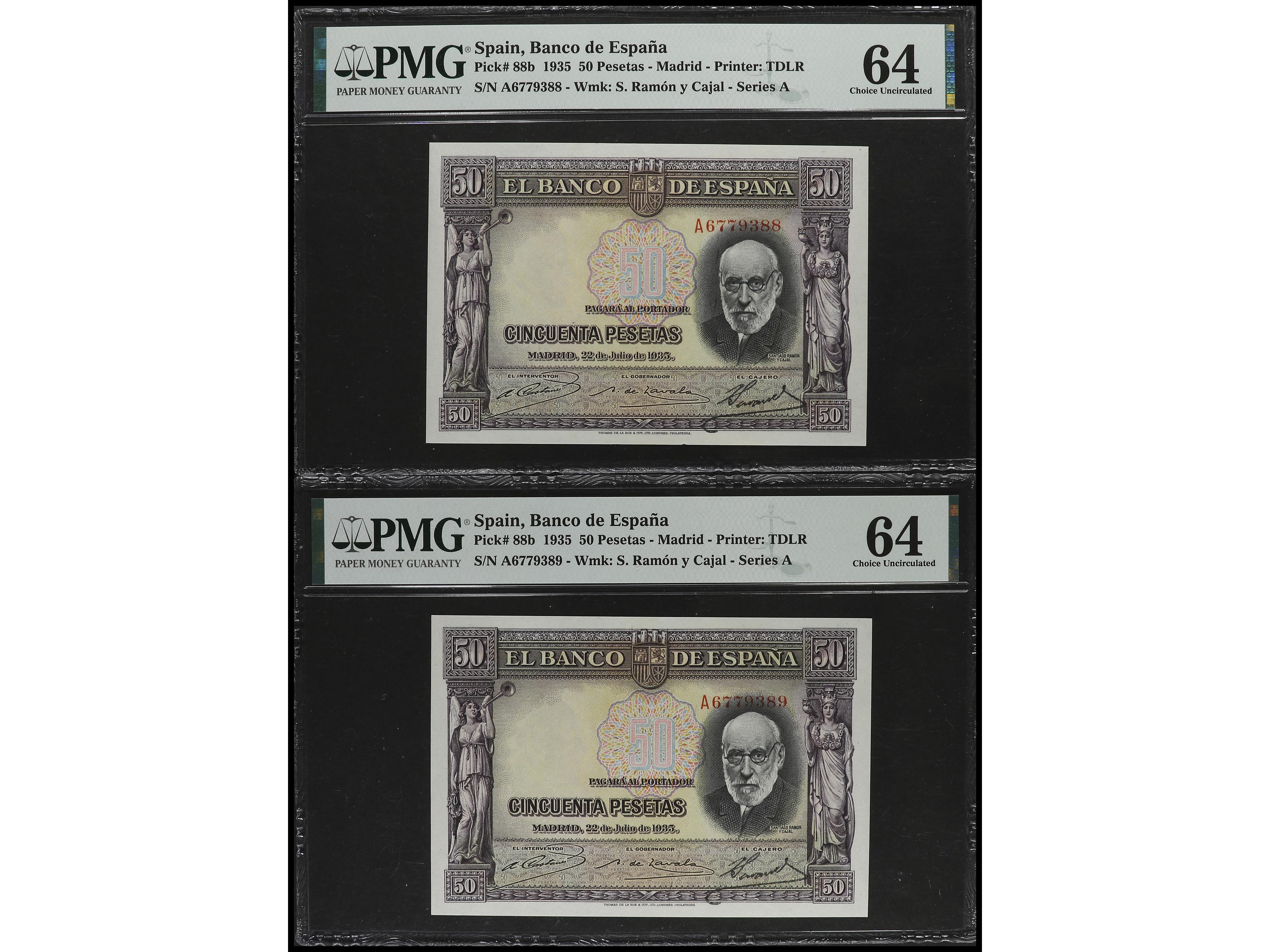 Lote 2 billetes 50 Pesetas. 22 de Julio de 1935. Precintado y garantizado por PMG como 64 CHOICE ABOUT UNCIRCULATED (nº 1907438-150 / 1907438-151). Ramón y Cajal. Serie A. pareja correlativa. RARO. Ed-366a. SC. (Image1) (Image2)