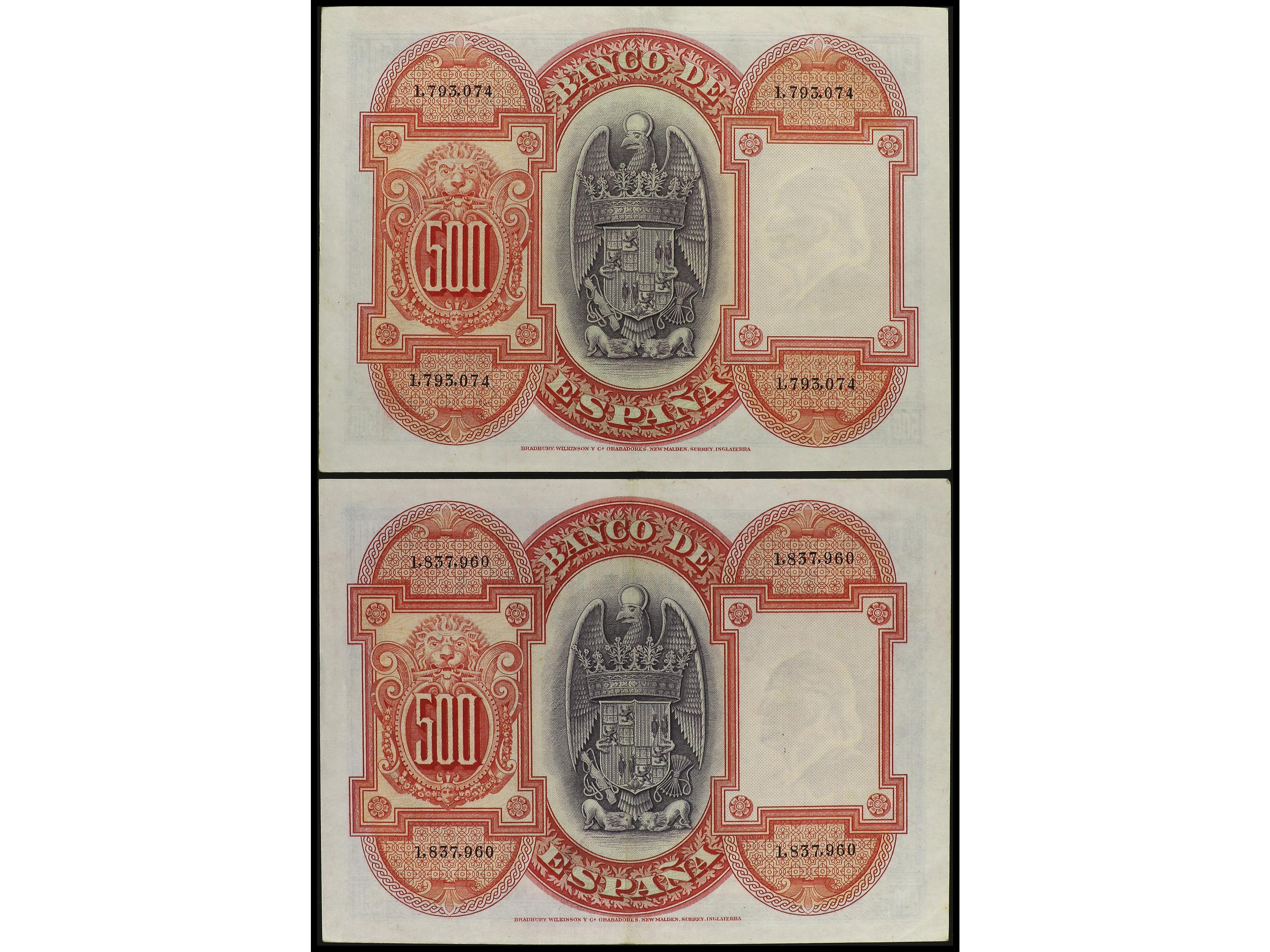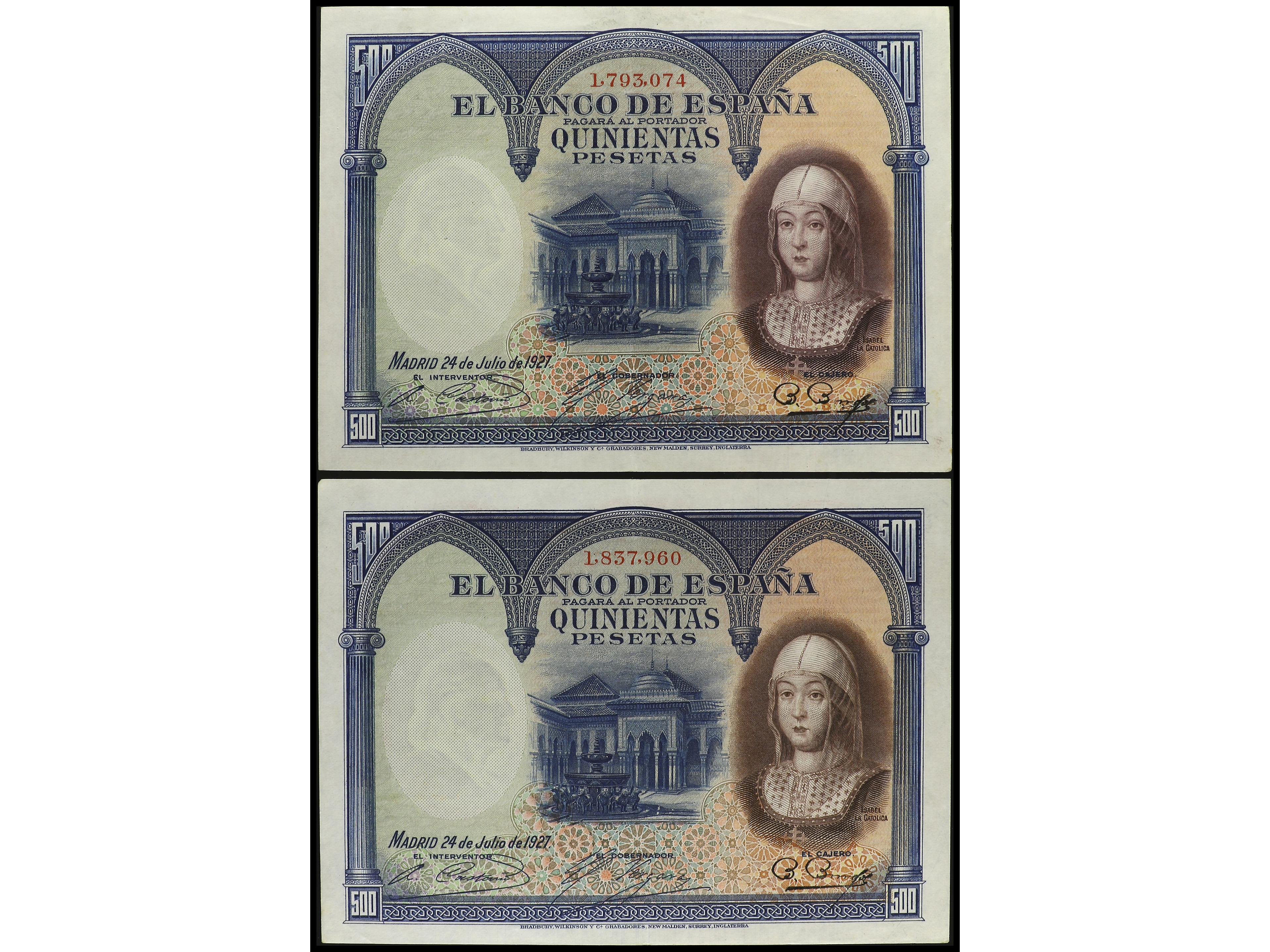 Lote 2 billetes 500 Pesetas. 24 Julio 1927. Isabel La Católica. Ed-352. MBC+. (Image1) (Image2)