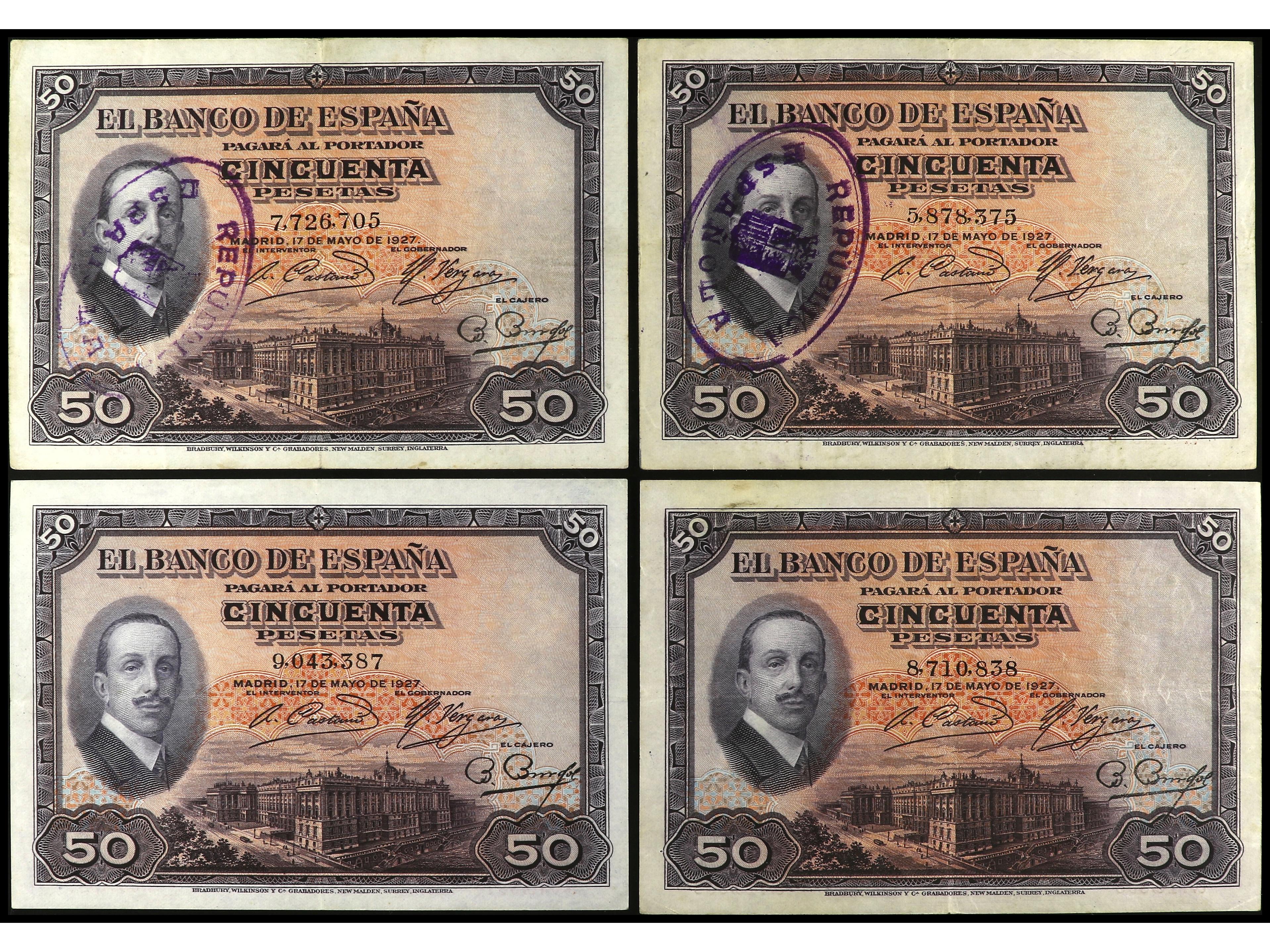 Lote 4 billetes 50 Pesetas. 15 Agosto 1928. Velázquez. Series B, C, D, E. Ed-354. EBC a SC-. (Image1)