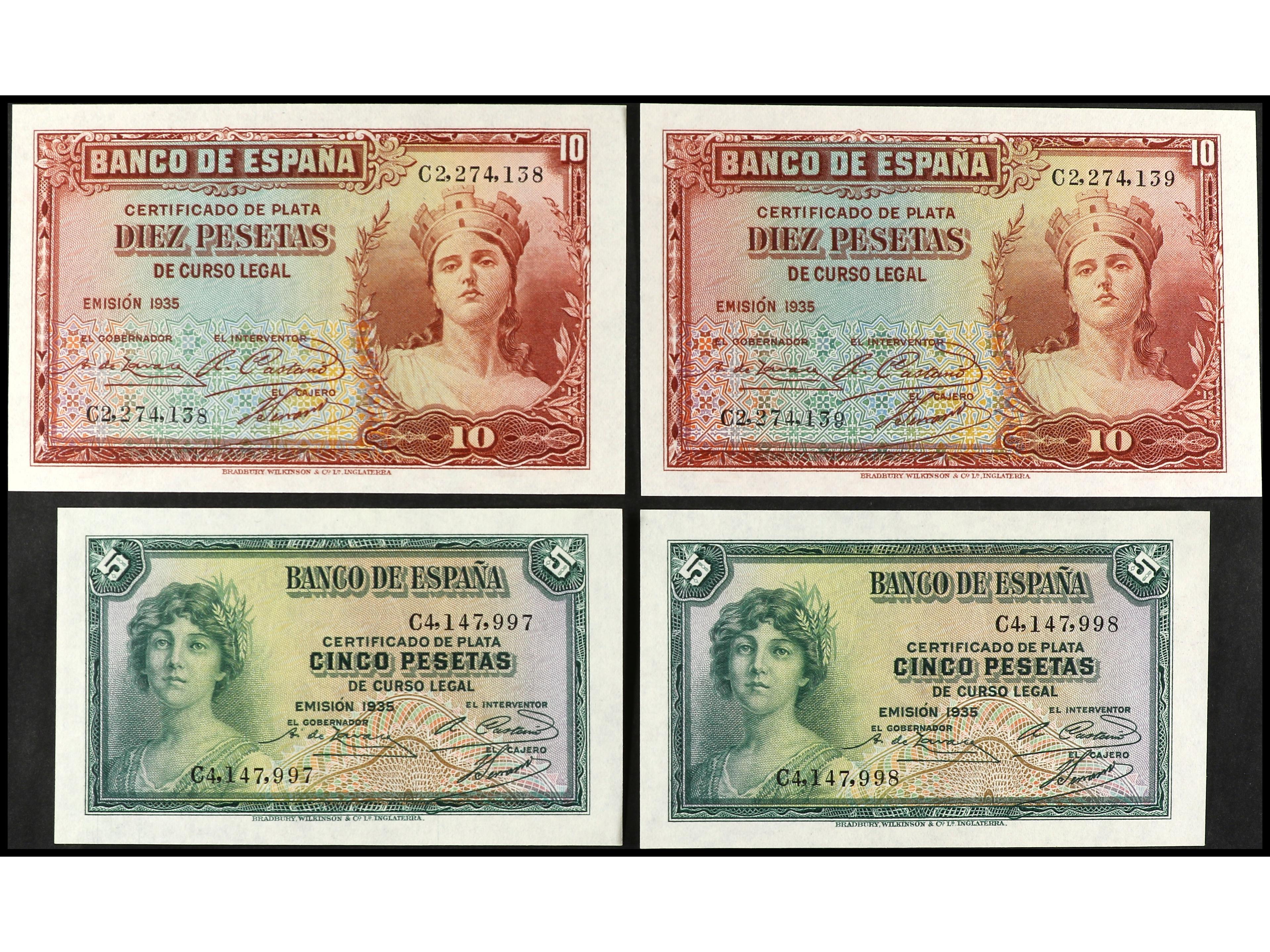 Lote 4 billetes 5 (2) y 10 Pesetas (2). 1935. Dos parejas correlativas. Ed-363, 364. EBC + y SC. (Image1)