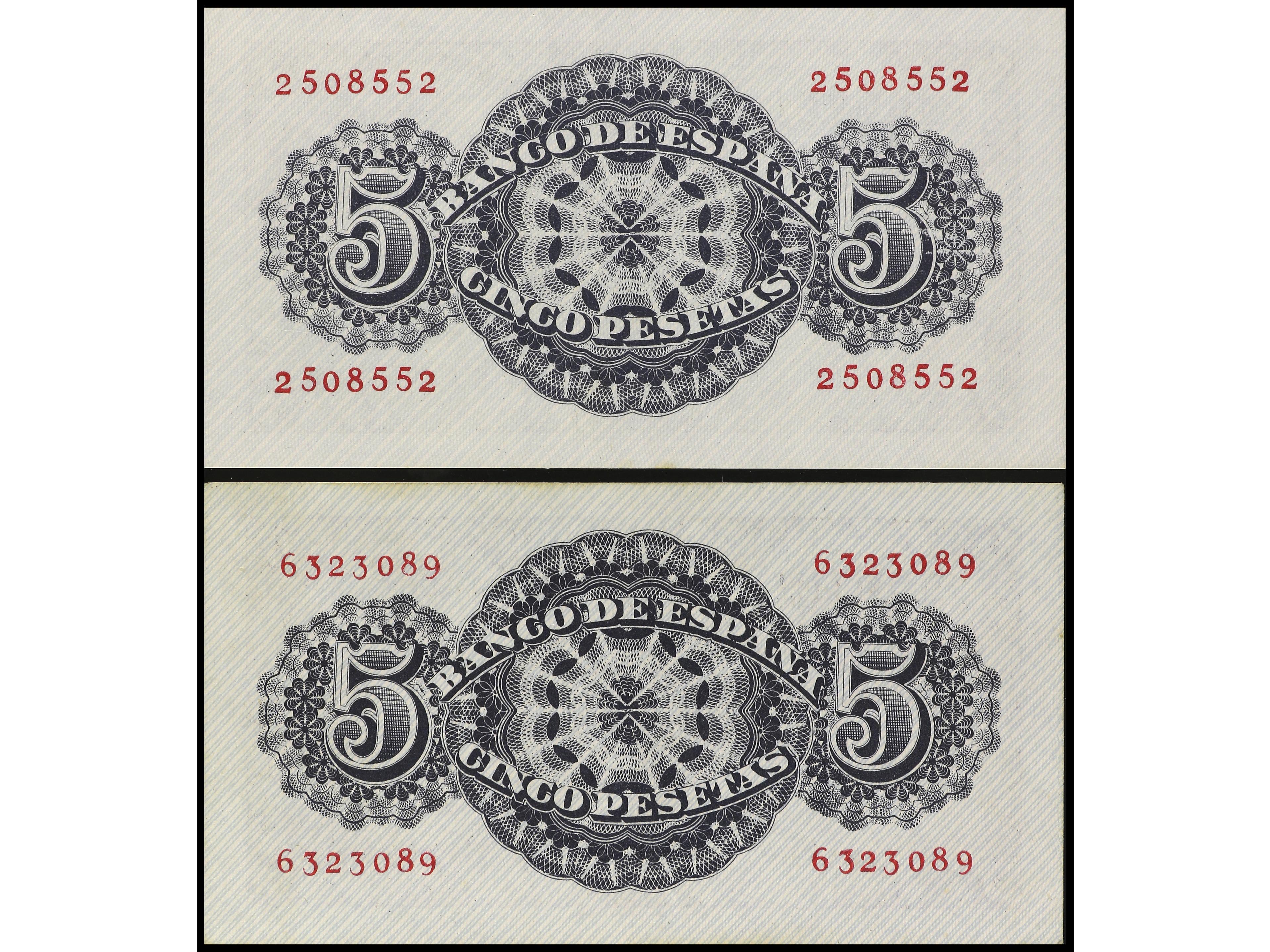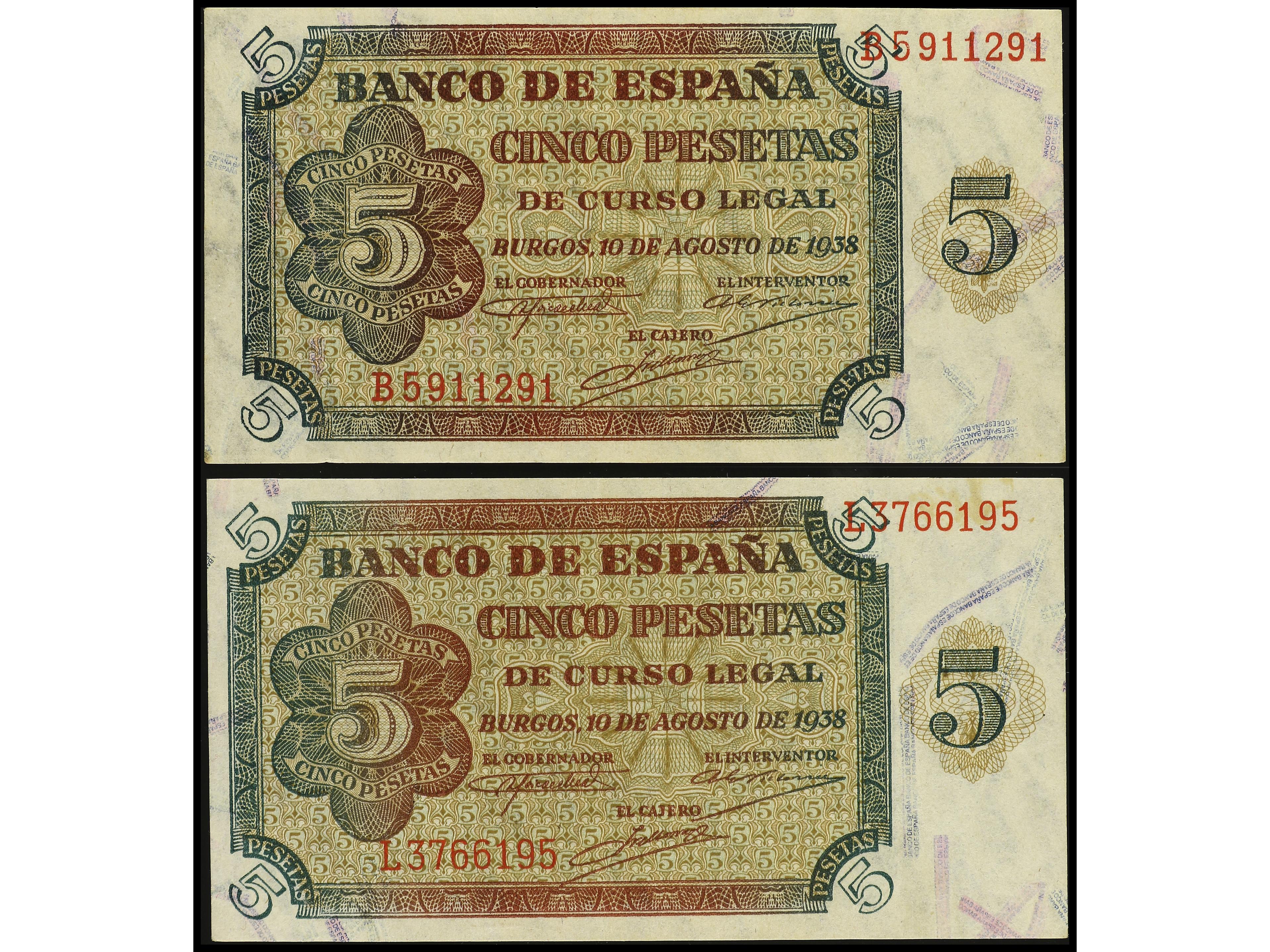 3132 imageLote 2 billetes 5 Pesetas. 10 Agosto 1938. Serie B y L. Ed-435a. EBC. (Image1) (Image2)