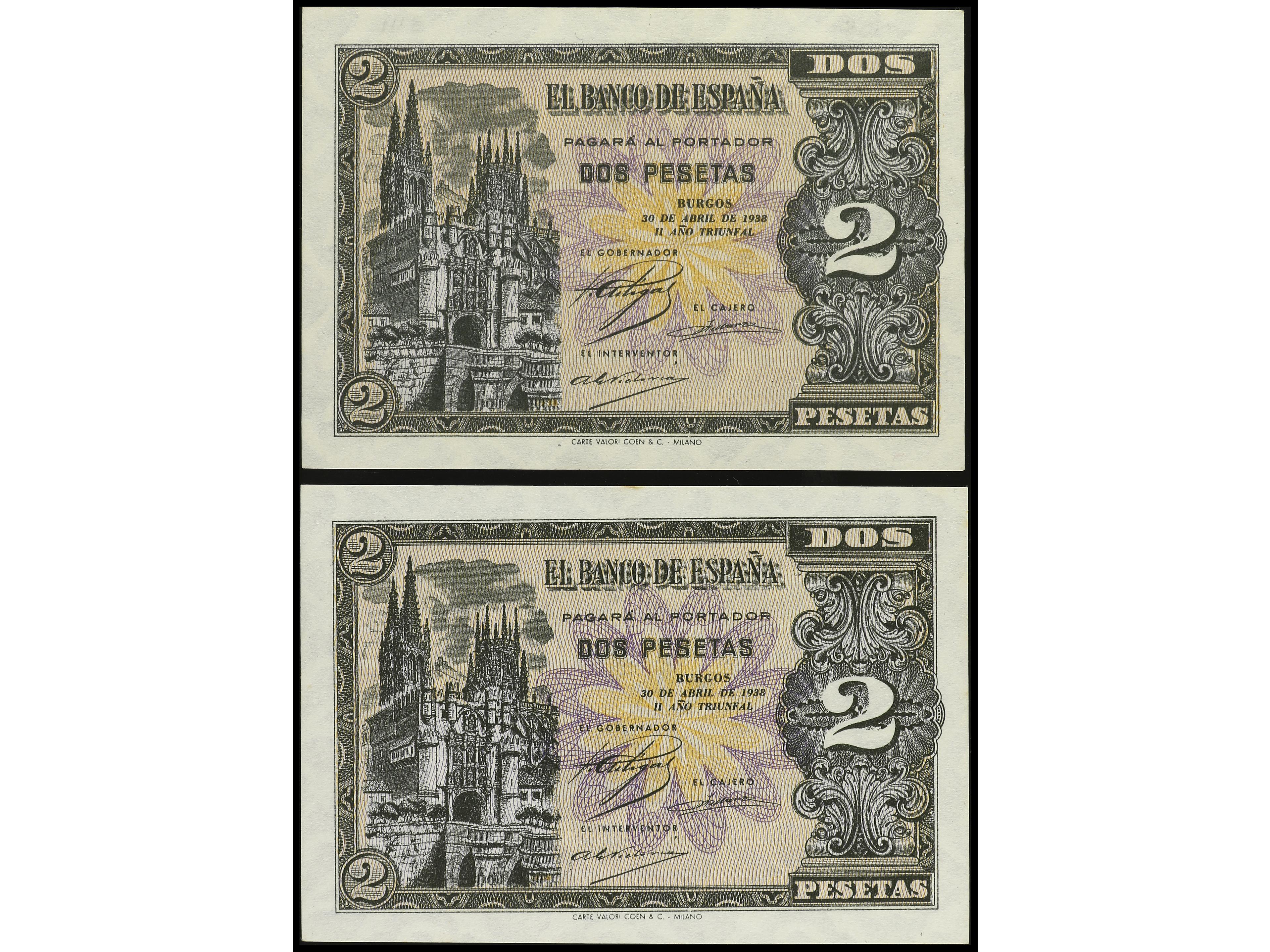 3125 imageLote 2 billetes 2 Pesetas. 30 Abril 1938. Catedral de Burgos. Serie D y N. Ed-429a, 429b. SC-. (Image1) (Image2)