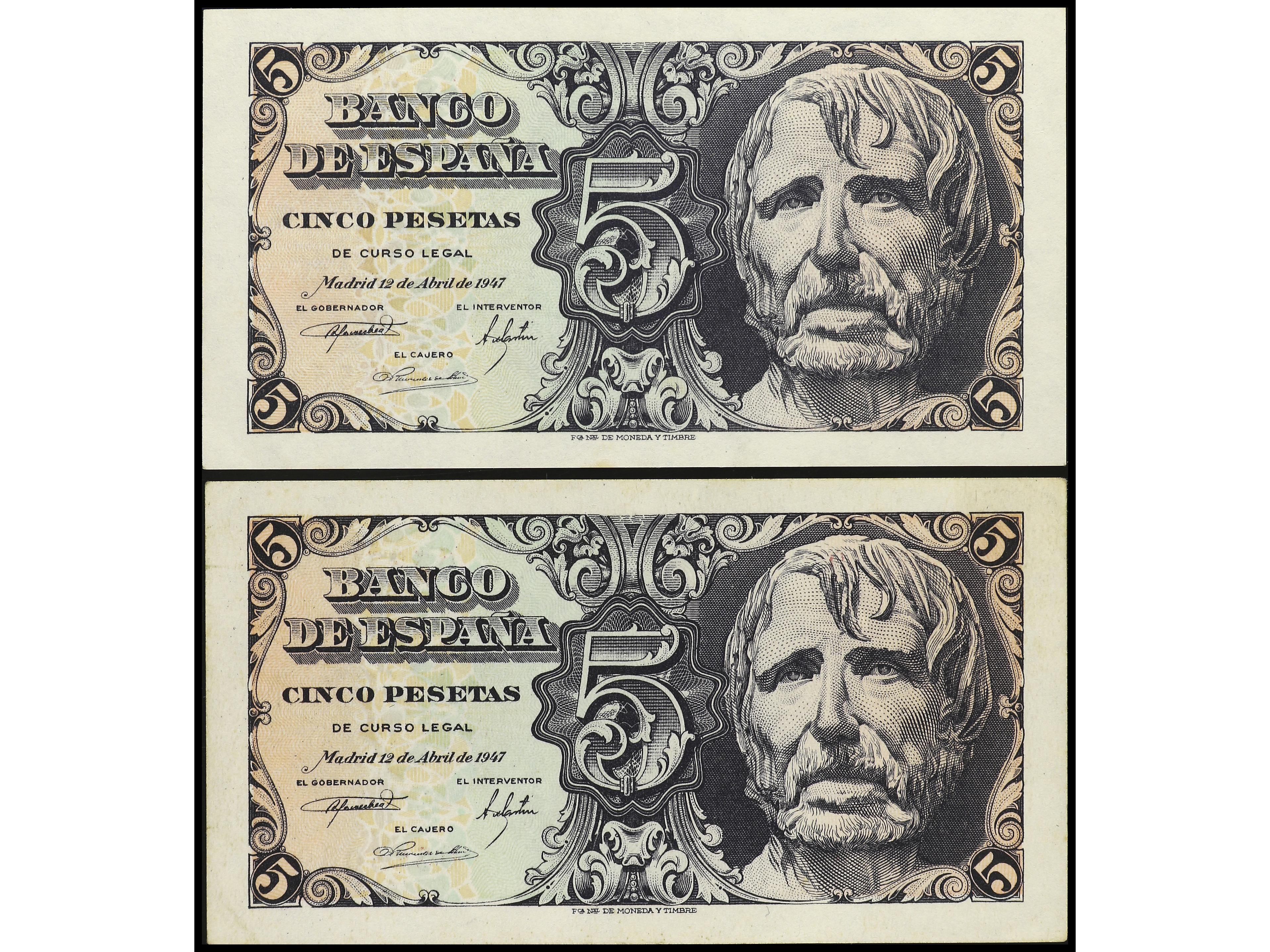3134 imageLote 2 billetes 5 Pesetas. 12 Abril 1947. Séneca. Sin serie. Ed-454. MBC+. (Image1) (Image2)