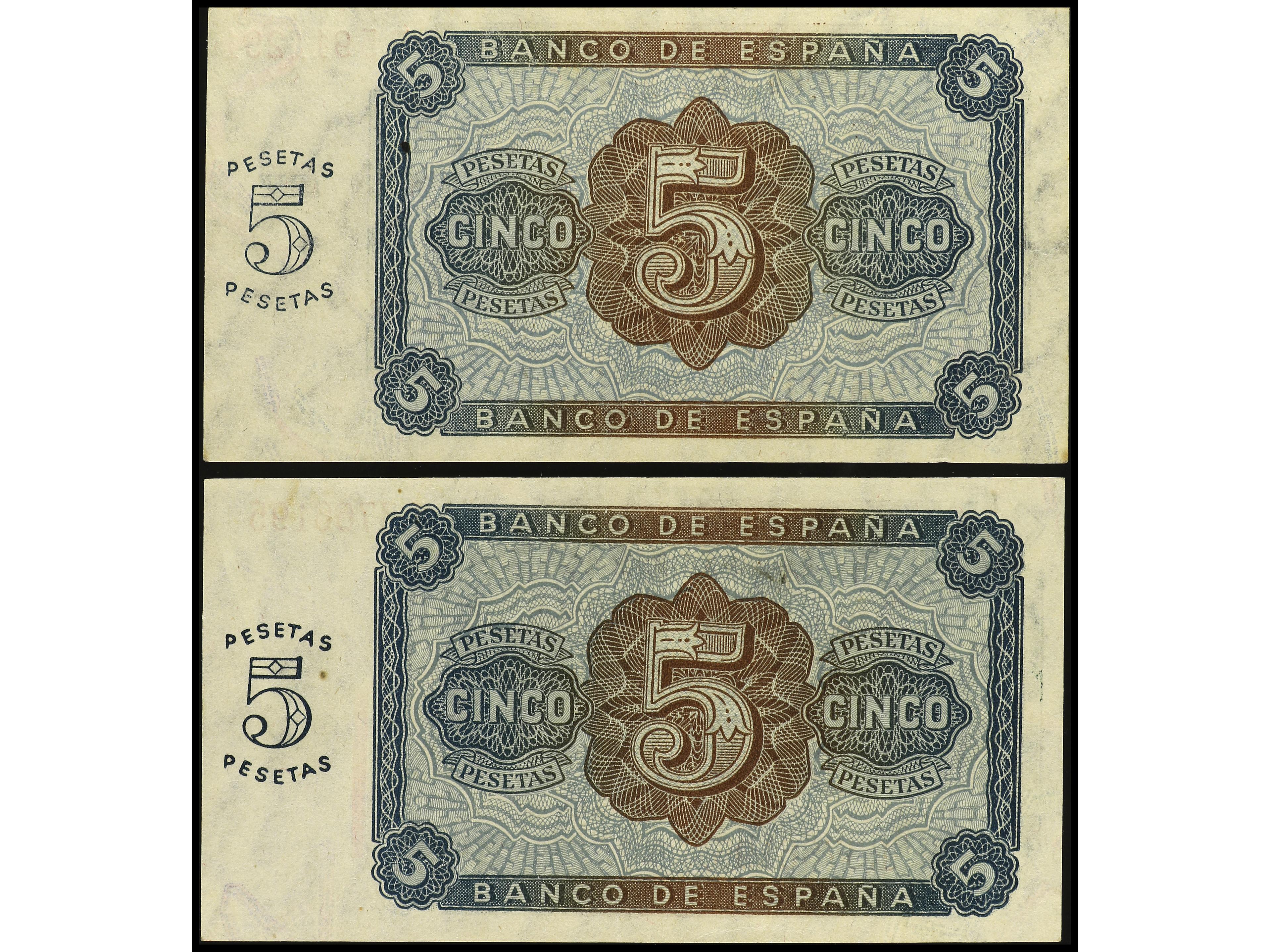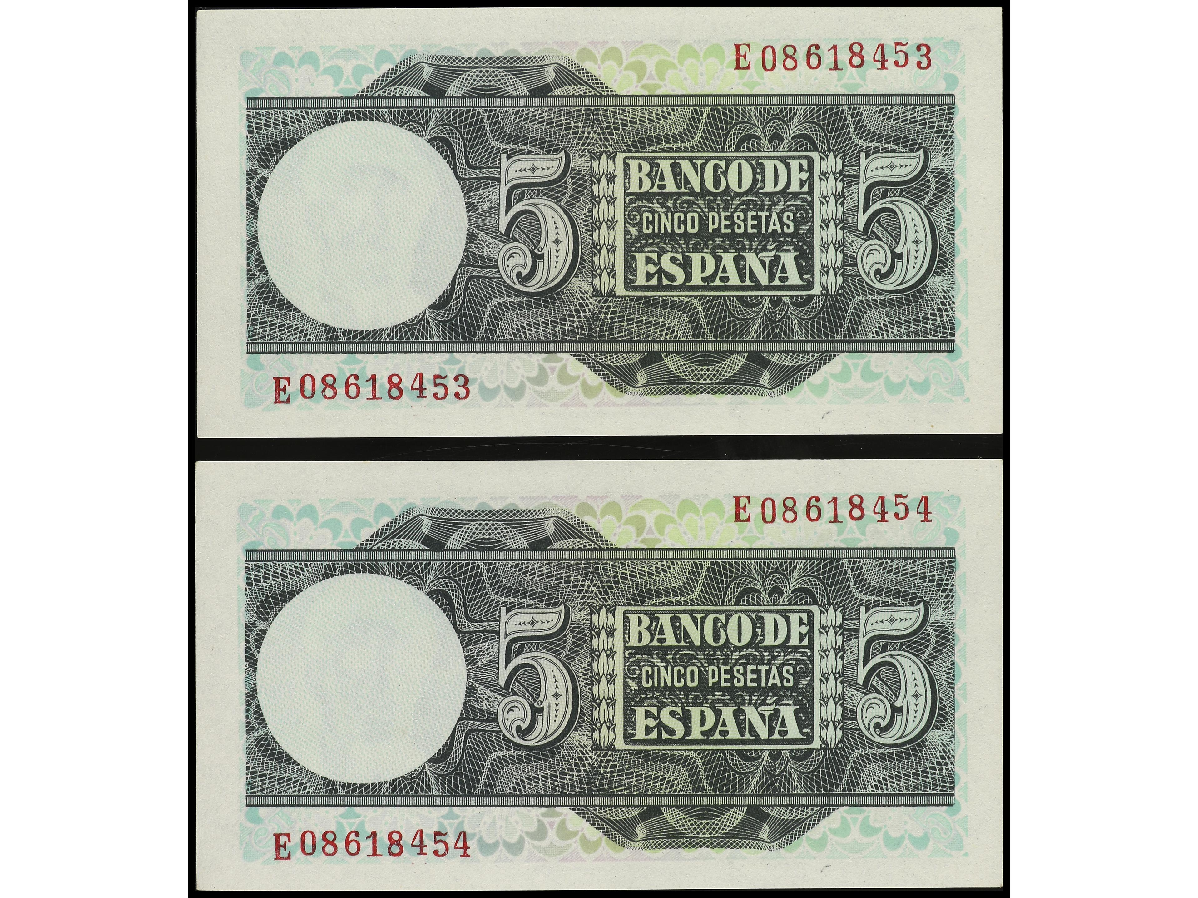 3135 imageLote 2 billetes 5 Pesetas. 15 Marzo 1948. Elcano. Serie E. Pareja correlativa. Ed-455a. SC-. (Image1) (Image2)