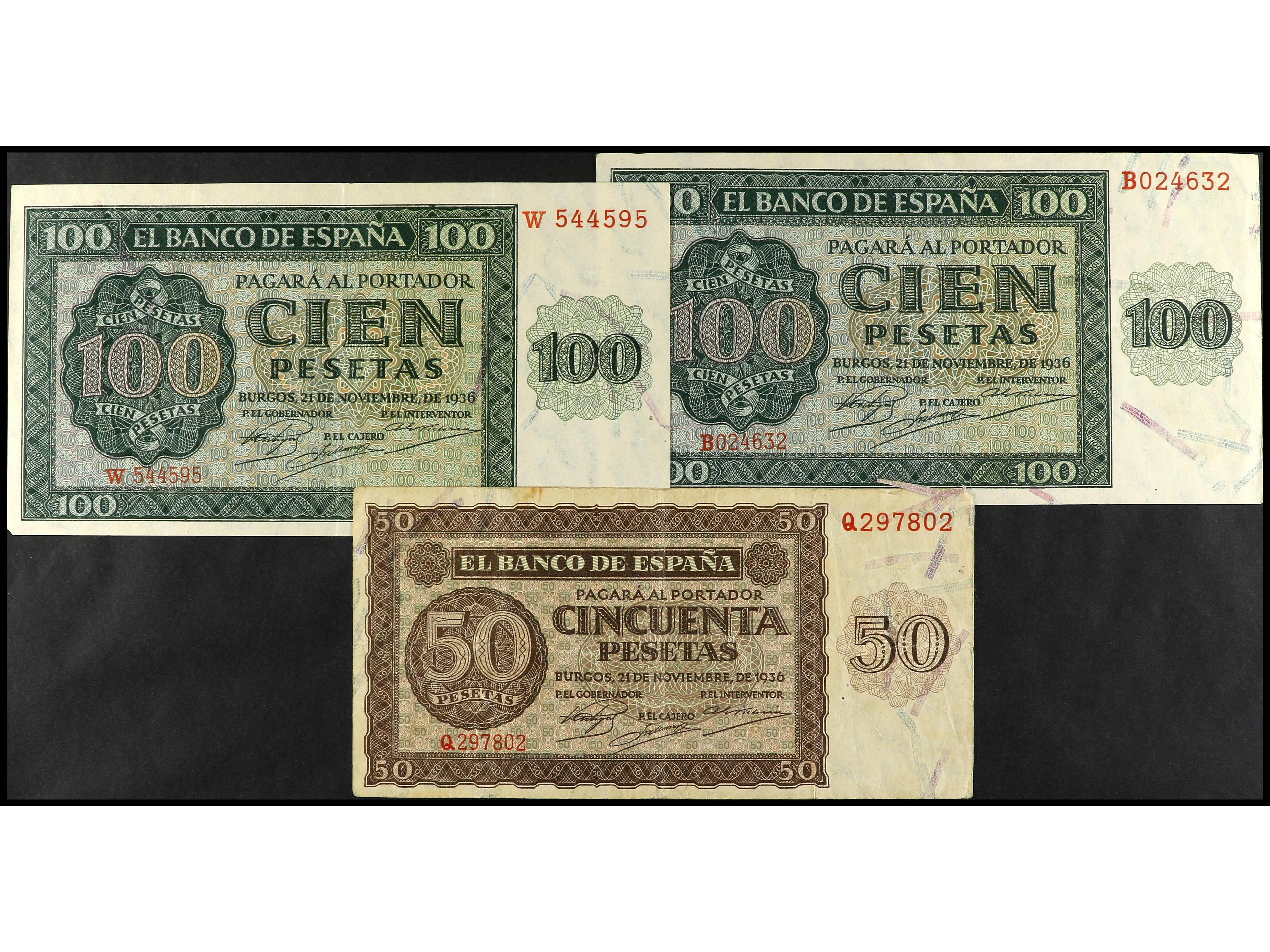 Lote 3 billetes 50, 100 Pesetas (2). 21 Noviembre 1936. Ed-420a, 421a (2). MBC a EBC-. (Image1)