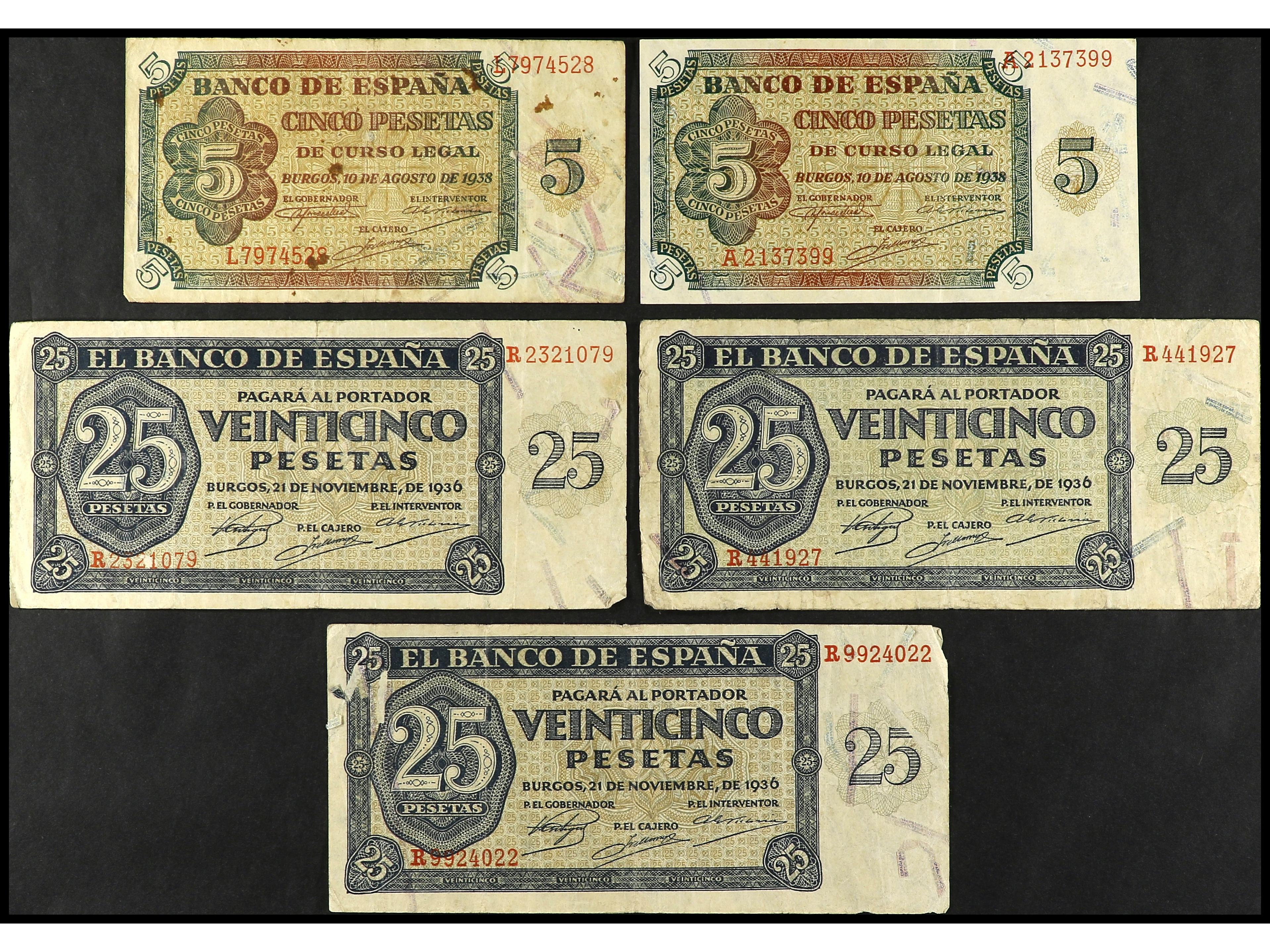 Lote 5 billetes 5 (2), 25 Pesetas. 1936 (3) y 1938 (2). Ed-419c (3), 435, 435a. MBC- a MBC. (Image1)