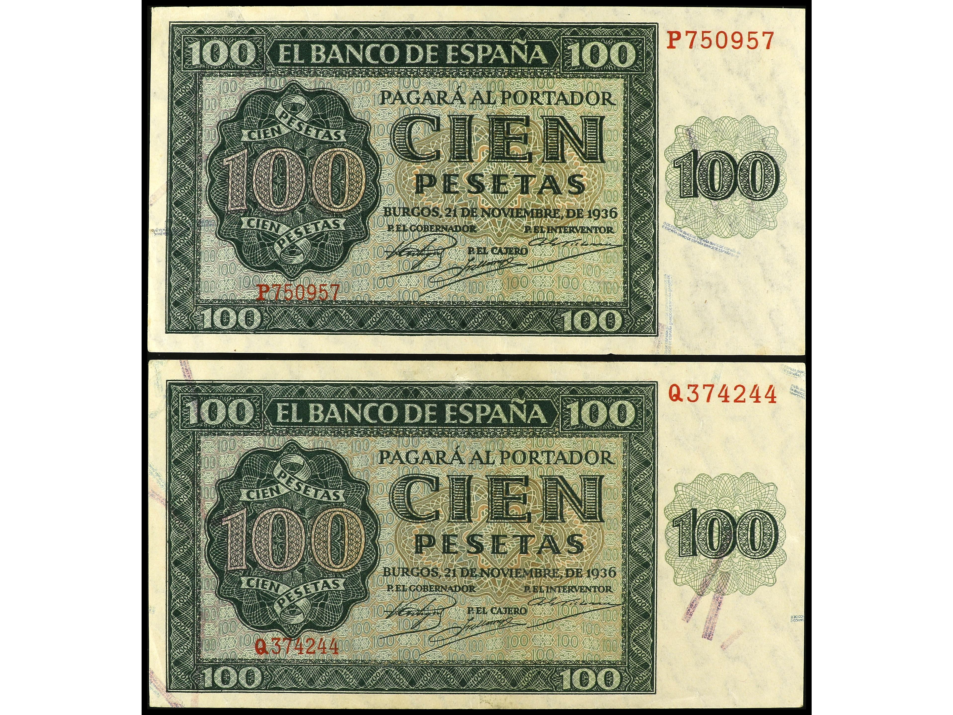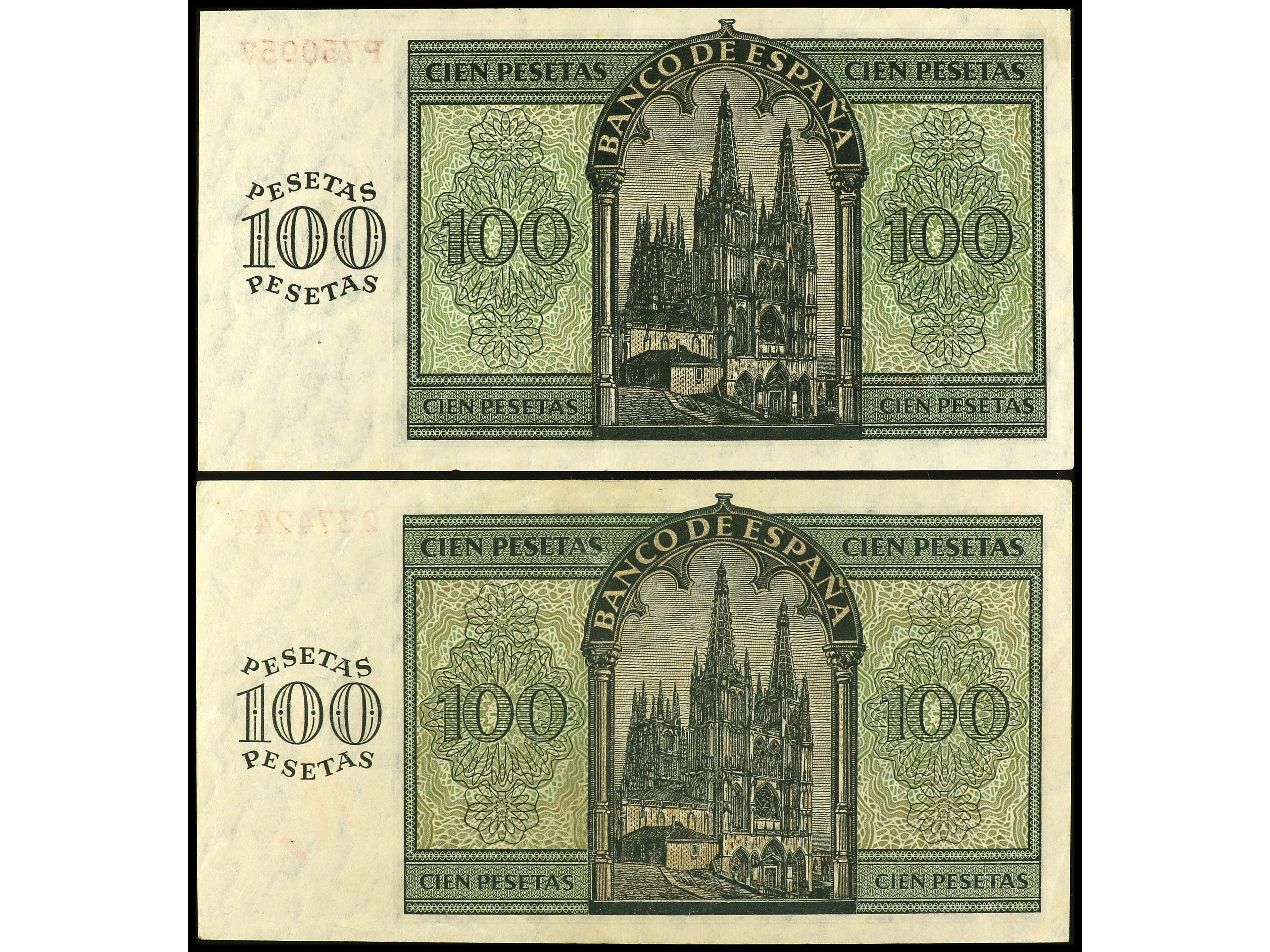 Lote 2 billetes 100 Pesetas. 21 noviembre 1936. Catedral de Burgos. Series P y Q. Ed-421a. MBC+ y EBC-. (Image1) (Image2)