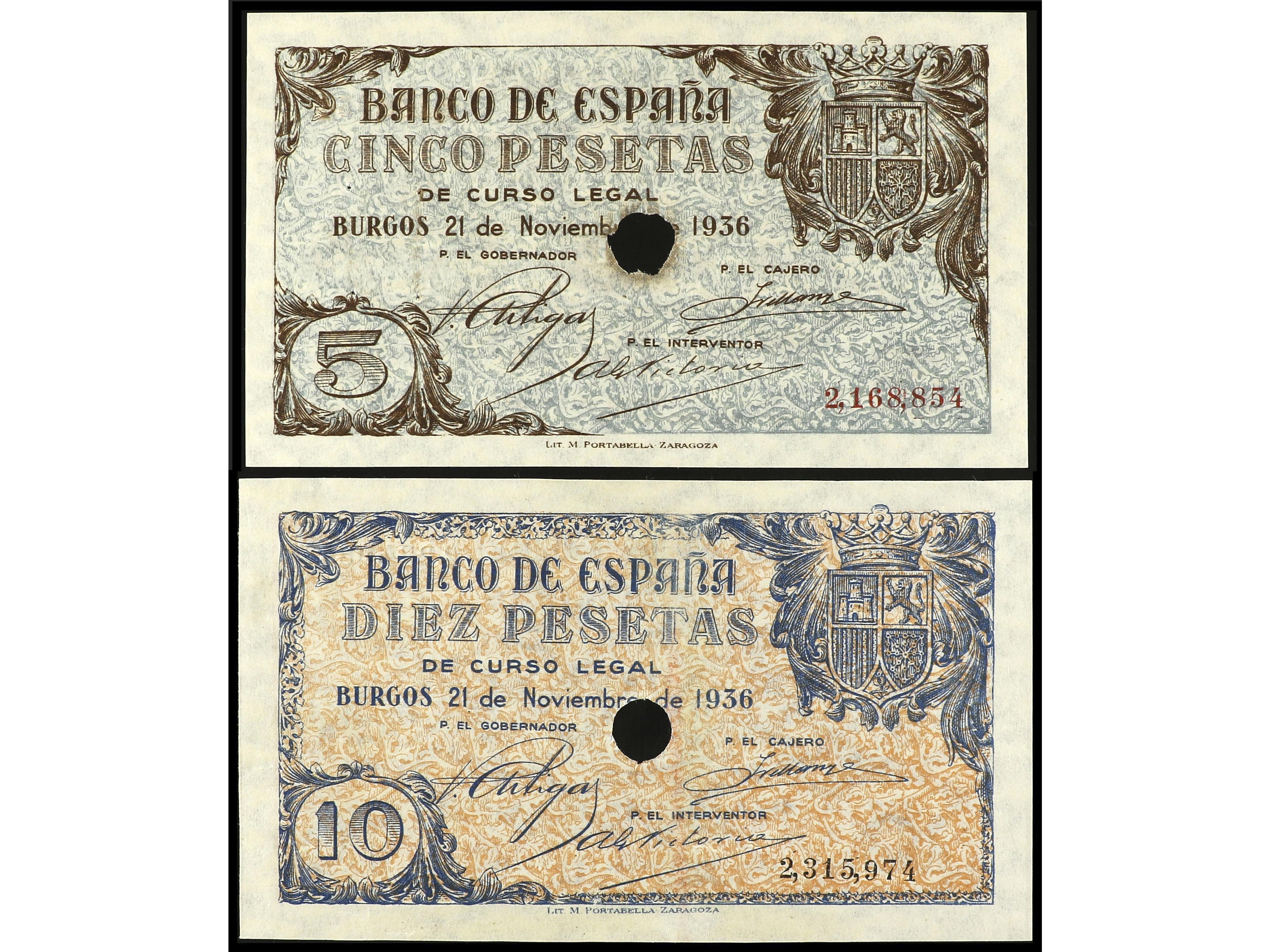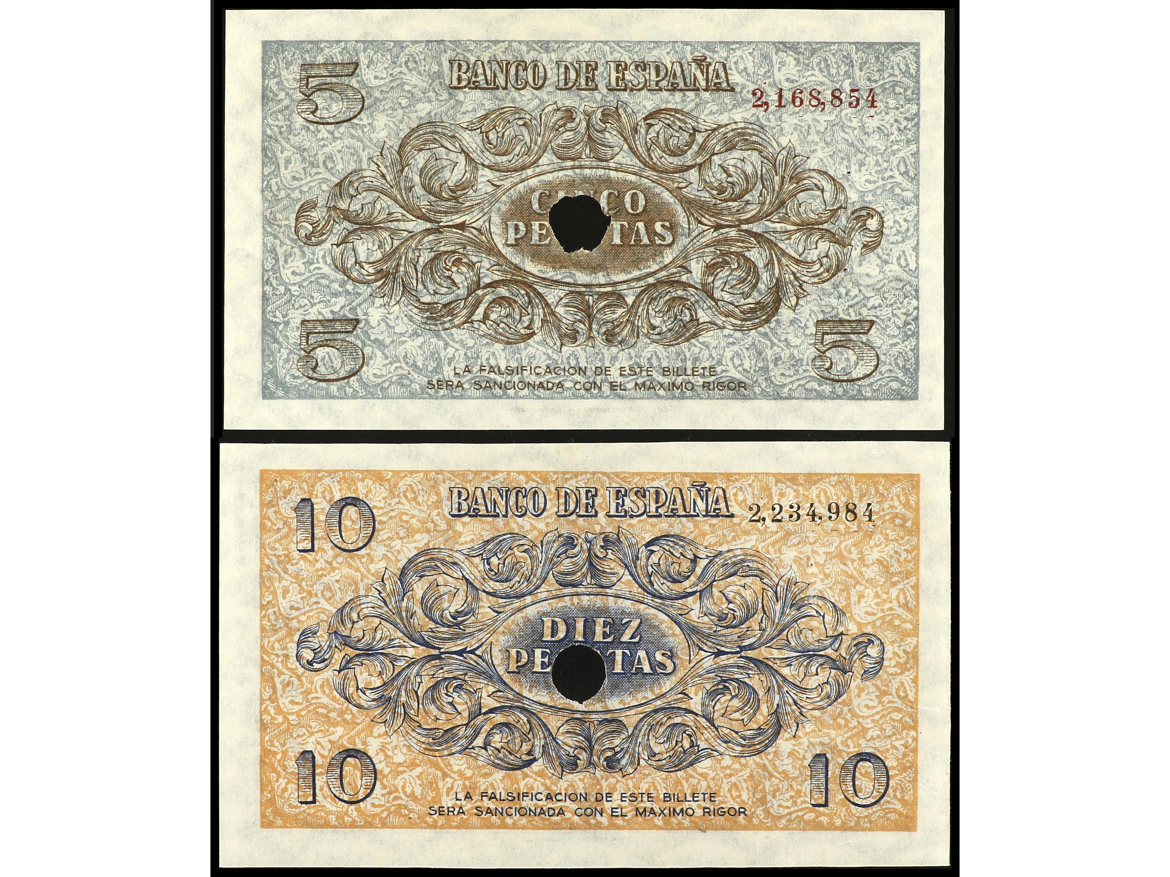 Lote 2 billetes 5 y 10 Pesetas. 21 Noviembre 1936. Con taladros de cancelación. (Puntos de grapa). Ed-417T y 418T. EBC.