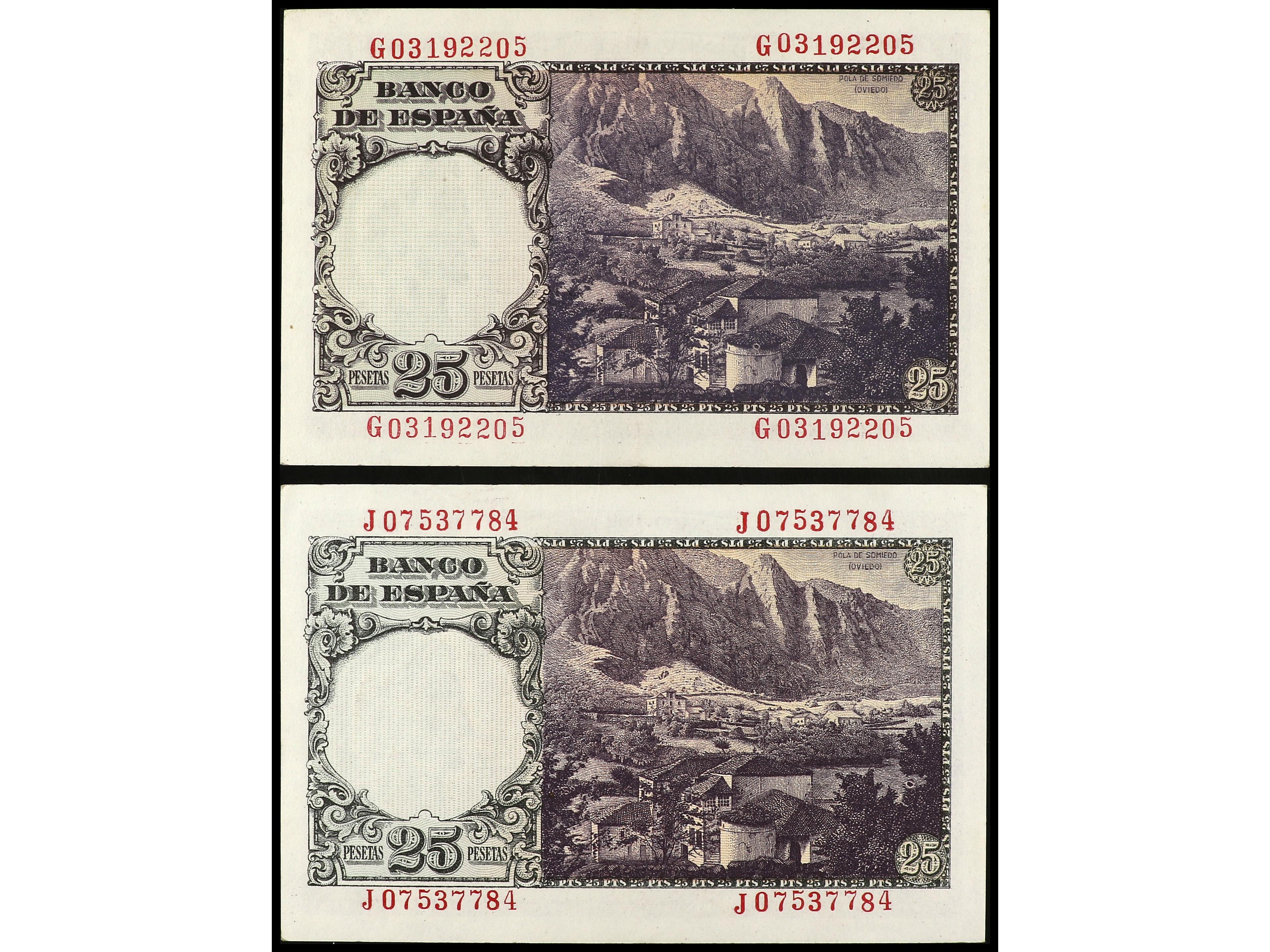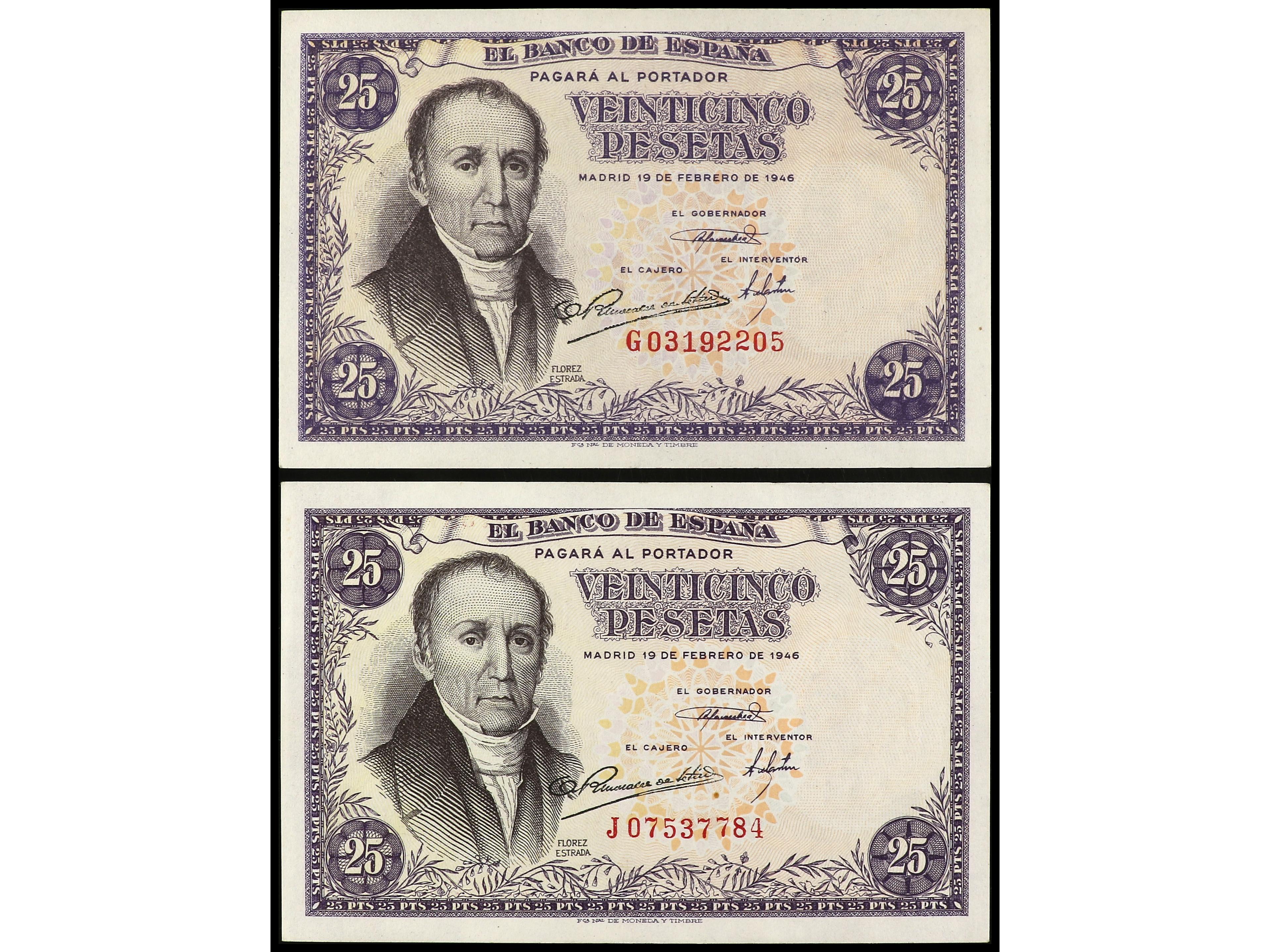Lote 2 billetes 25 Pesetas. 19 Febrero 1946. Flórez Estrada. Serie G y J. Ed-450a. EBC-. (Image1) (Image2)