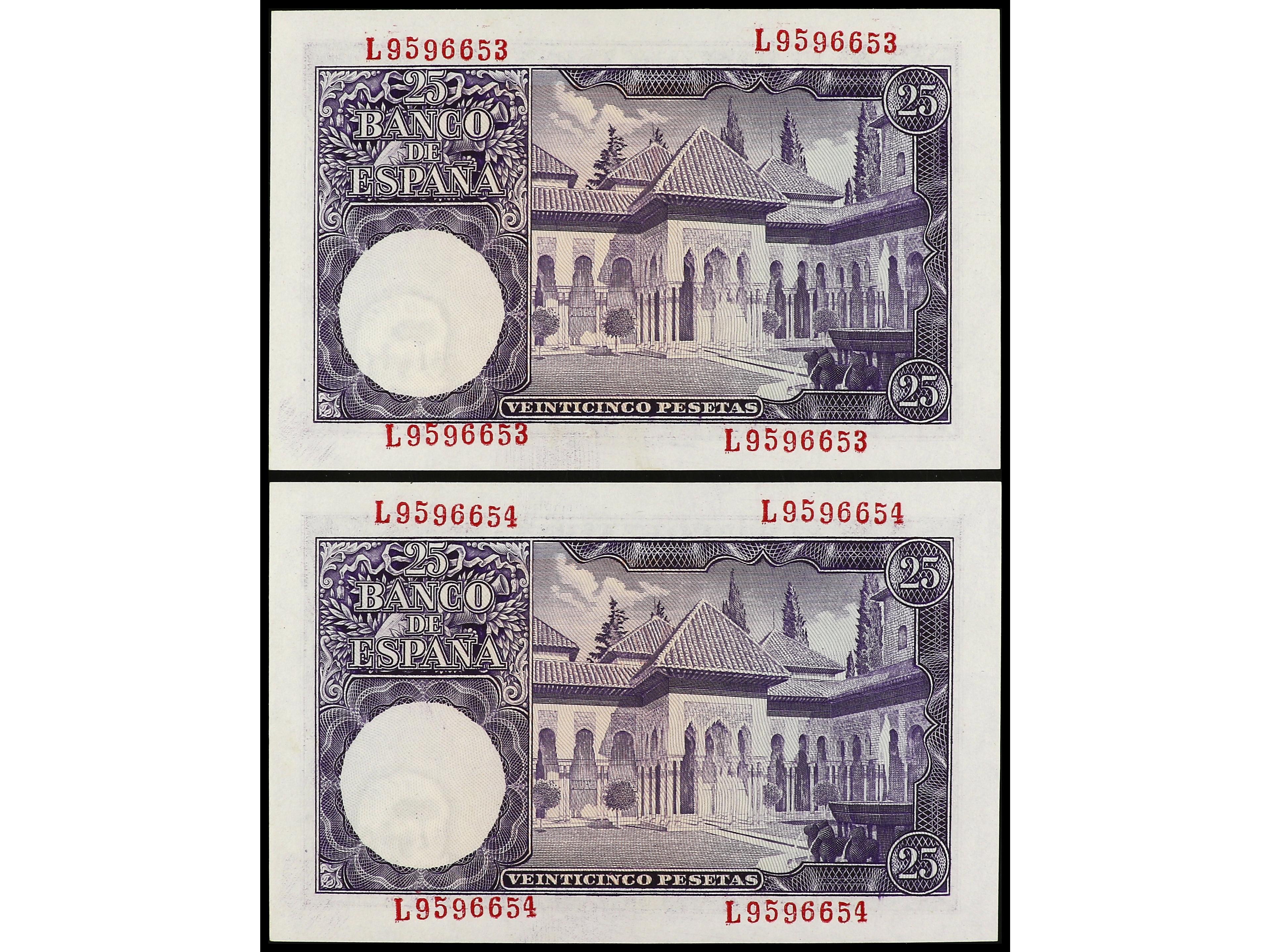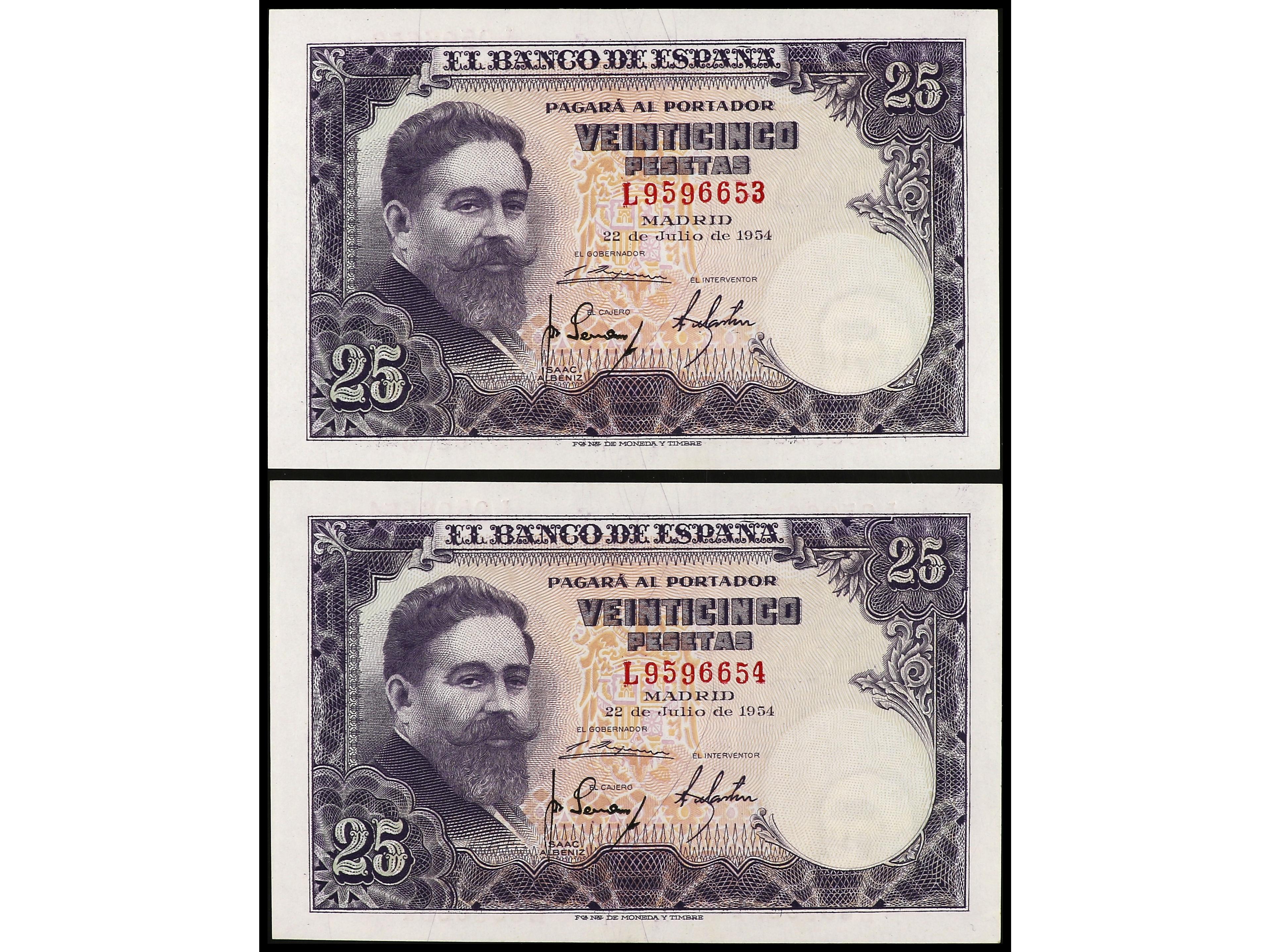 Lote 2 billetes 25 Pesetas. 22 Julio 1954. Albéniz. Serie L. Pareja correlativa. Ed-467a. EBC+. (Image1) (Image2)