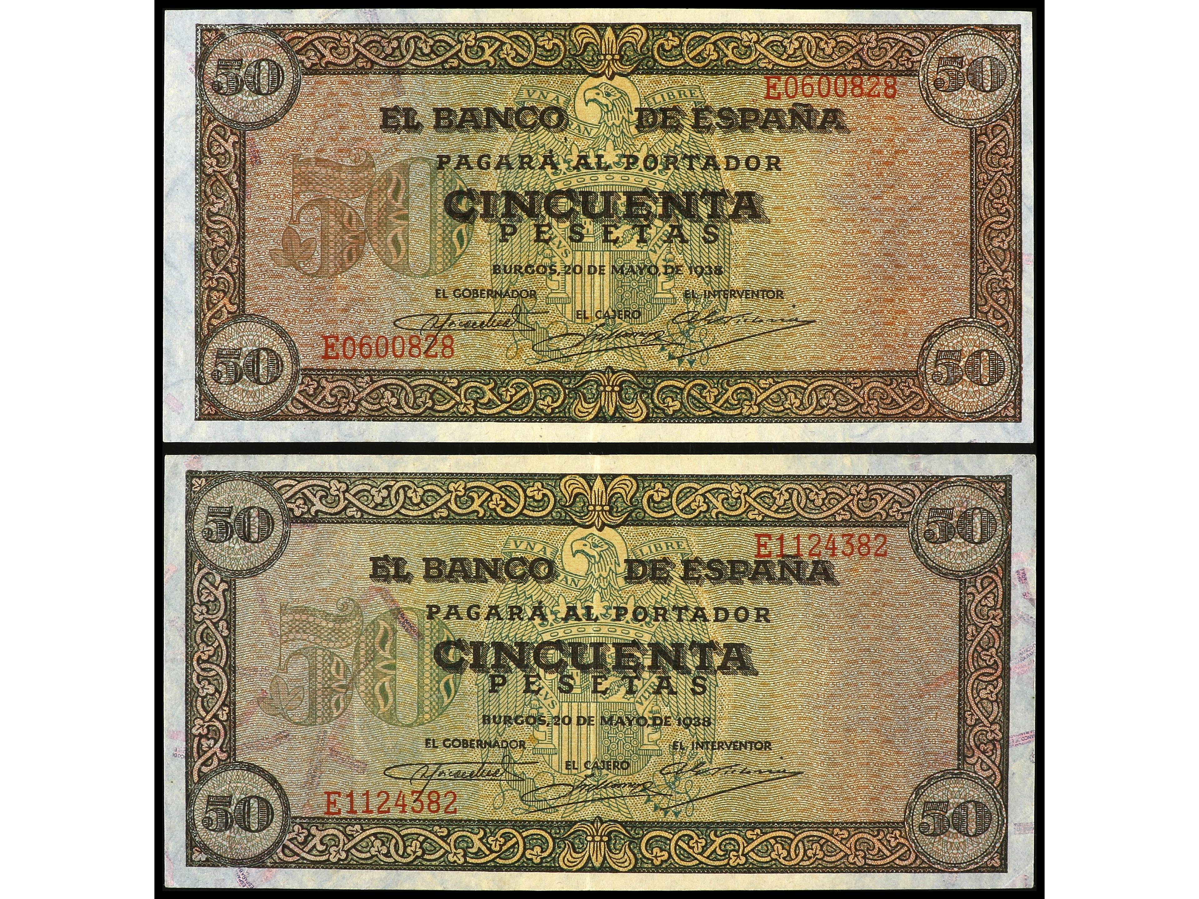 Lote 2 billetes 50 Pesetas. 20 Mayo 1938. Castillo de Olite. Serie E. Ed-431b. EBC-. (Image1) (Image2)