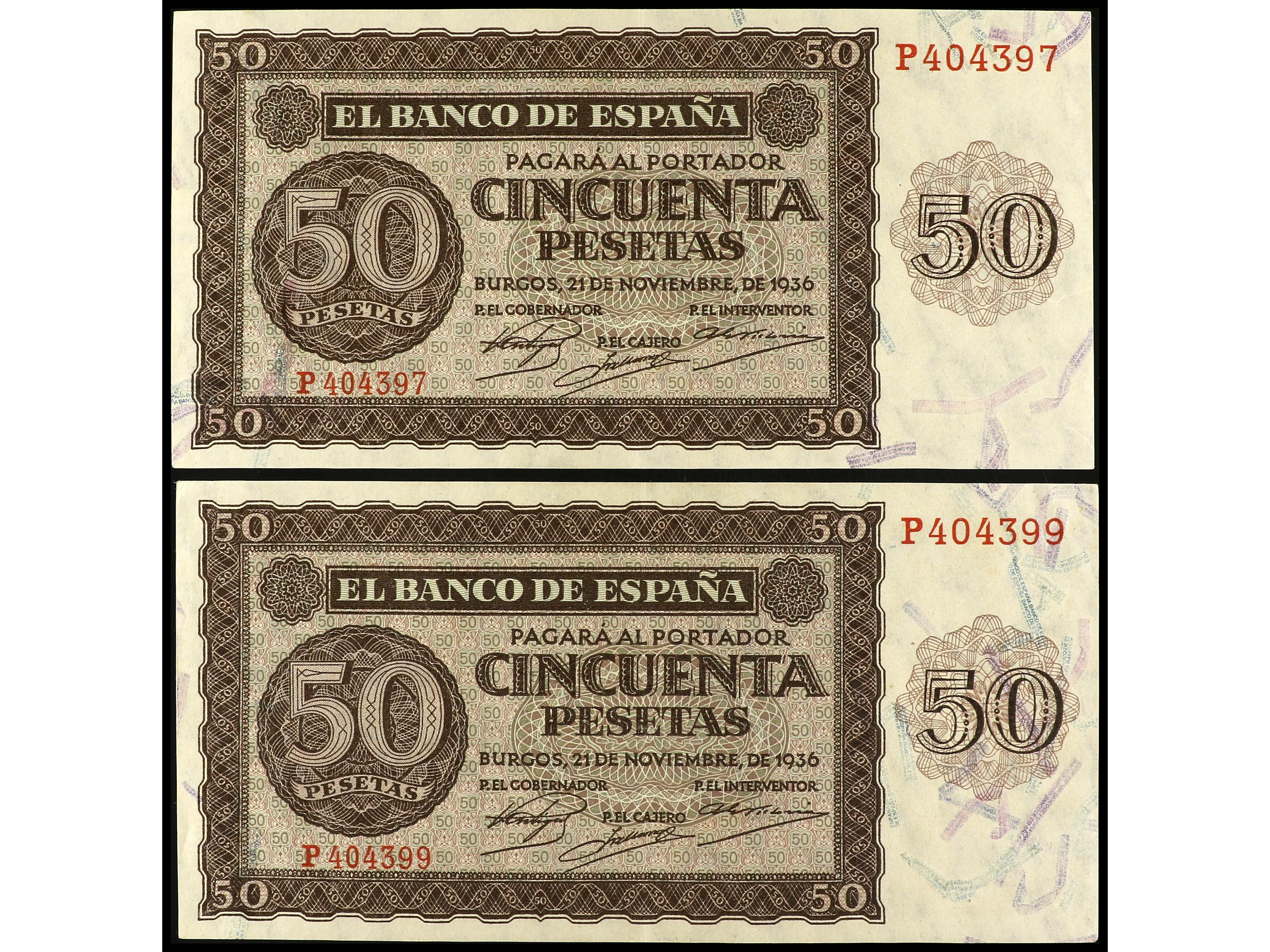 Lote 2 billetes 50 Pesetas. 21 Noviembre 1936. Serie P. Ed-420a. EBC-. (Image1) (Image2)