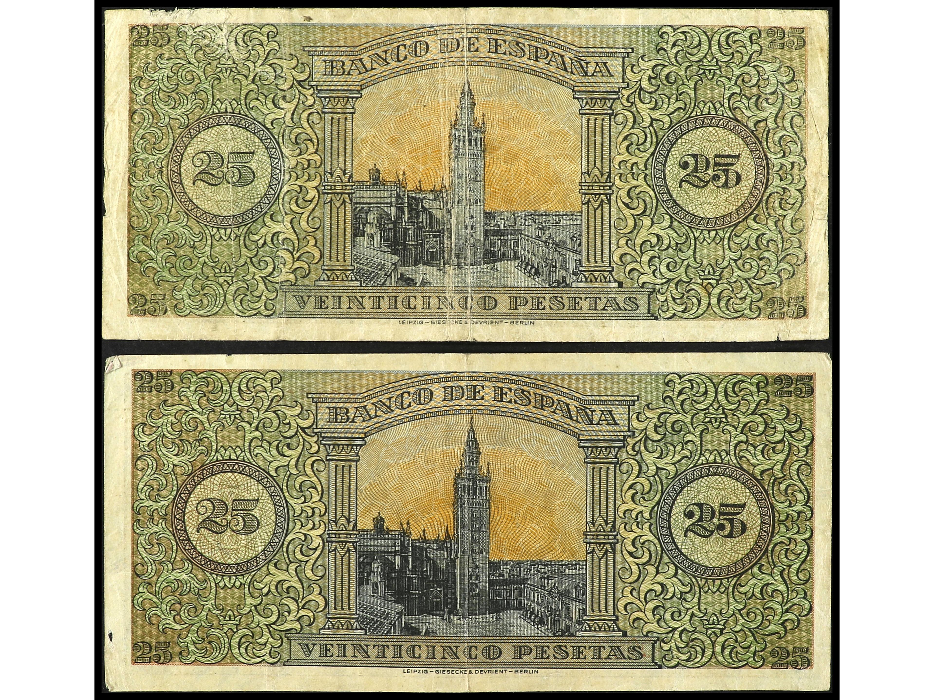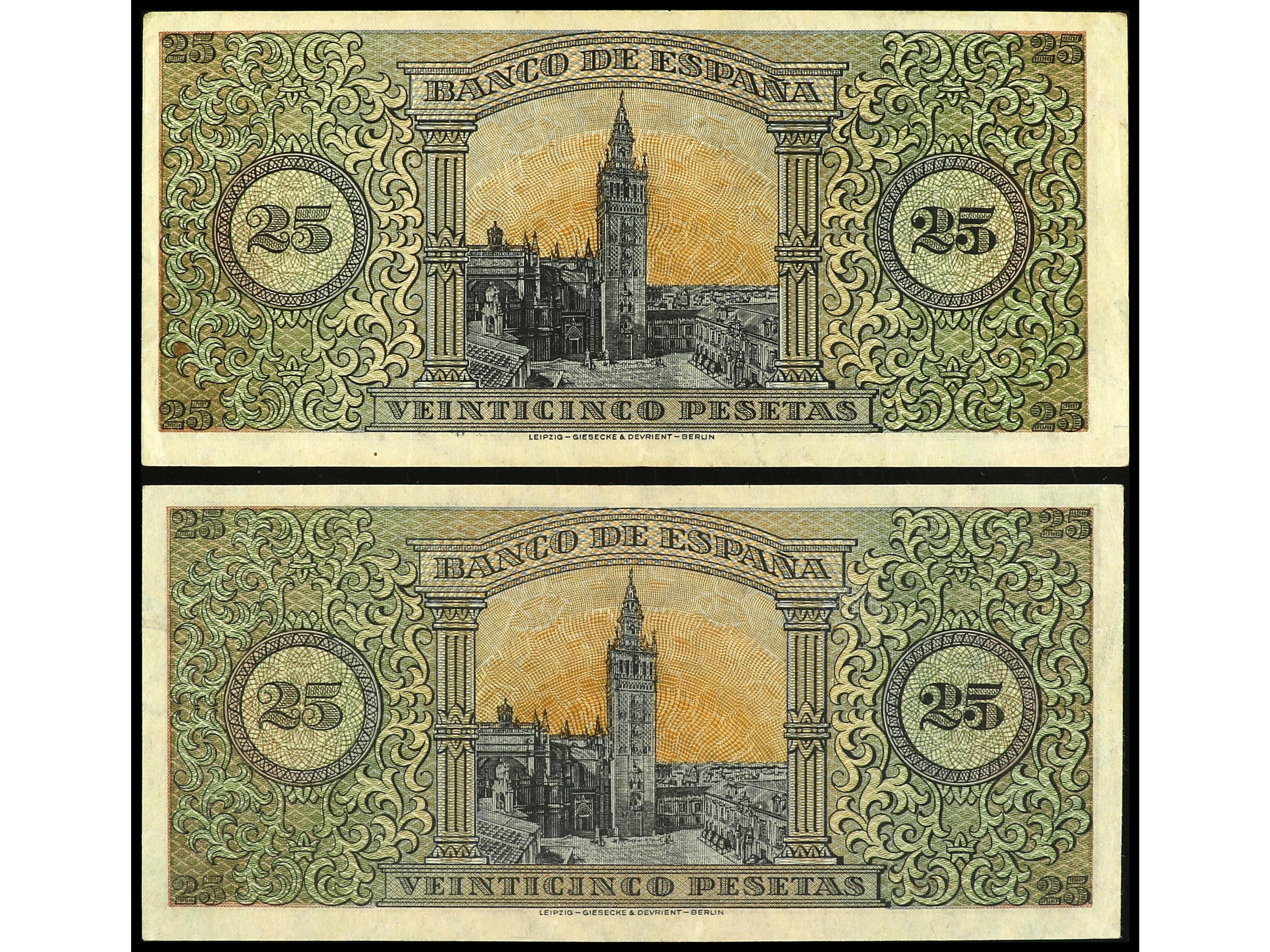 Lote 2 billetes 25 Pesetas. 20 Mayo 1938. Giralda de Sevilla. Serie C y E. Ed-430a. MBC+ y EBC-. (Image1) (Image2)