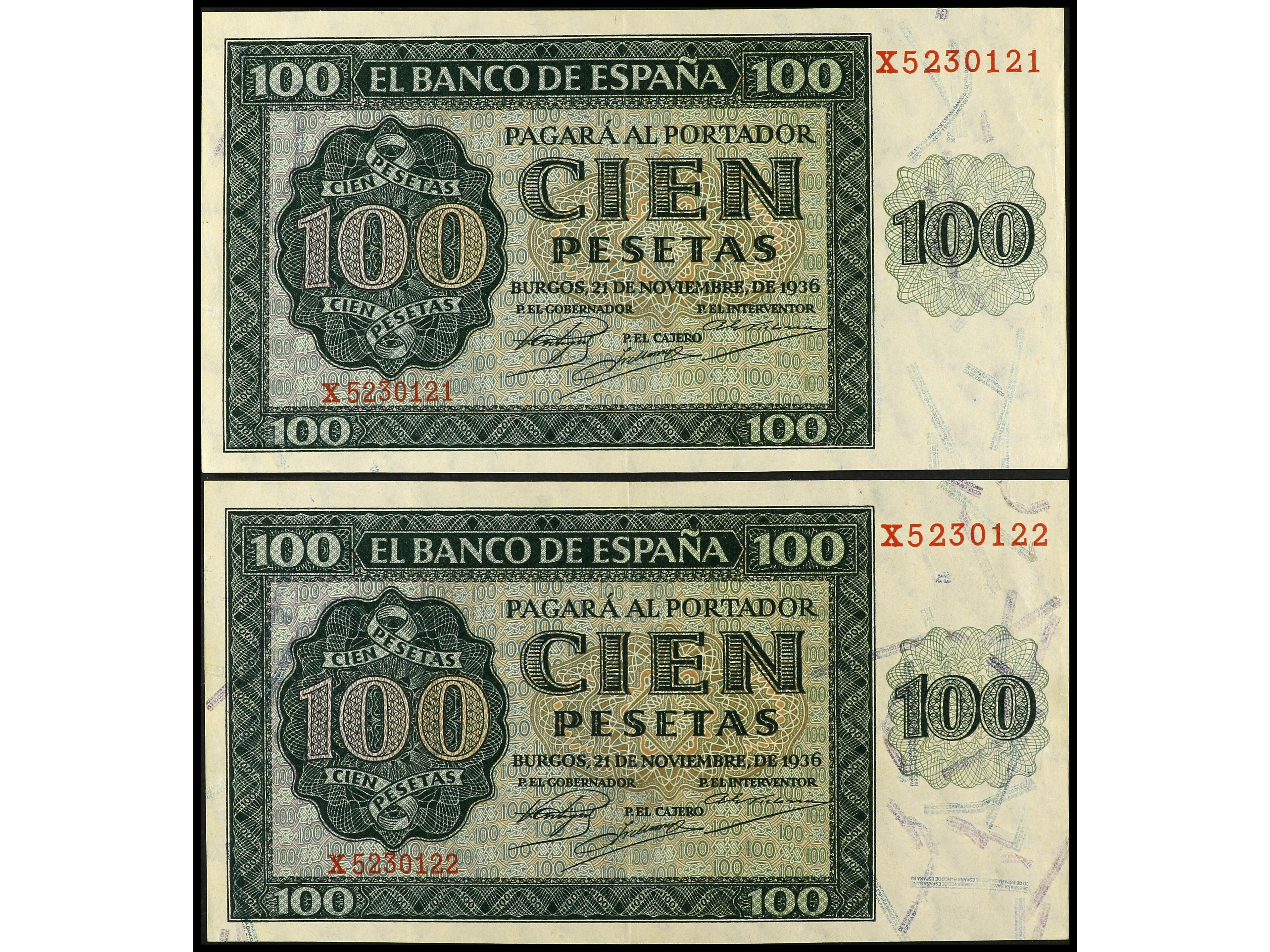 Lote 2 billetes 100 Pesetas. 21 Noviembre 1936. Catedral de Burgos. Serie X. Pareja correlativa. Ed-421a. MBC+. (Image1) (Image2)