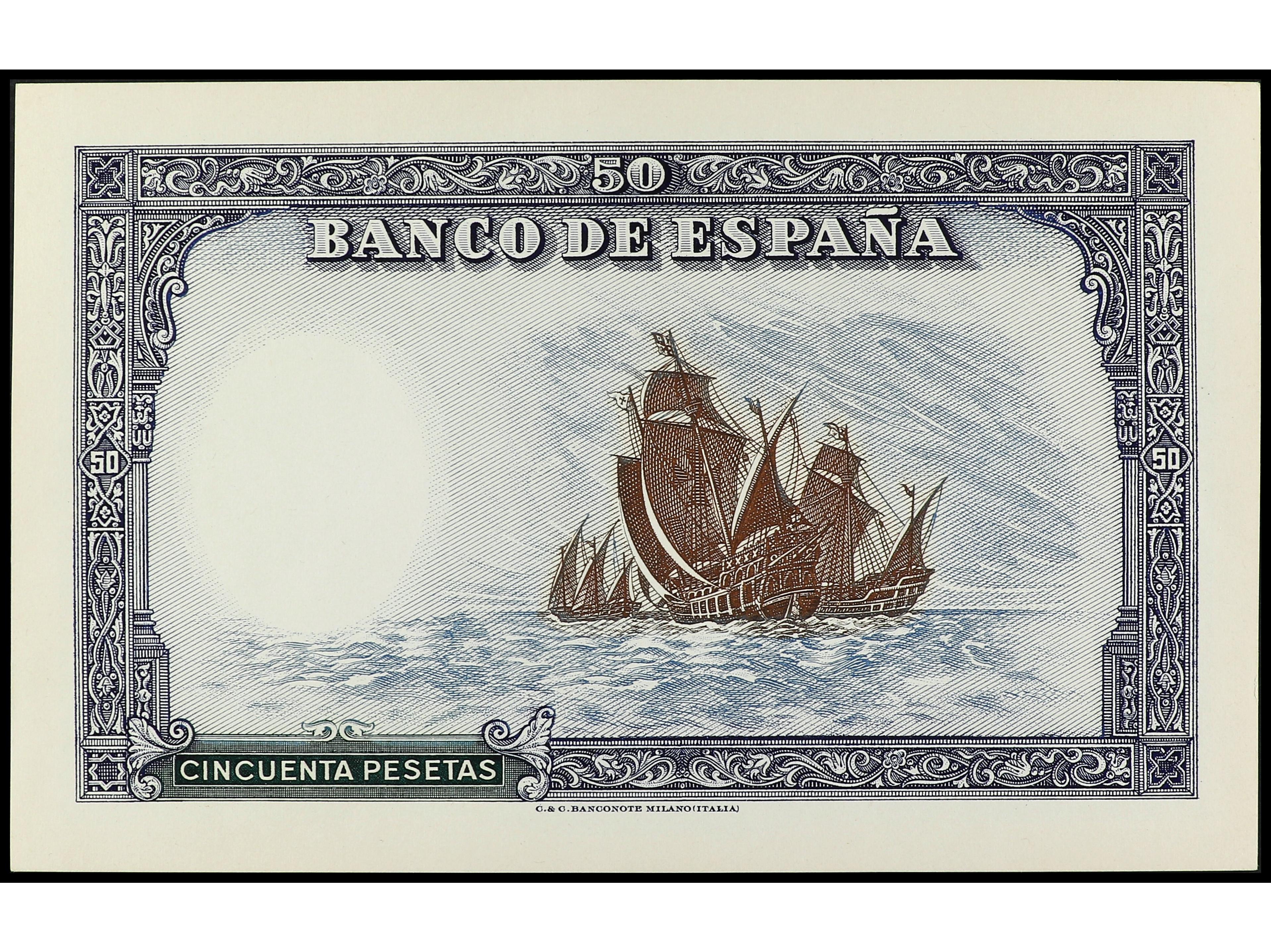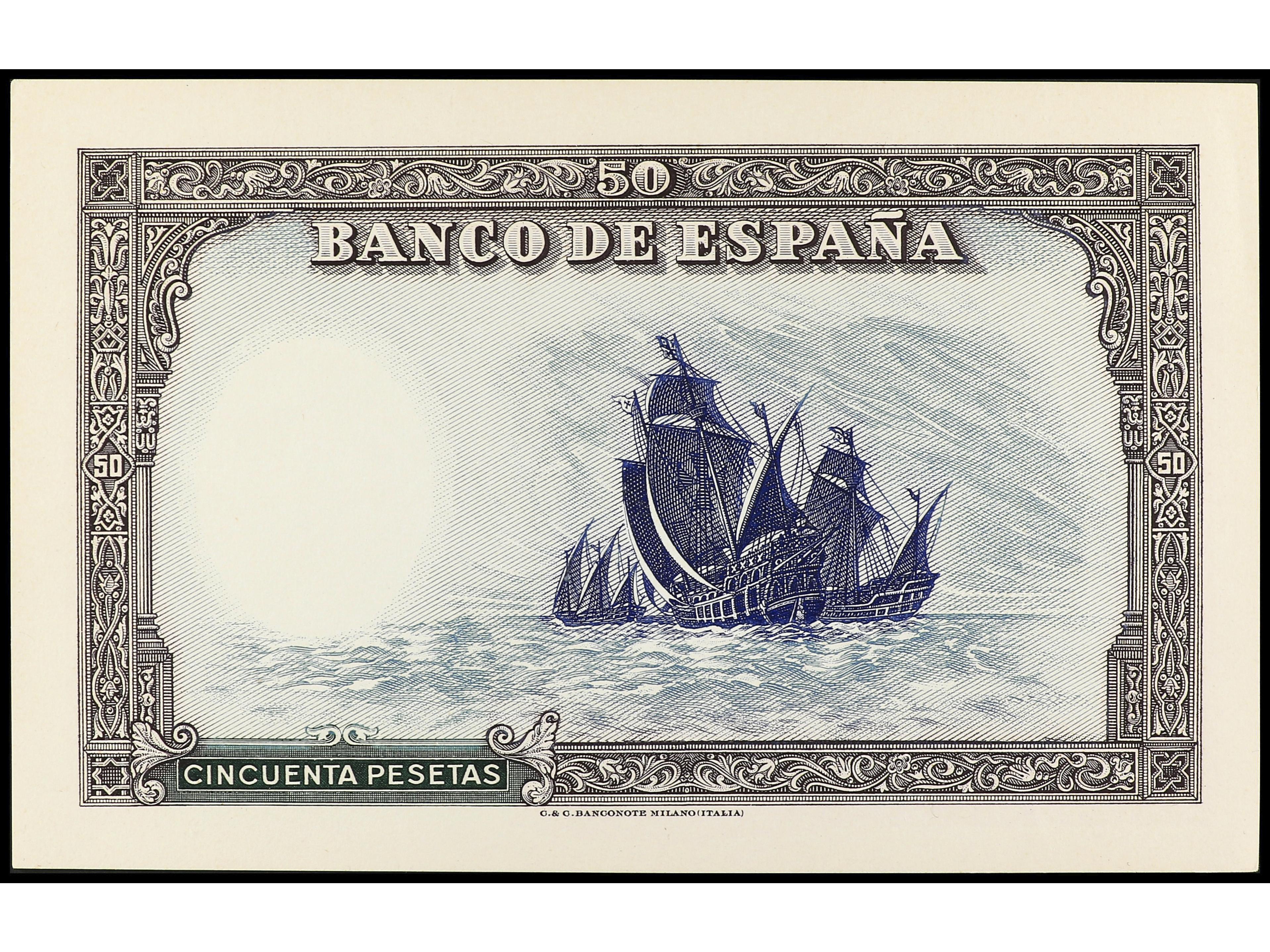 Prueba de reverso de un billete NO EMITIDO de 50 Pesetas. (1937 ca.). Cartulina delgada. Marco marrón, galeras azul y fondo verde. Ejemplar procedente de los archivos de la imprenta Calcografie e Carte Valori de Milán. RARO.