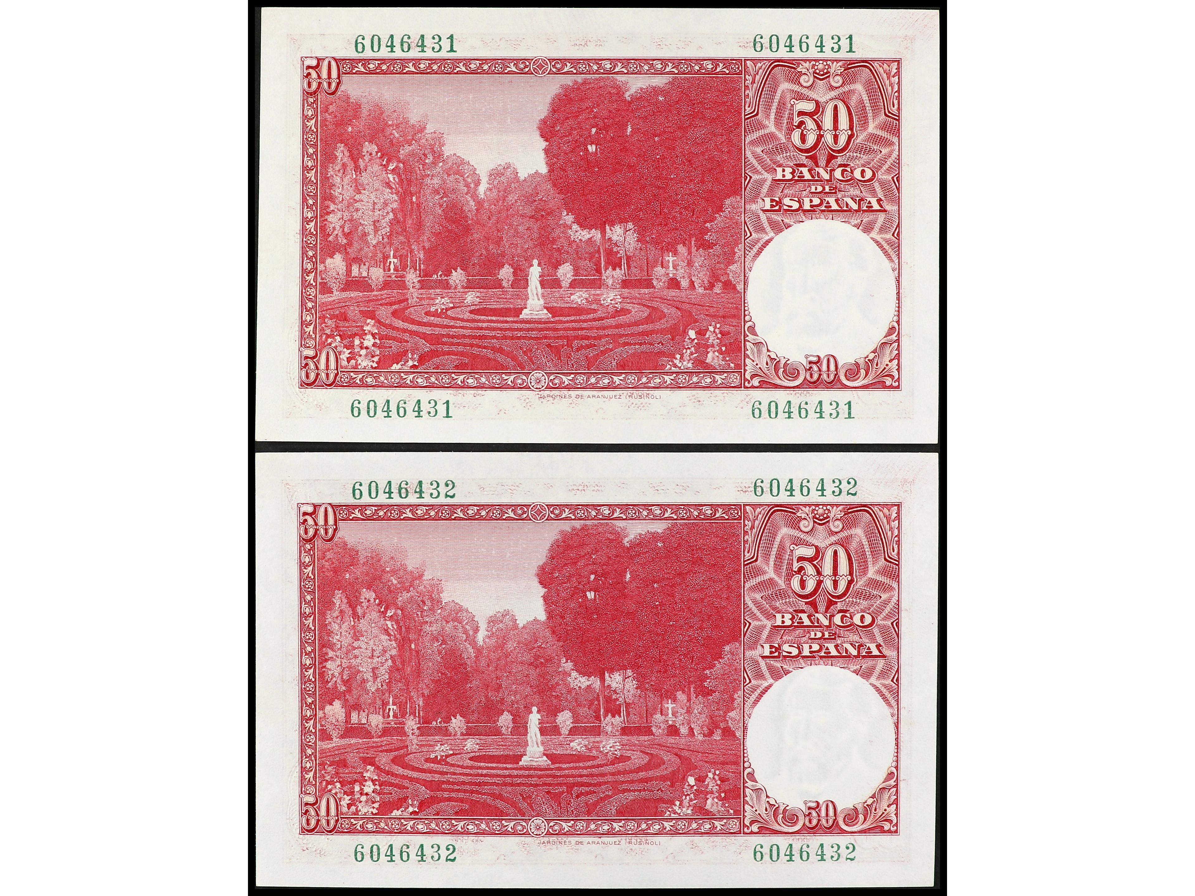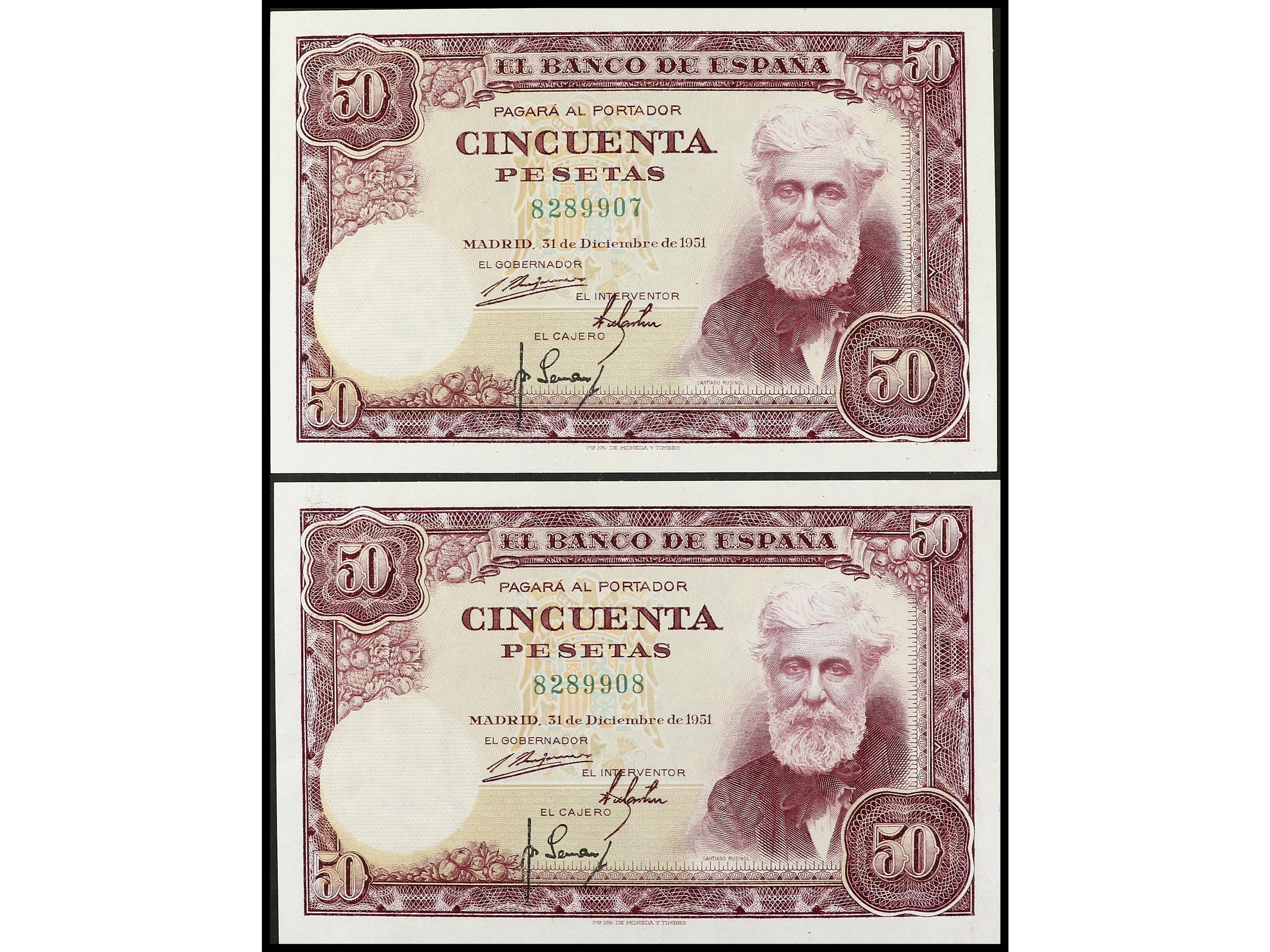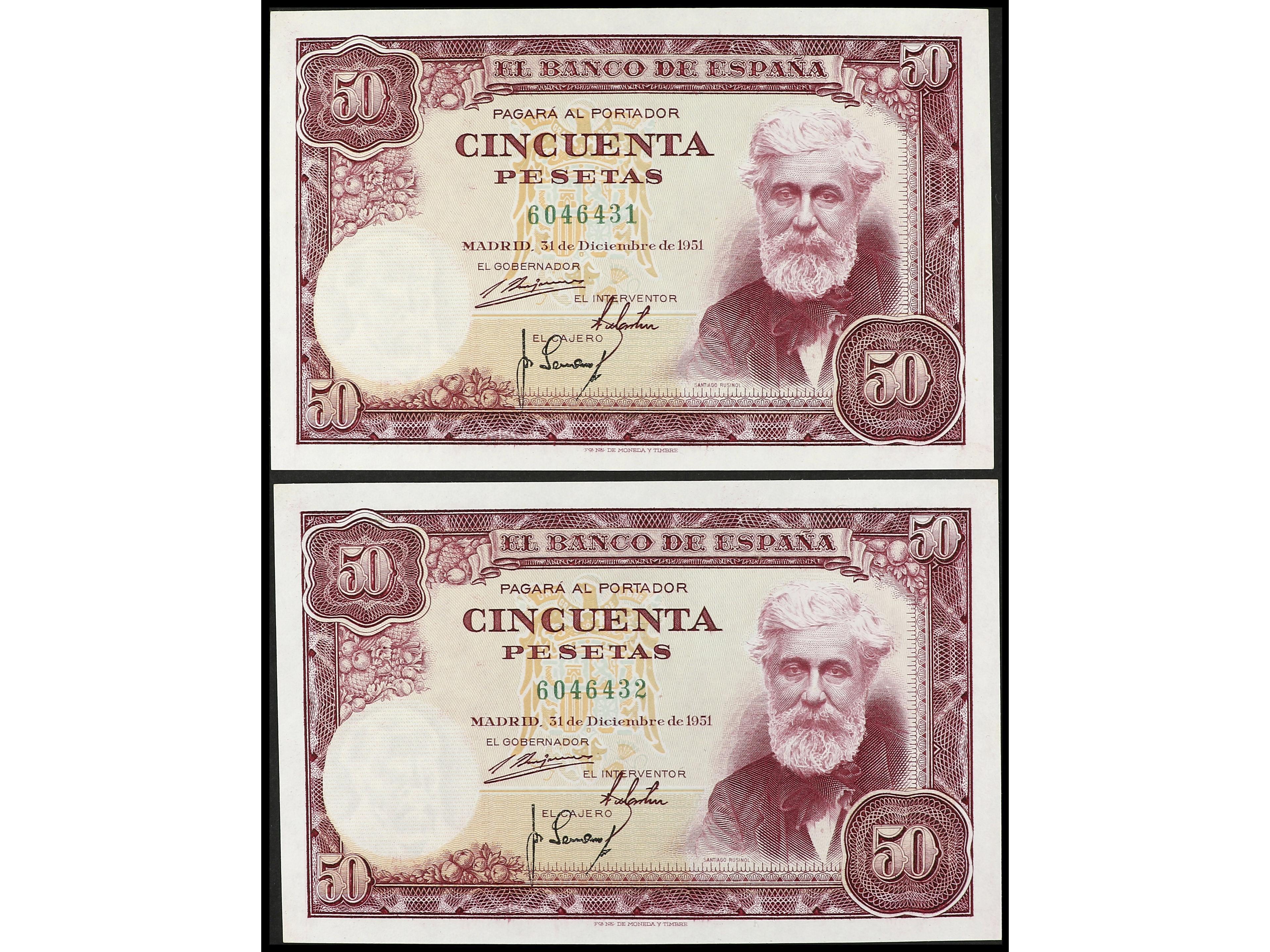 Lote 2 billetes 50 Pesetas. 31 Diciembre 1951. Rusiñol. Sin serie. Pareja correlativa. Ed-462. EBC+. (Image1) (Image2)