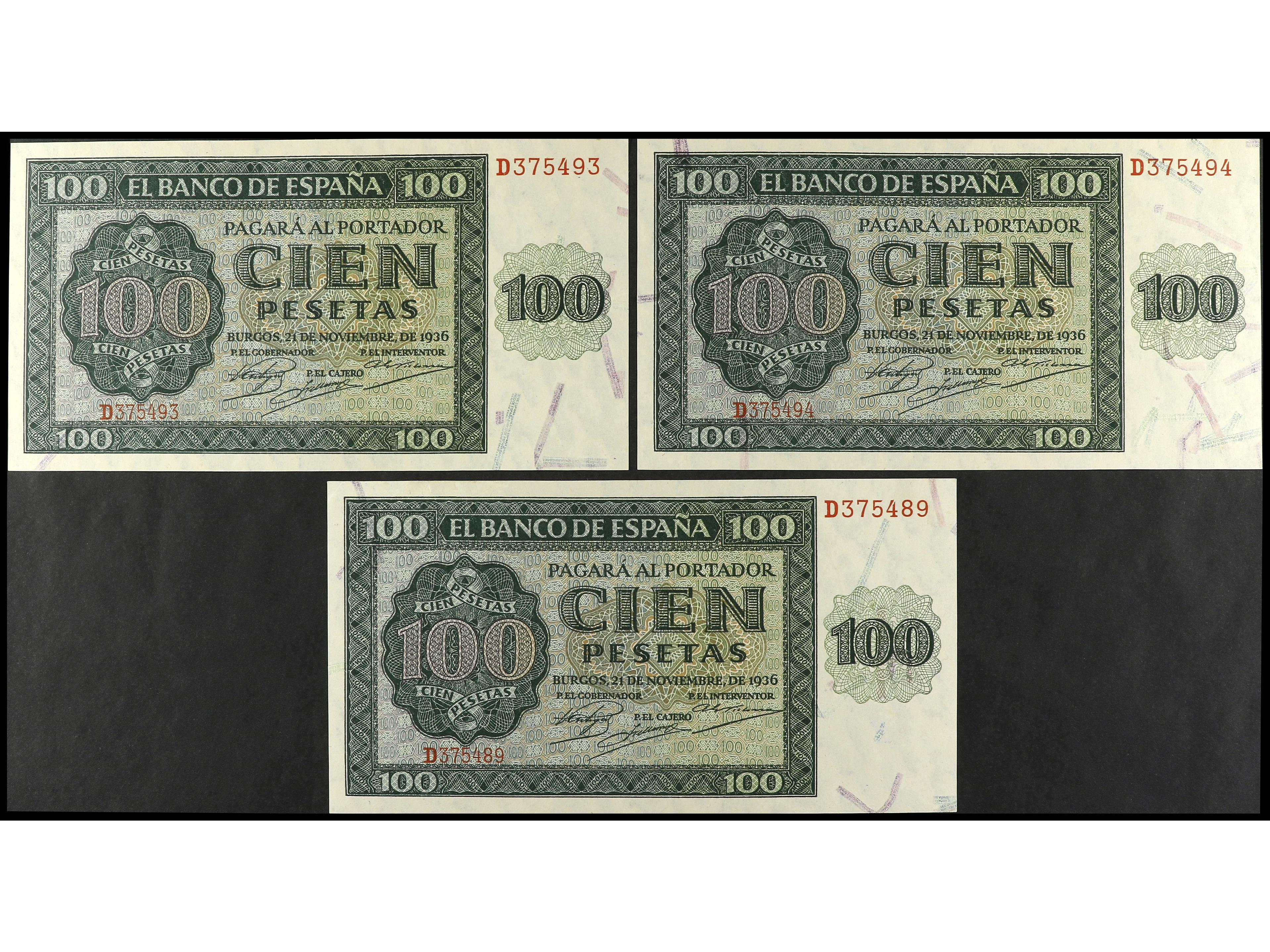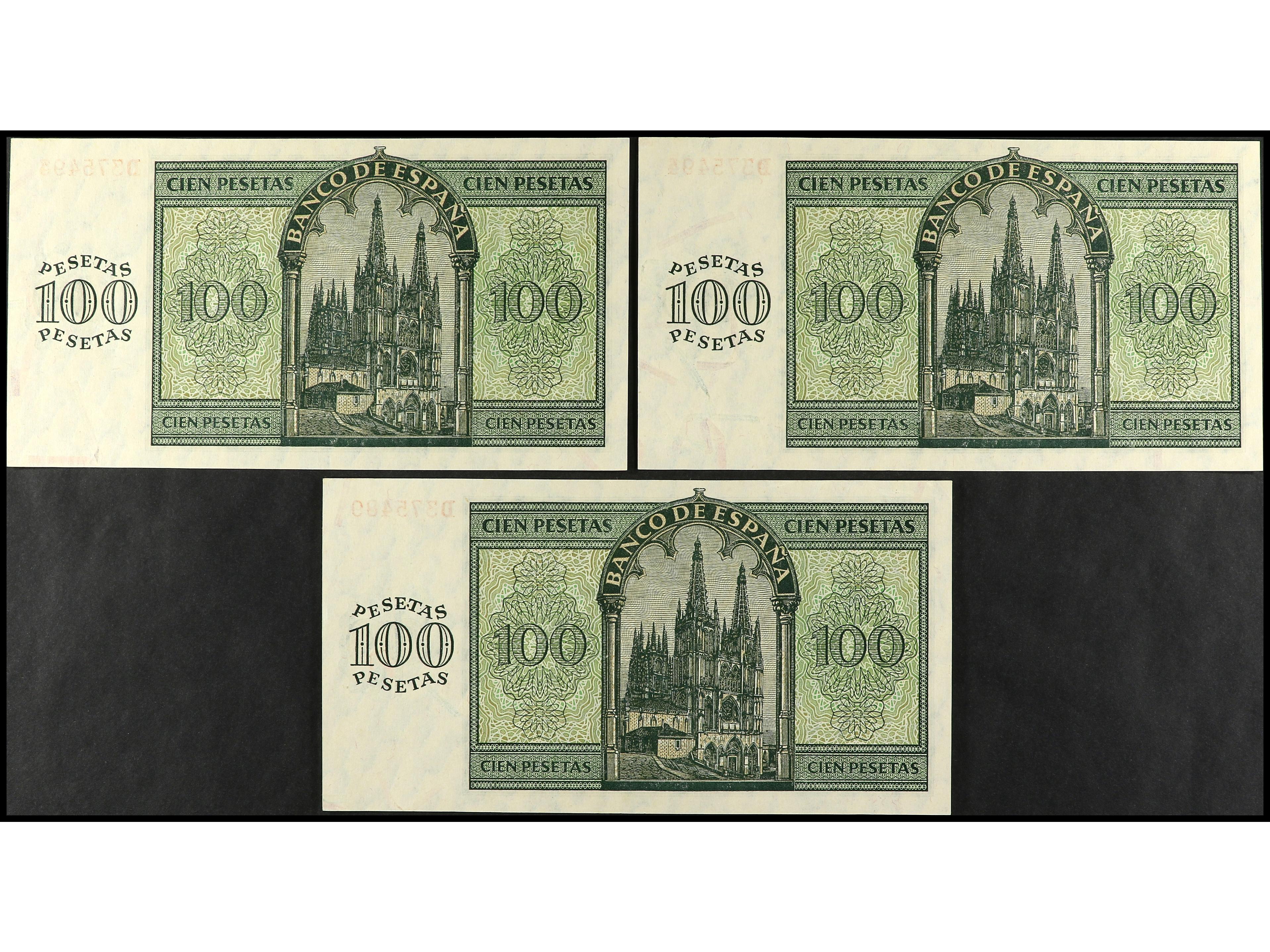 Lote 3 billetes 100 Pesetas. 21 Noviembre 1936. Catedral de Burgos. Serie D. Una pareja correlativa. Ed-421a. EBC+. (Image1) (Image2)