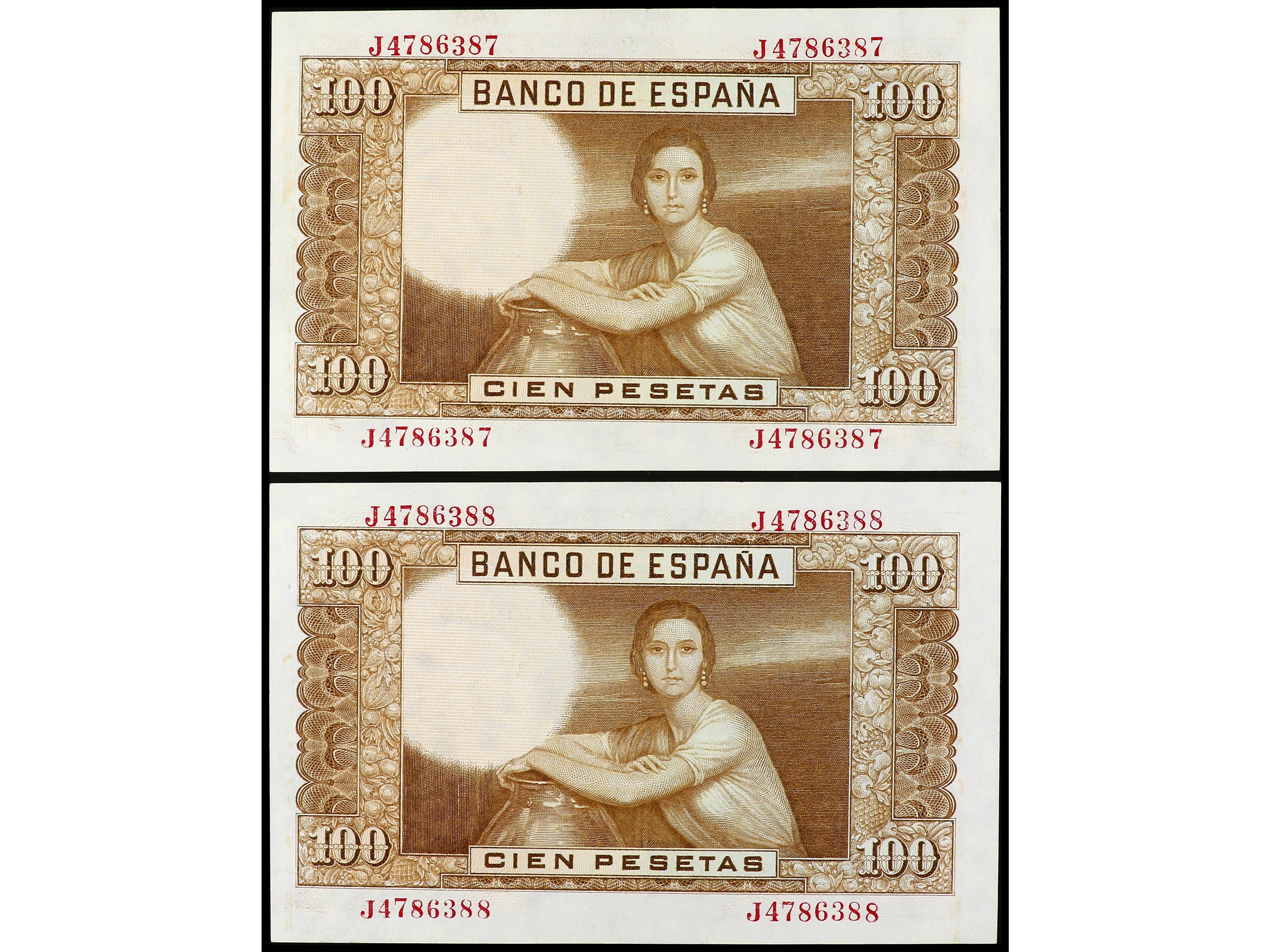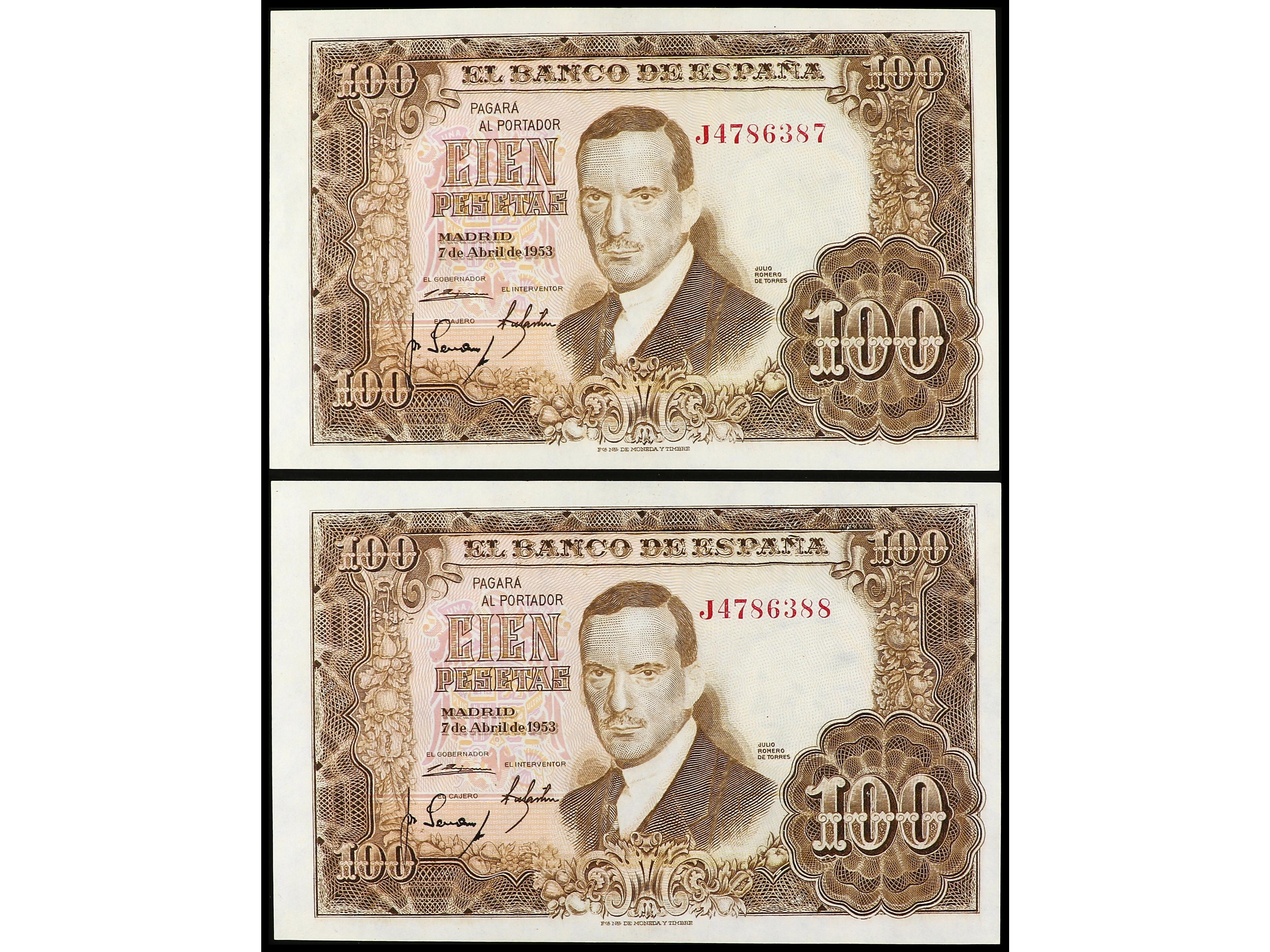 Lote 2 billetes 100 Pesetas. 7 abril 1953. Romero de Torres. Serie J. Pareja correlativa. (Arrugas). Ed-464b. SC-. (Image1) (Image2)
