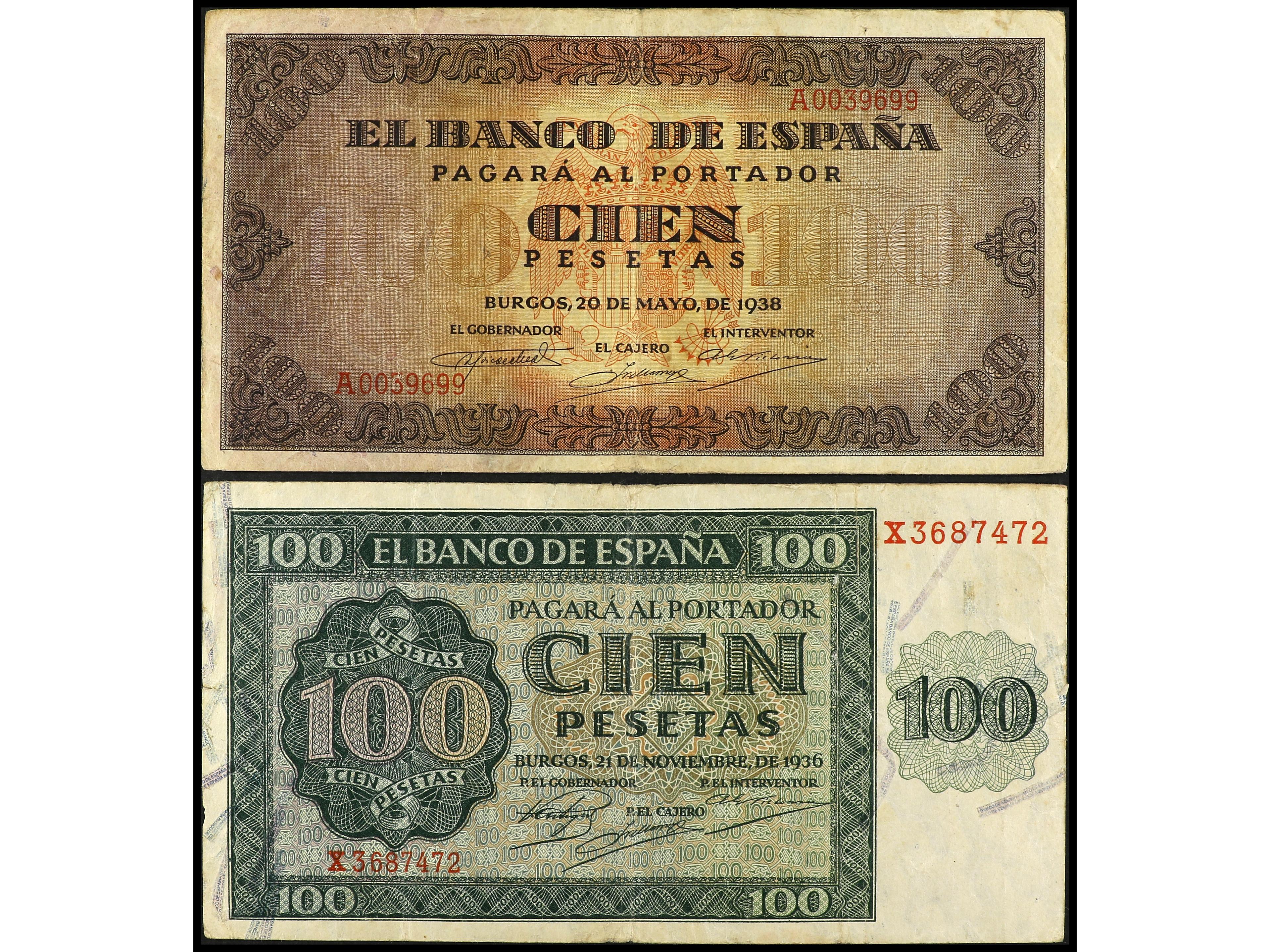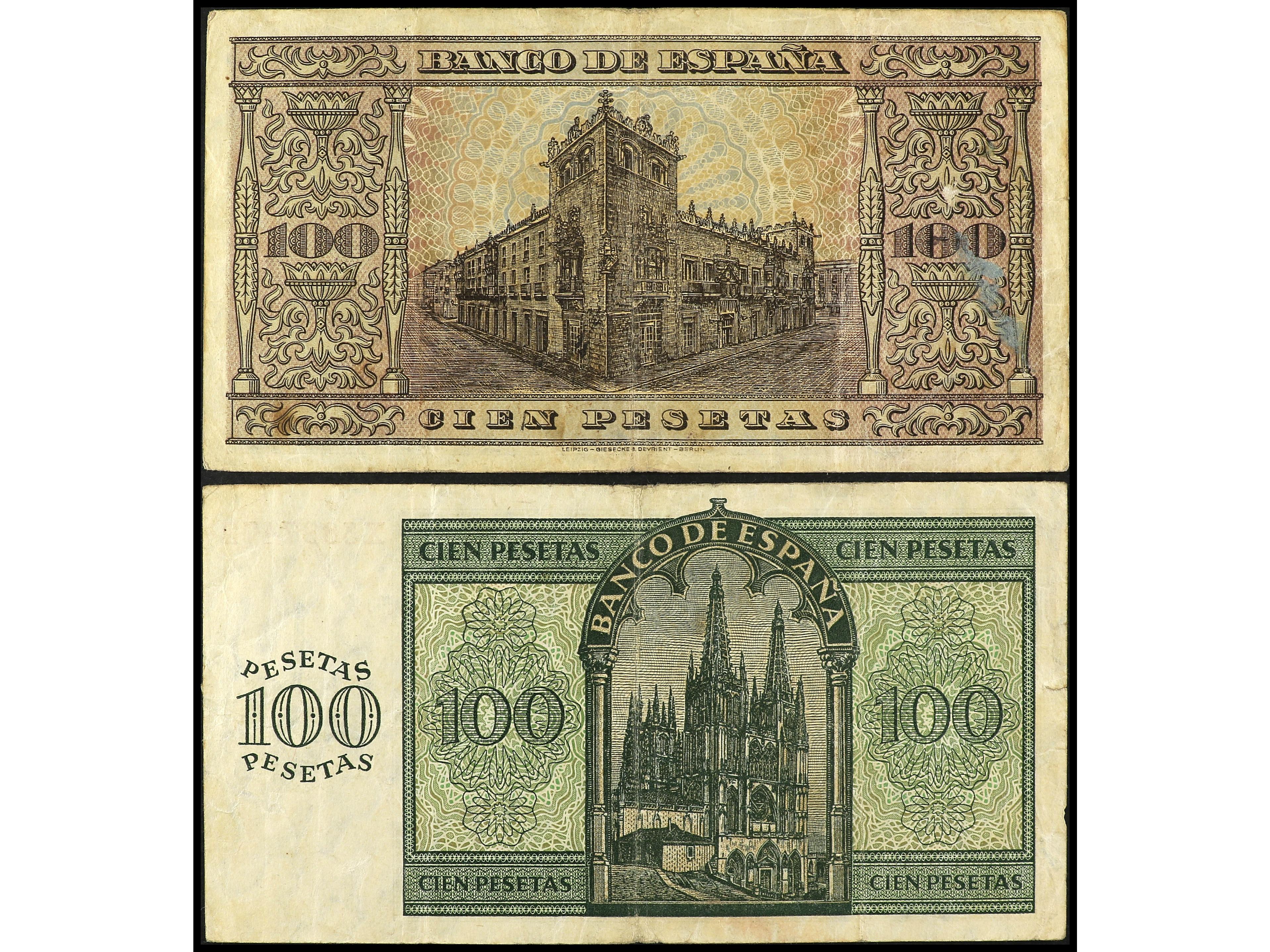 Lote 2 billetes 100 Pesetas. 1936 y 1938. Catedral de Burgos Serie X, Casa del Cordón Serie A. Ed-421b, 432. MBC. (Image1) (Image2)