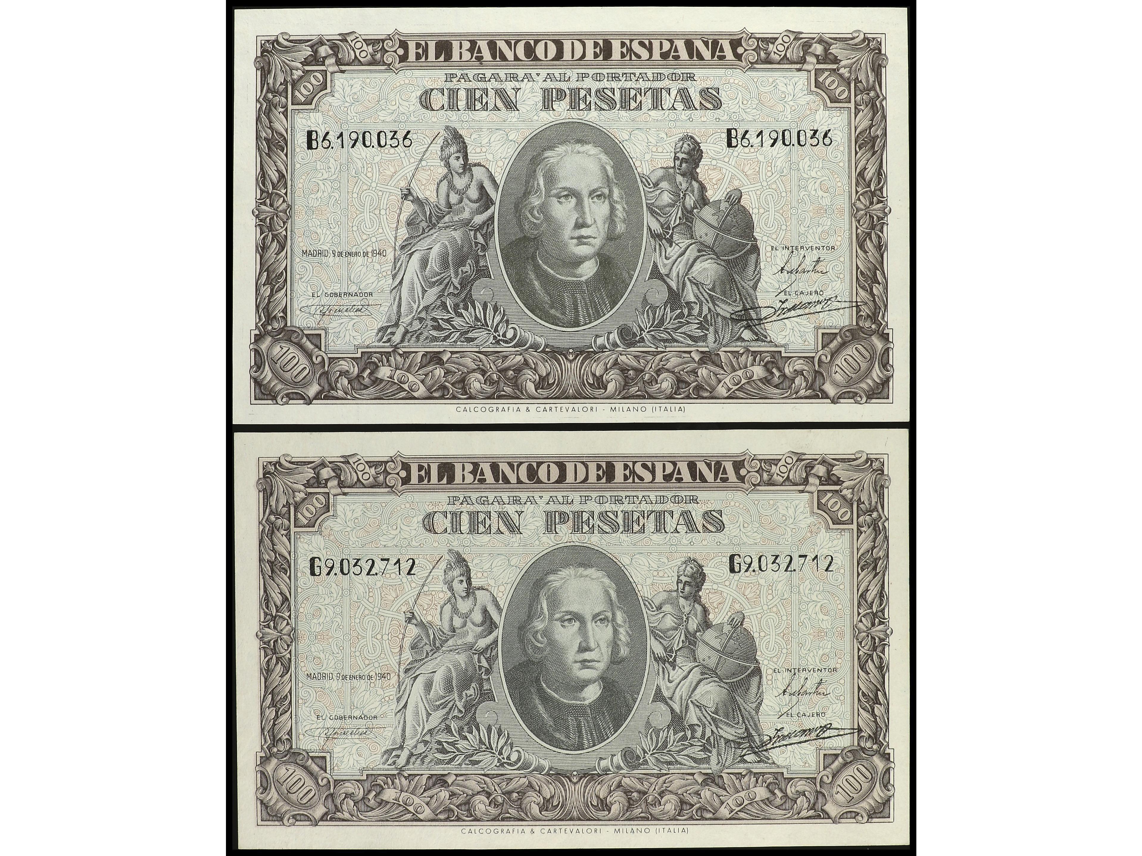Lote 2 billetes 100 Pesetas. 9 Enero 1940. Colón. Series B y G. Ed-438a. MBC+ y EBC-. (Image1) (Image2)