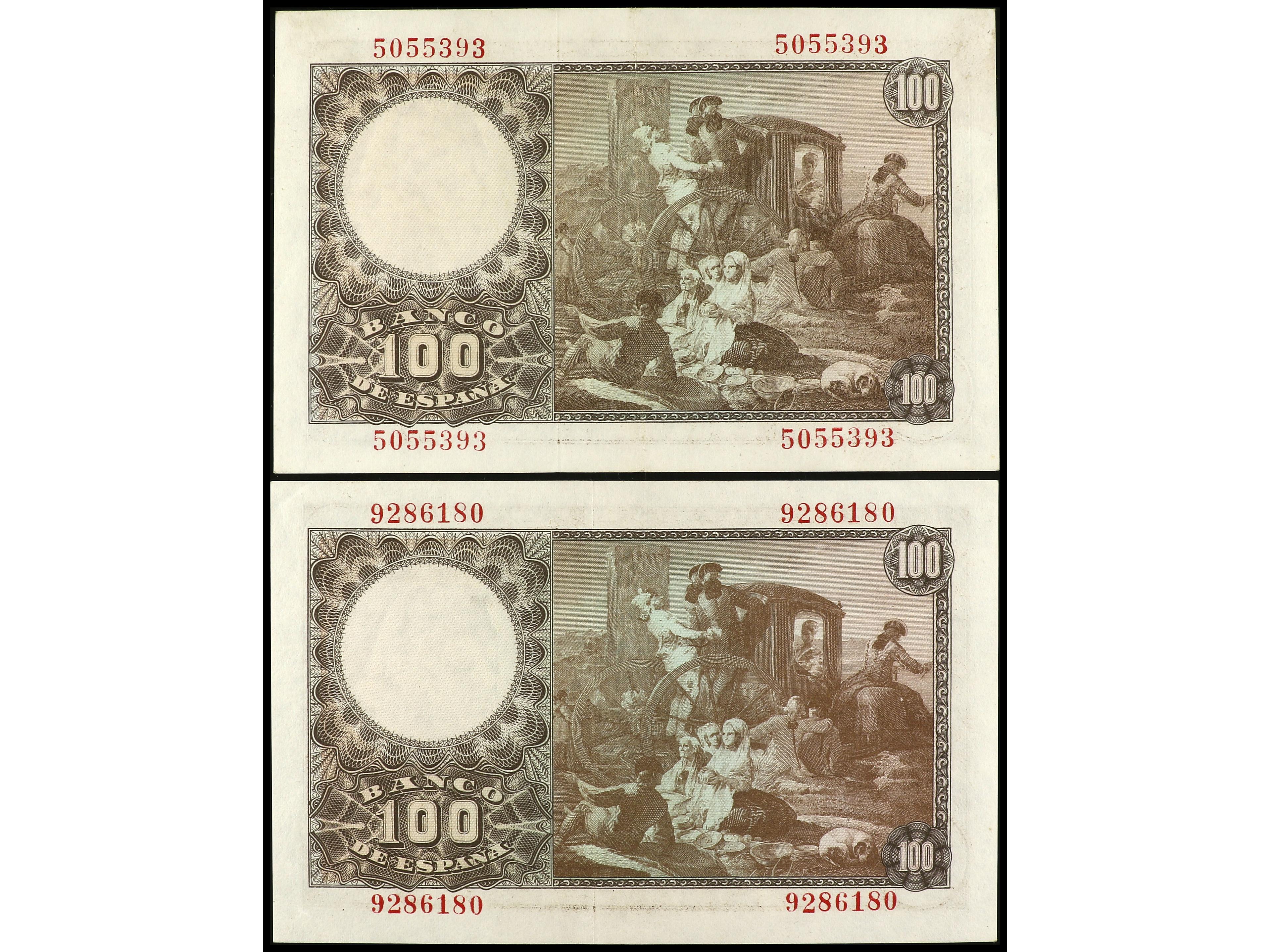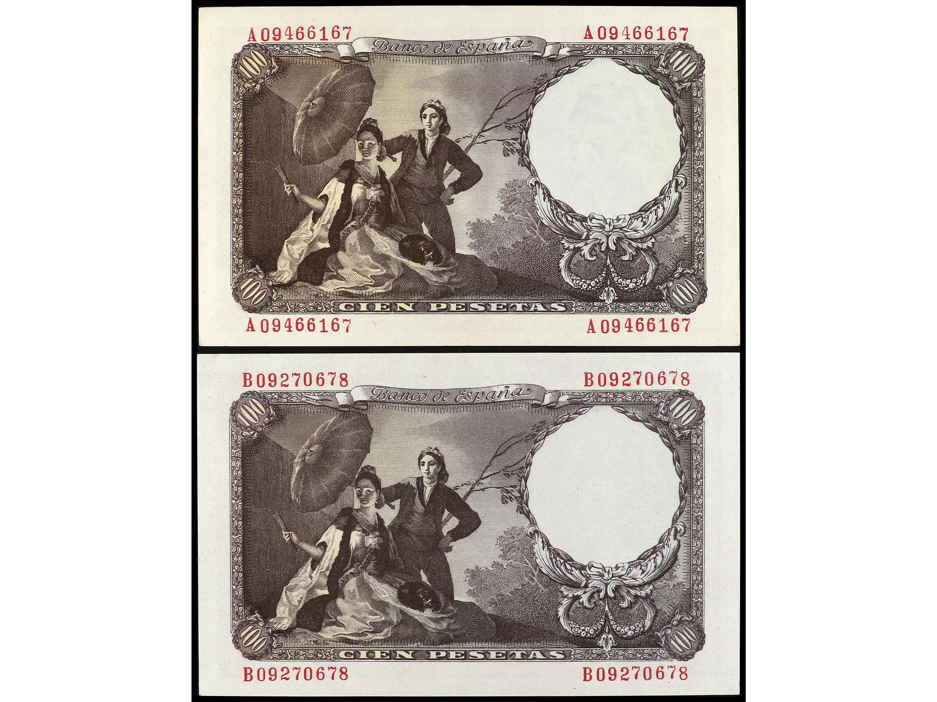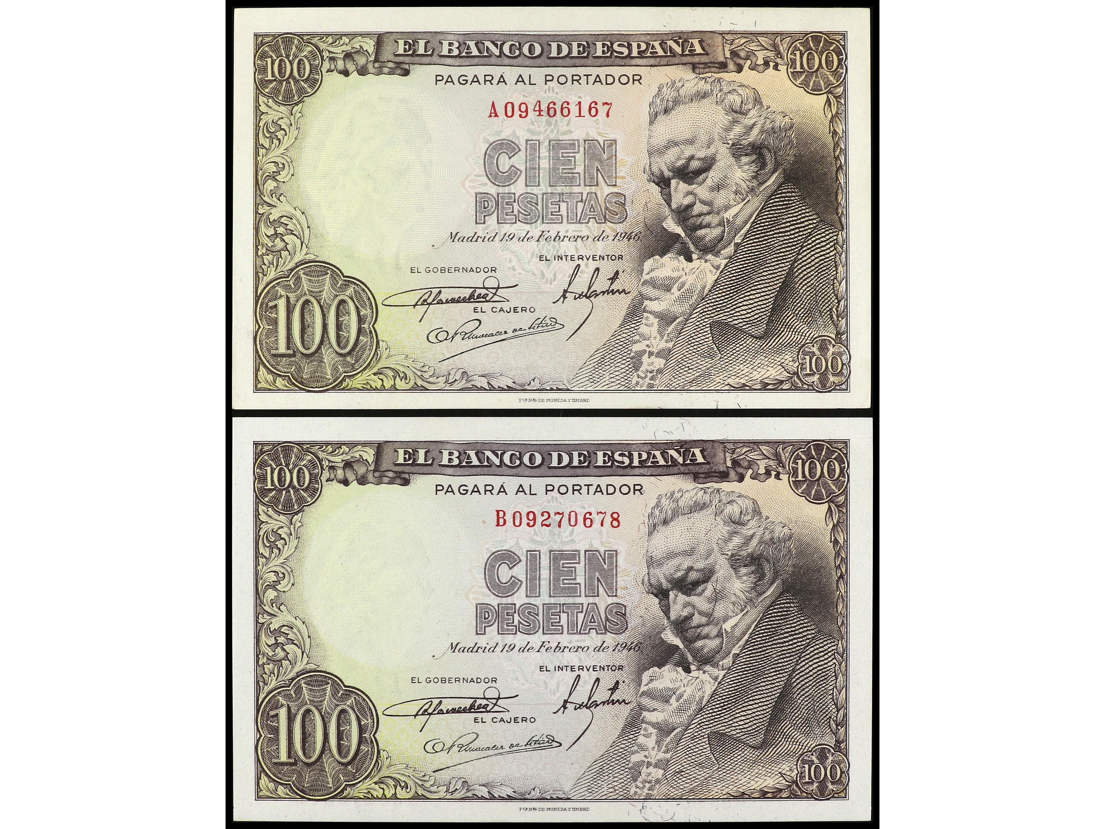 Lote 2 billetes 100 Pesetas. 19 Febrero 1946. Goya. Serie A y B. Ed-451a, 451b. EBC- y EBC+. (Image1) (Image2)