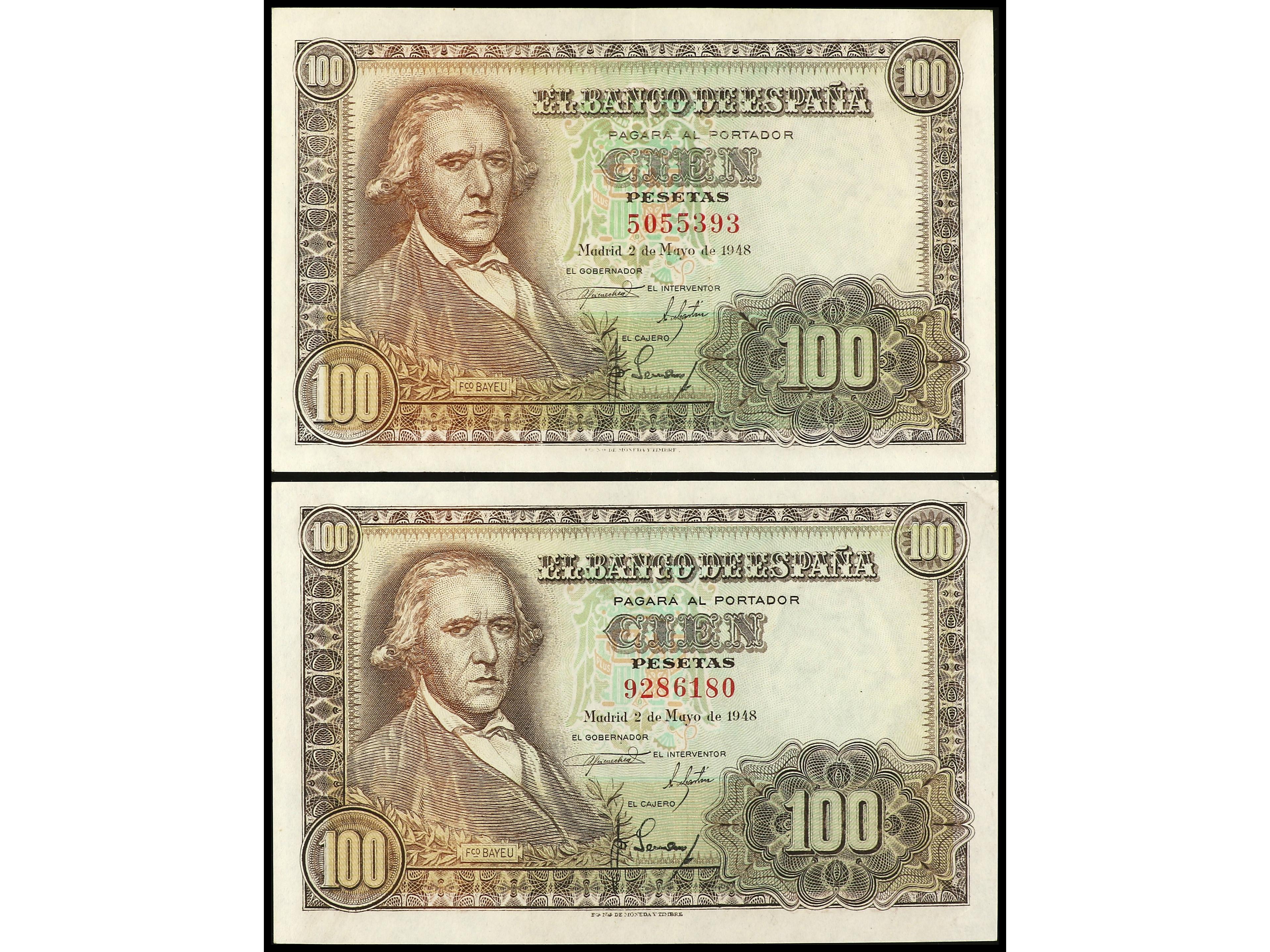 Lote 2 billetes 100 Pesetas. 2 Mayo 1948. Bayeu. Sin Serie. Ed-456. MBC+. (Image1) (Image2)