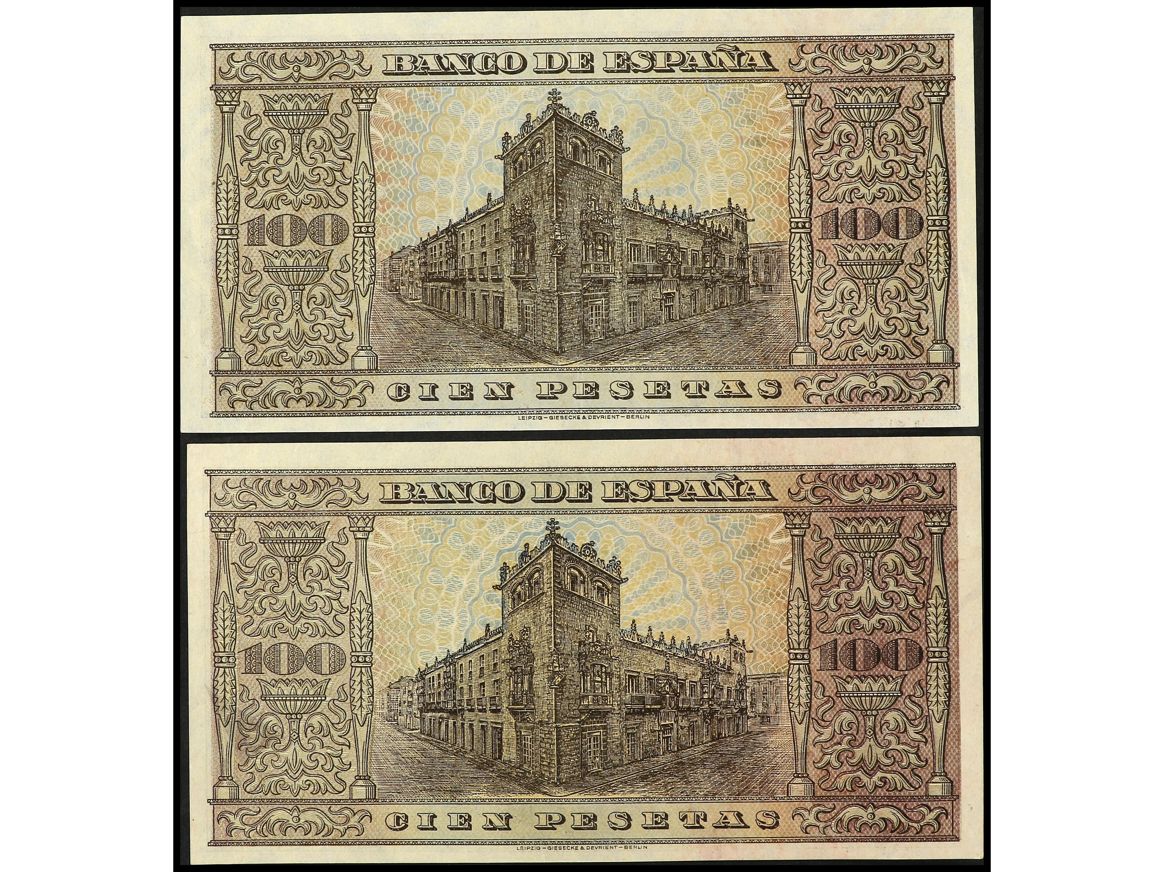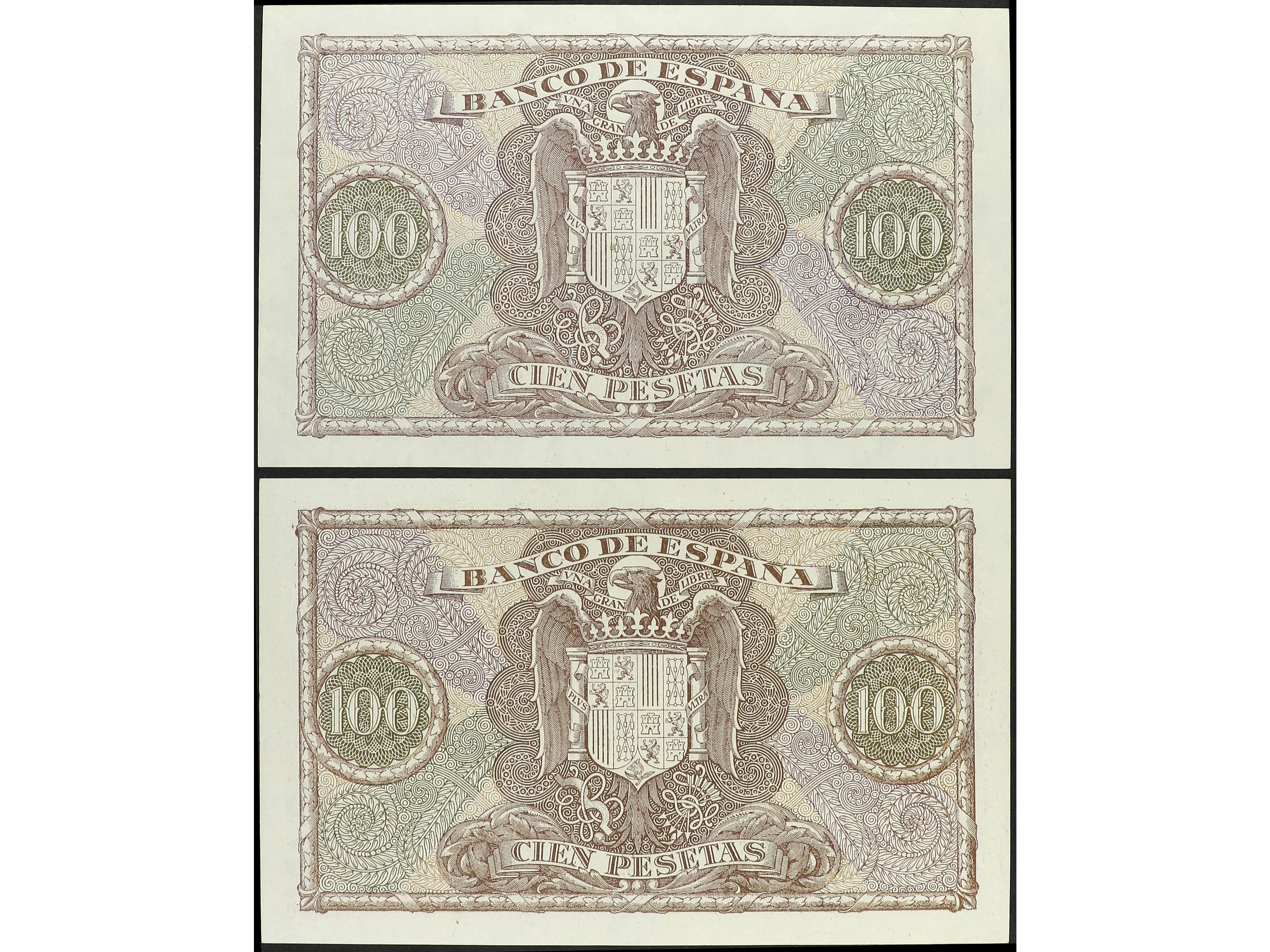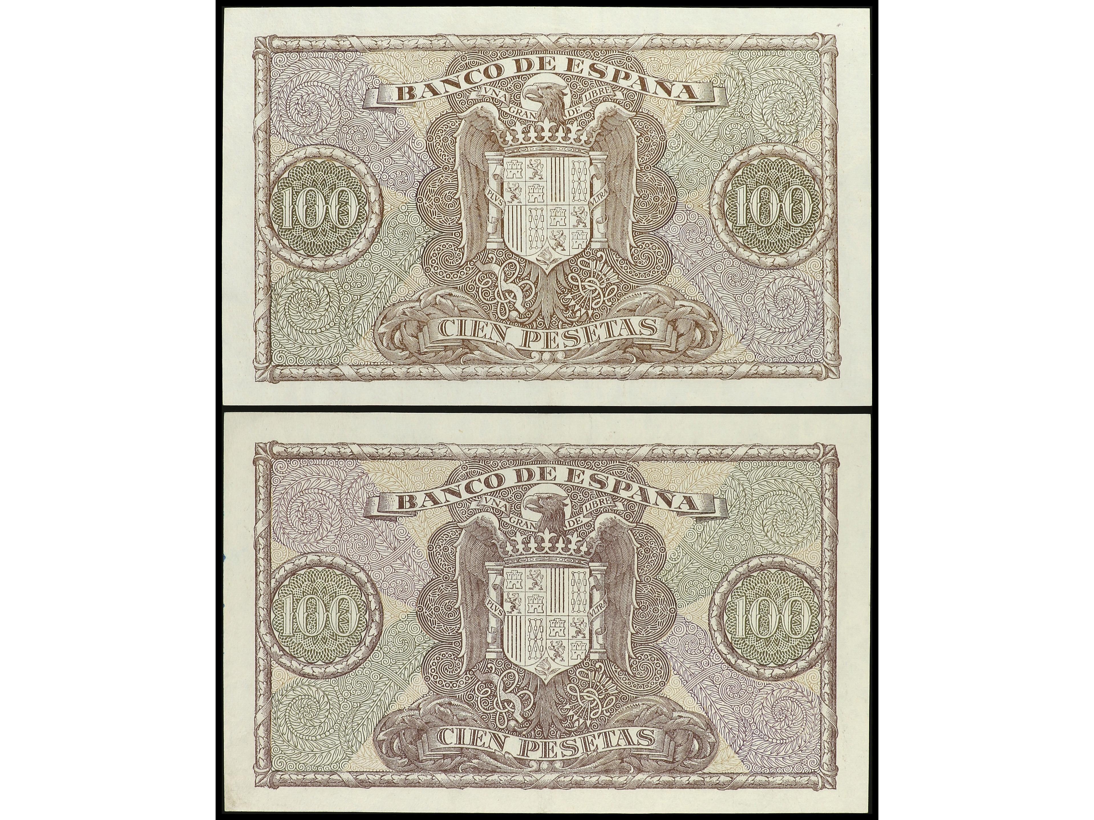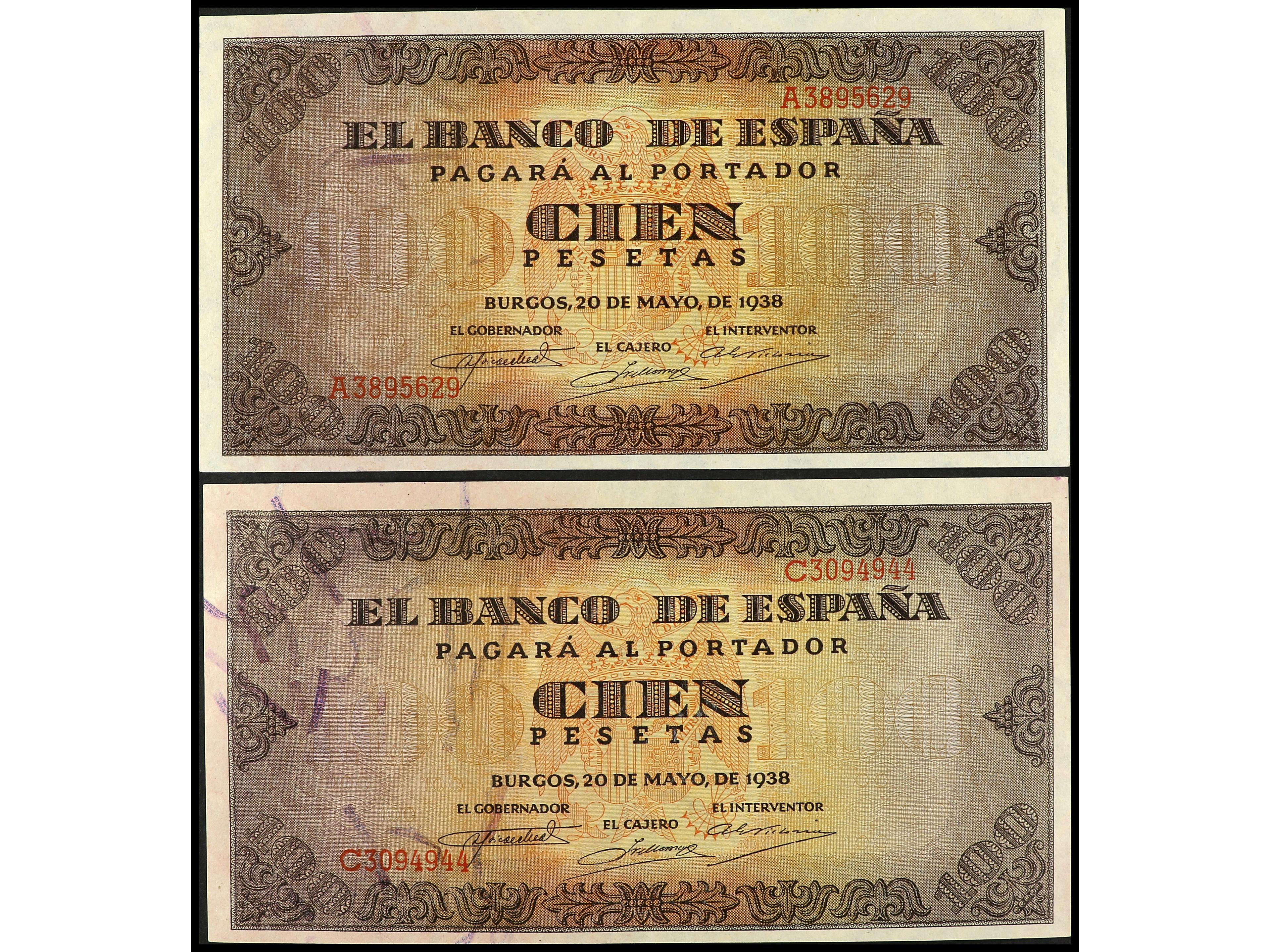 Lote 2 billetes 100 Pesetas. 20 Mayo 1938. Casa del Cordón. Serie A. Pareja correlativa. Ed-432. EBC. (Image1) (Image2)
