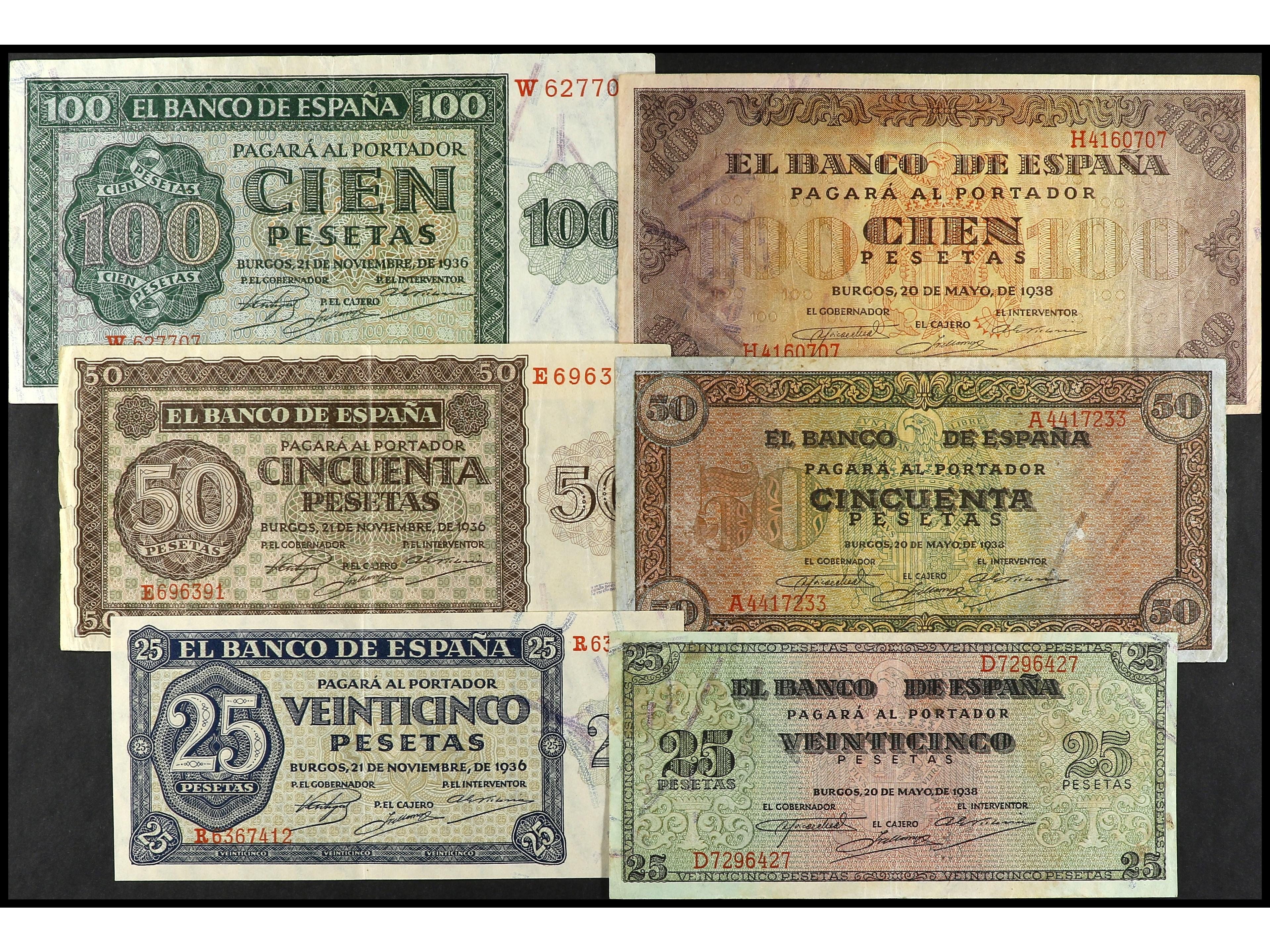 Lote 6 billetes 25 (2), 50 (2), 100 Pesetas (2). 1936 y 20 Mayo 1938. A EXAMINAR. Ed-419a, 420a, 421a, 430a, 431, 432b. MBC- a MBC+.
