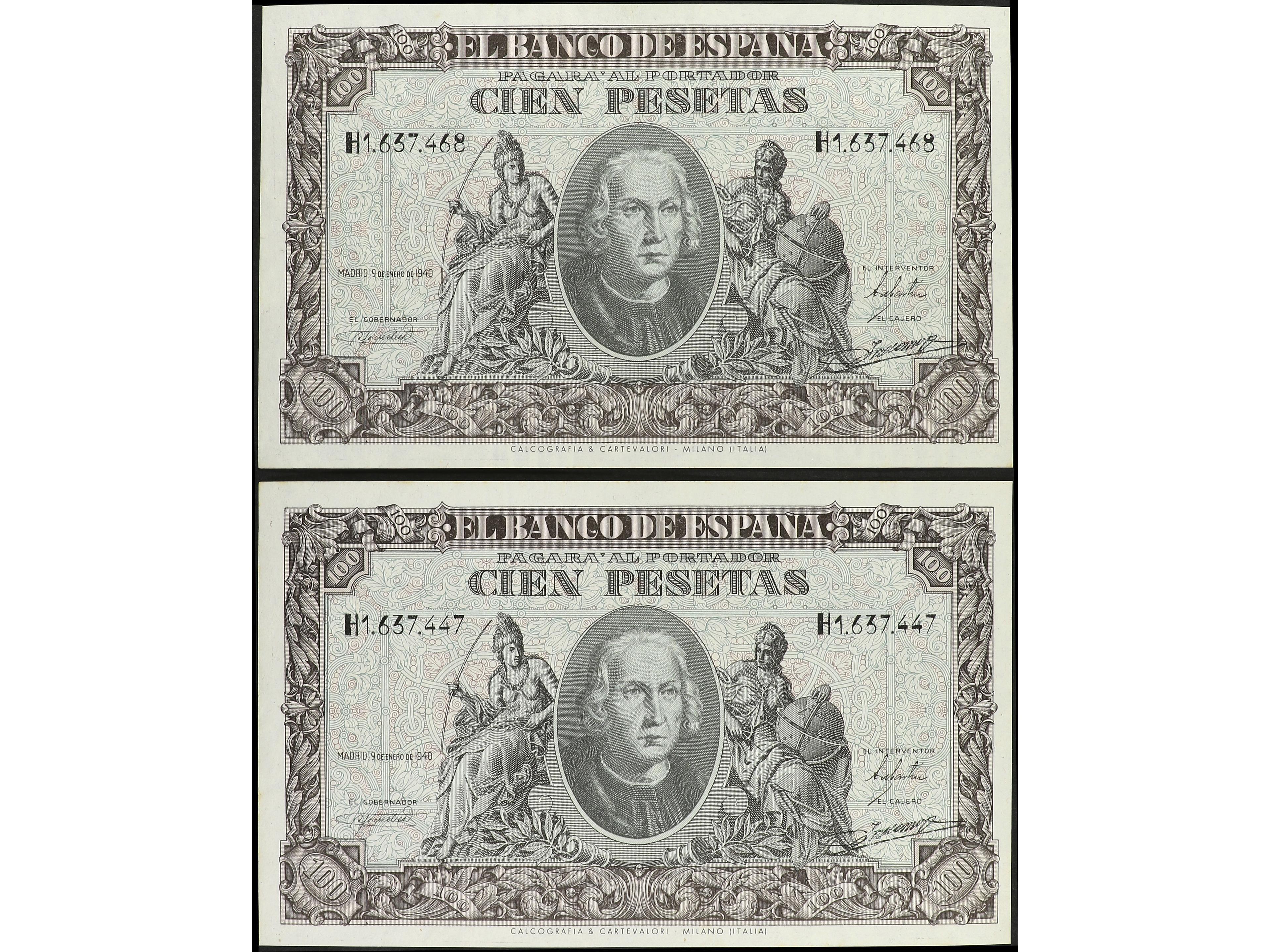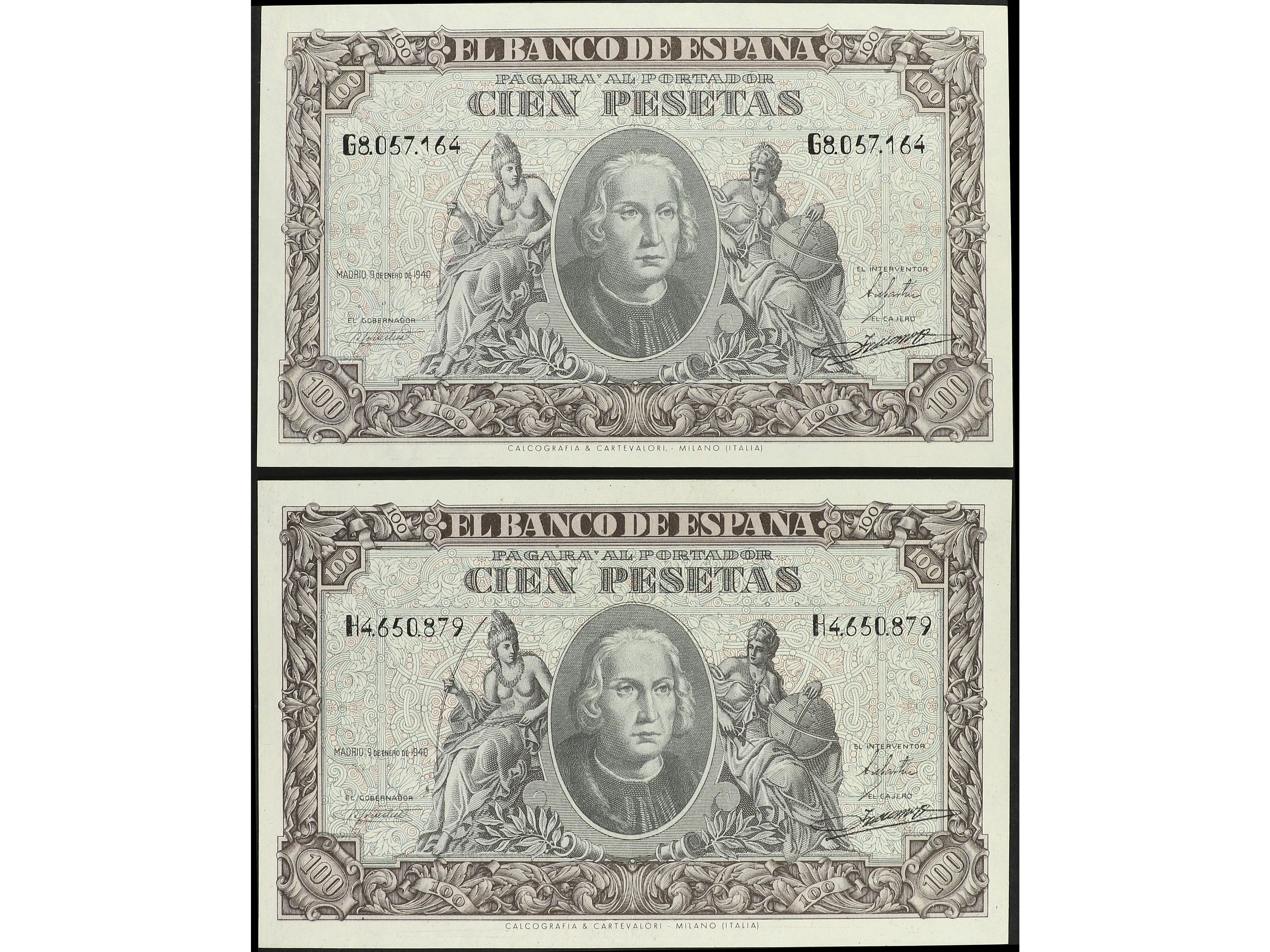 Lote 2 billetes 100 Pesetas. 9 Enero 1940. Colón. Series H y G. Ed-438a. EBC. (Image1) (Image2)