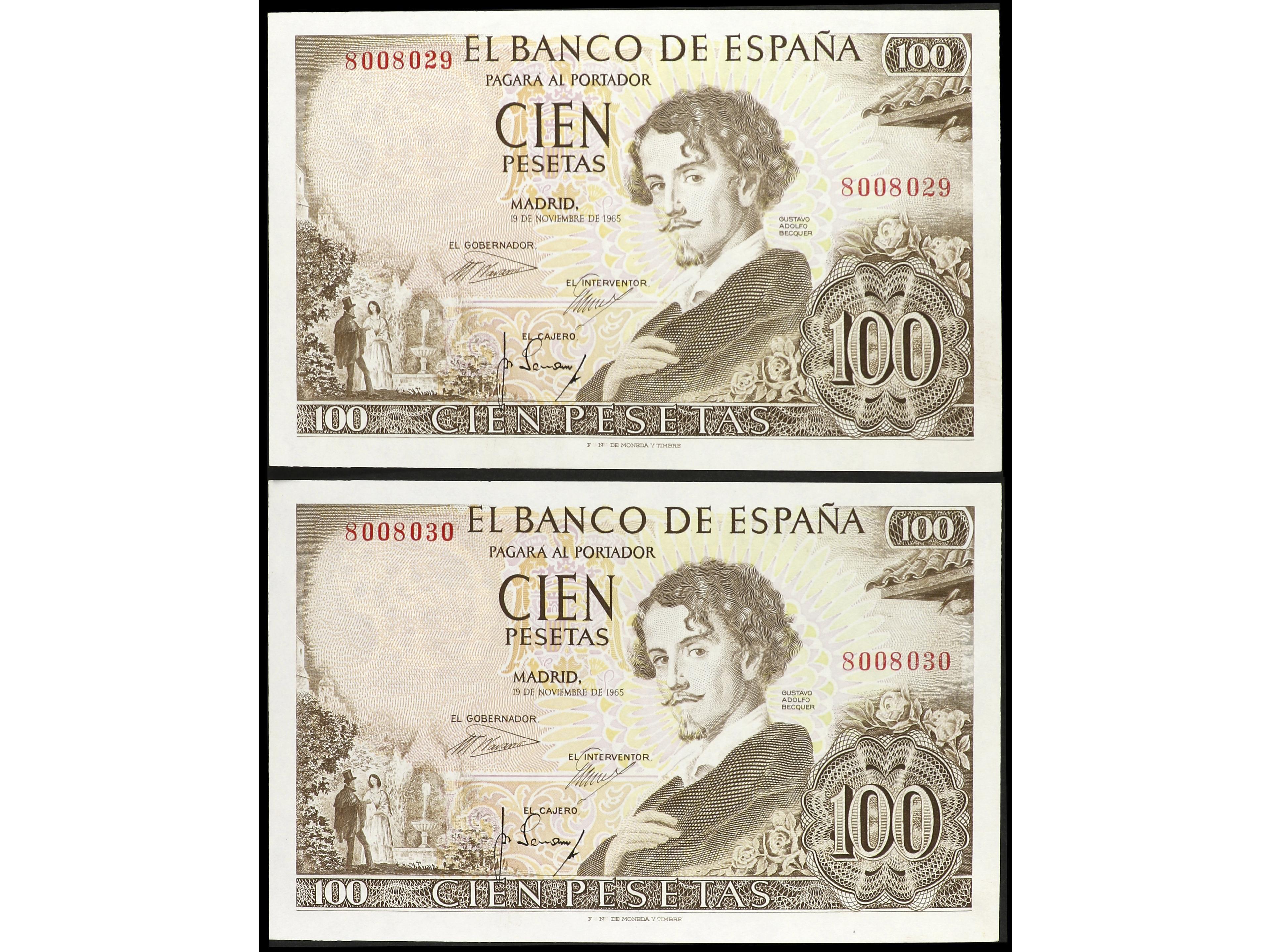 Lote 2 billetes 100 Pesetas. 19 Noviembre 1965. Bécquer. Sin Serie. Pareja correlativa. Ed-470. SC. (Image1)