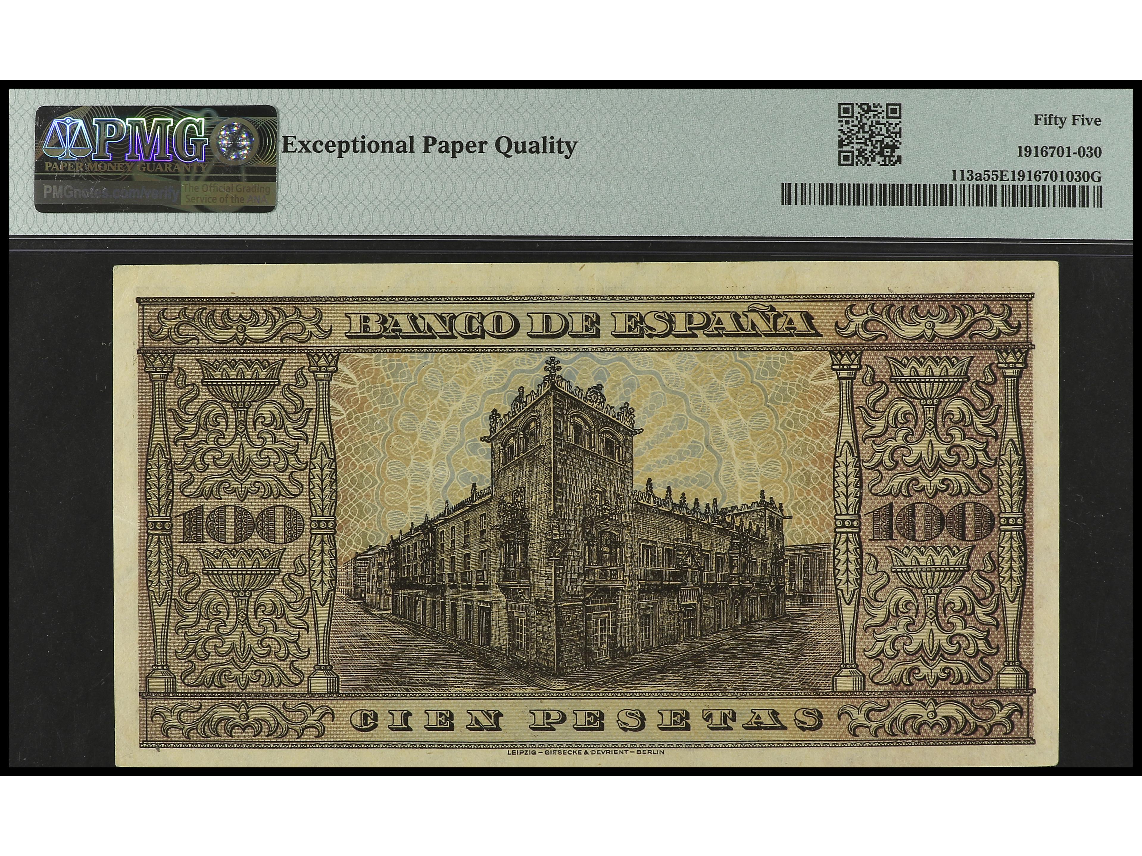 100 Pesetas. 20 Mayo 1938. Precintado y garantizado por PMG 55 EPQ ABOUT UNCIRCULATED (n. 1916701-030). Casa del Cordón. Serie A. Ed-432. EBC. (Image1) (Image2)
