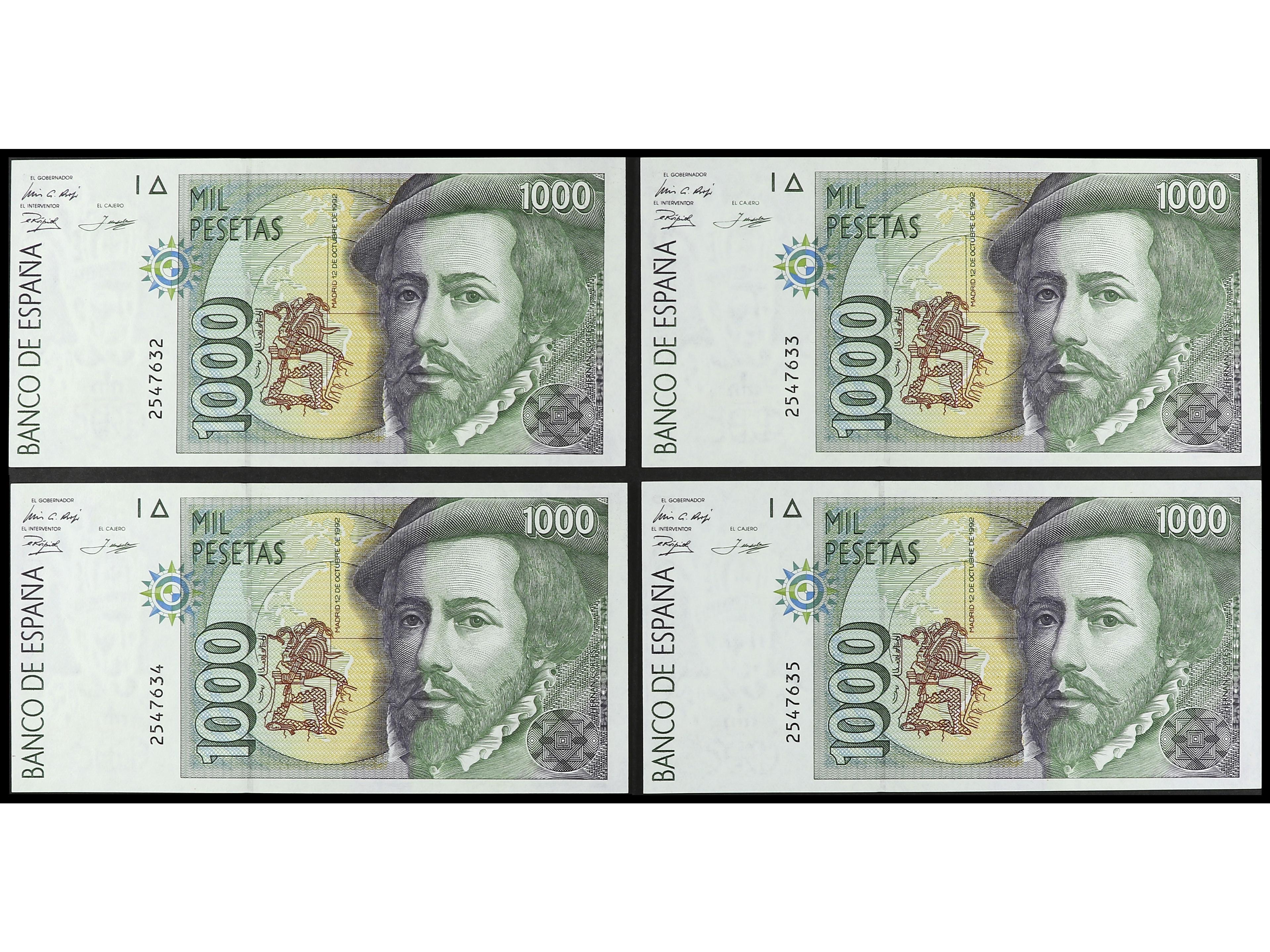 Lote 4 billetes 1.000 Pesetas. 12 Octubre 1992. Hernán Cortés. Sin Serie. Tipo I. Correlativos. Ed-483. SC. (Image1)