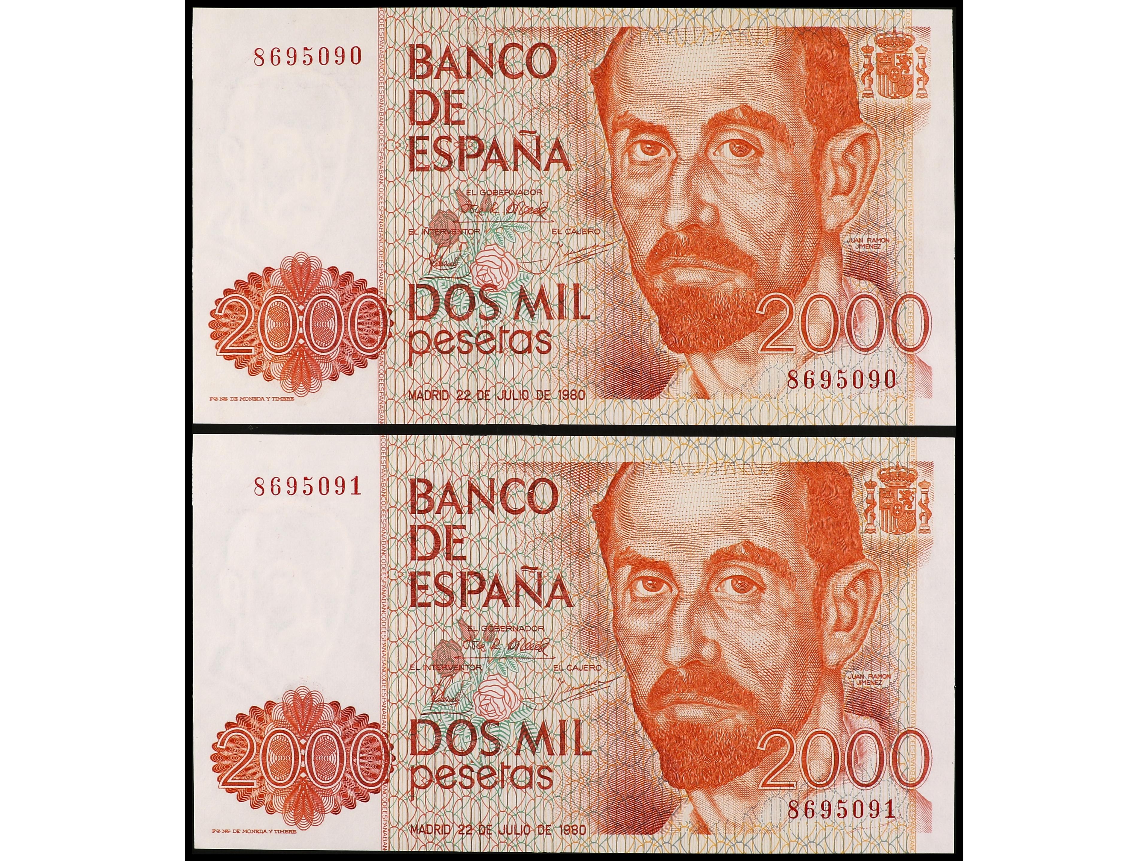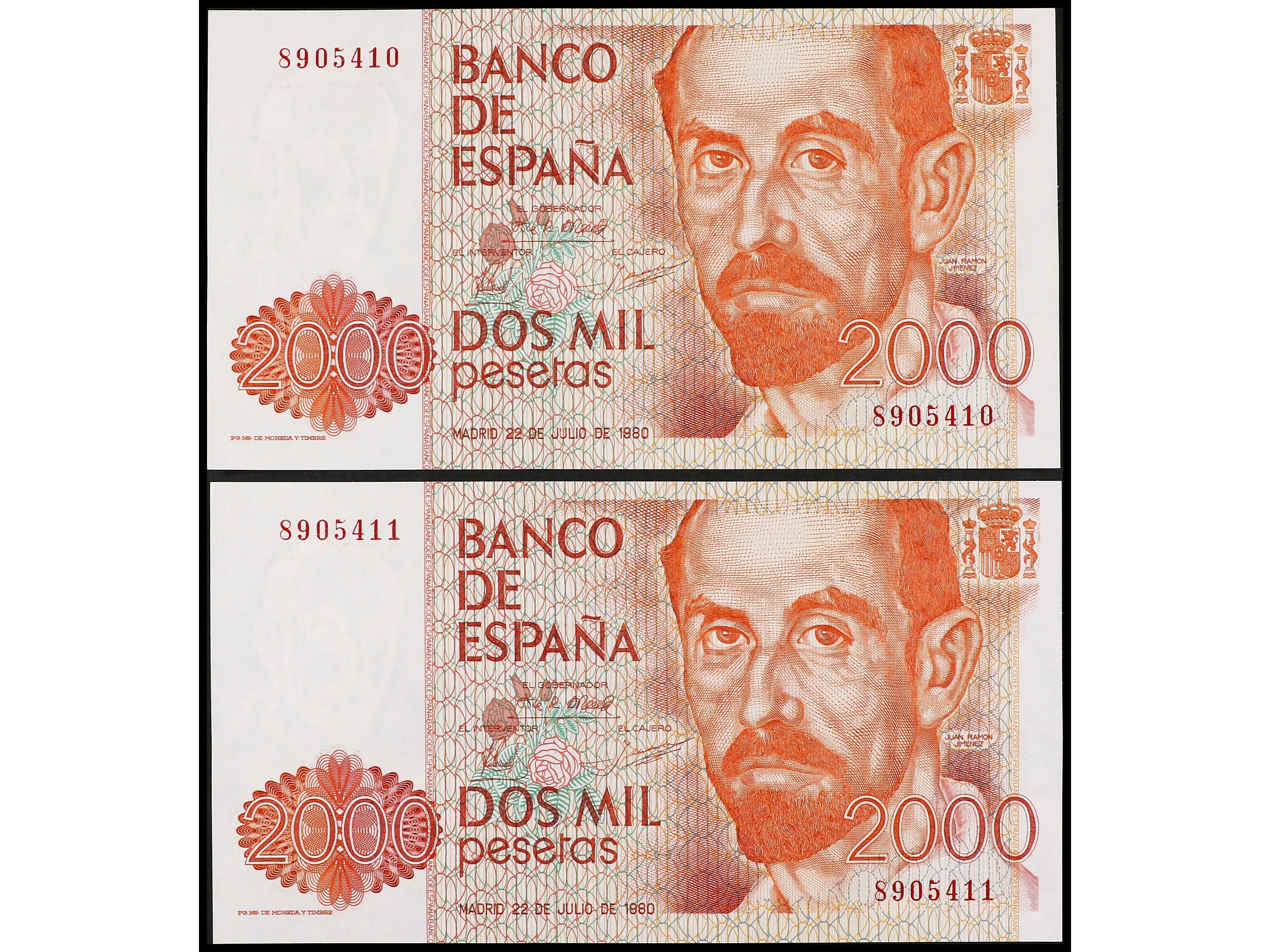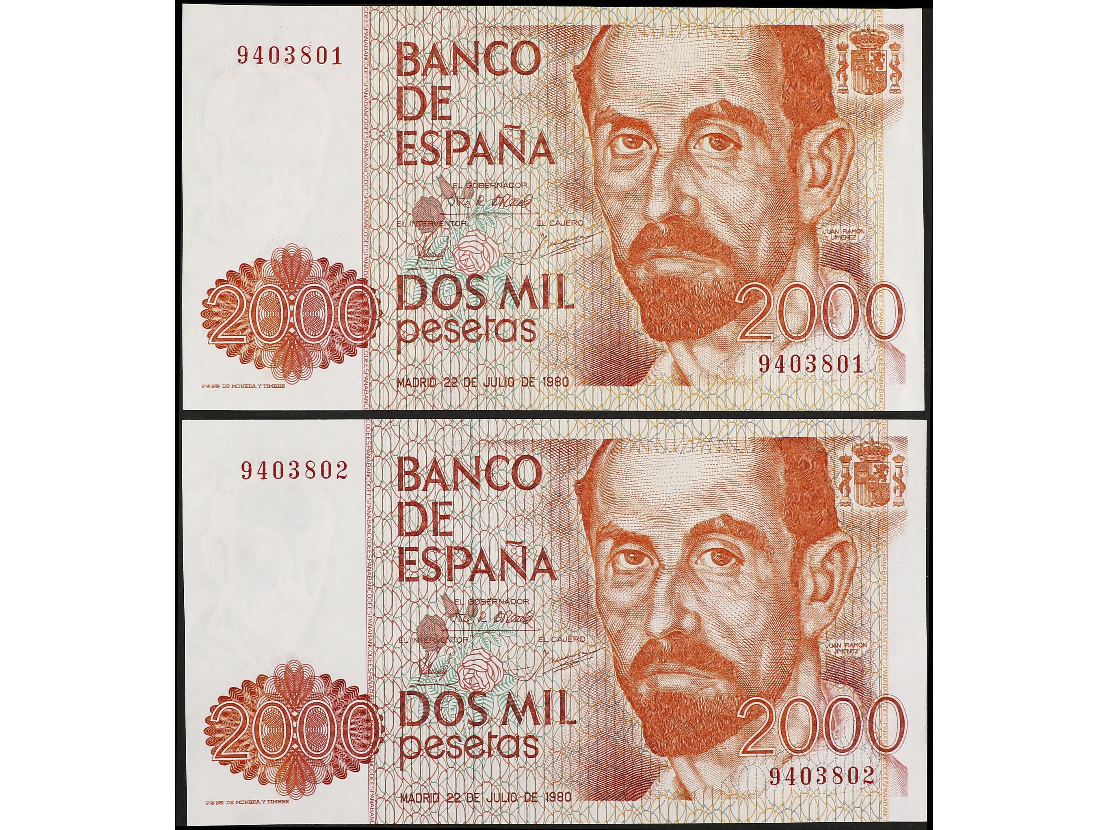 Lote 2 billetes 2.000 Pesetas. 22 Julio 1980. Juan Ramón Jimenez. Sin Serie. Pareja correlativa. Ed-479. SC. (Image1) (Image2)