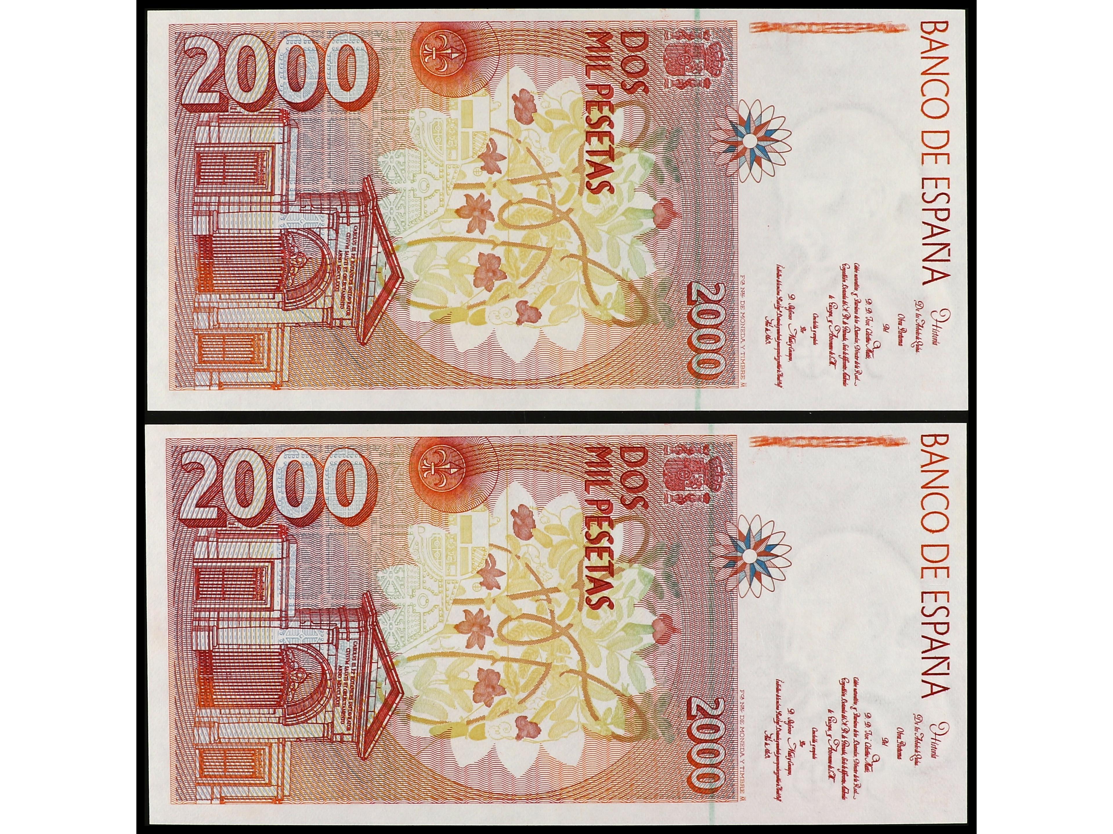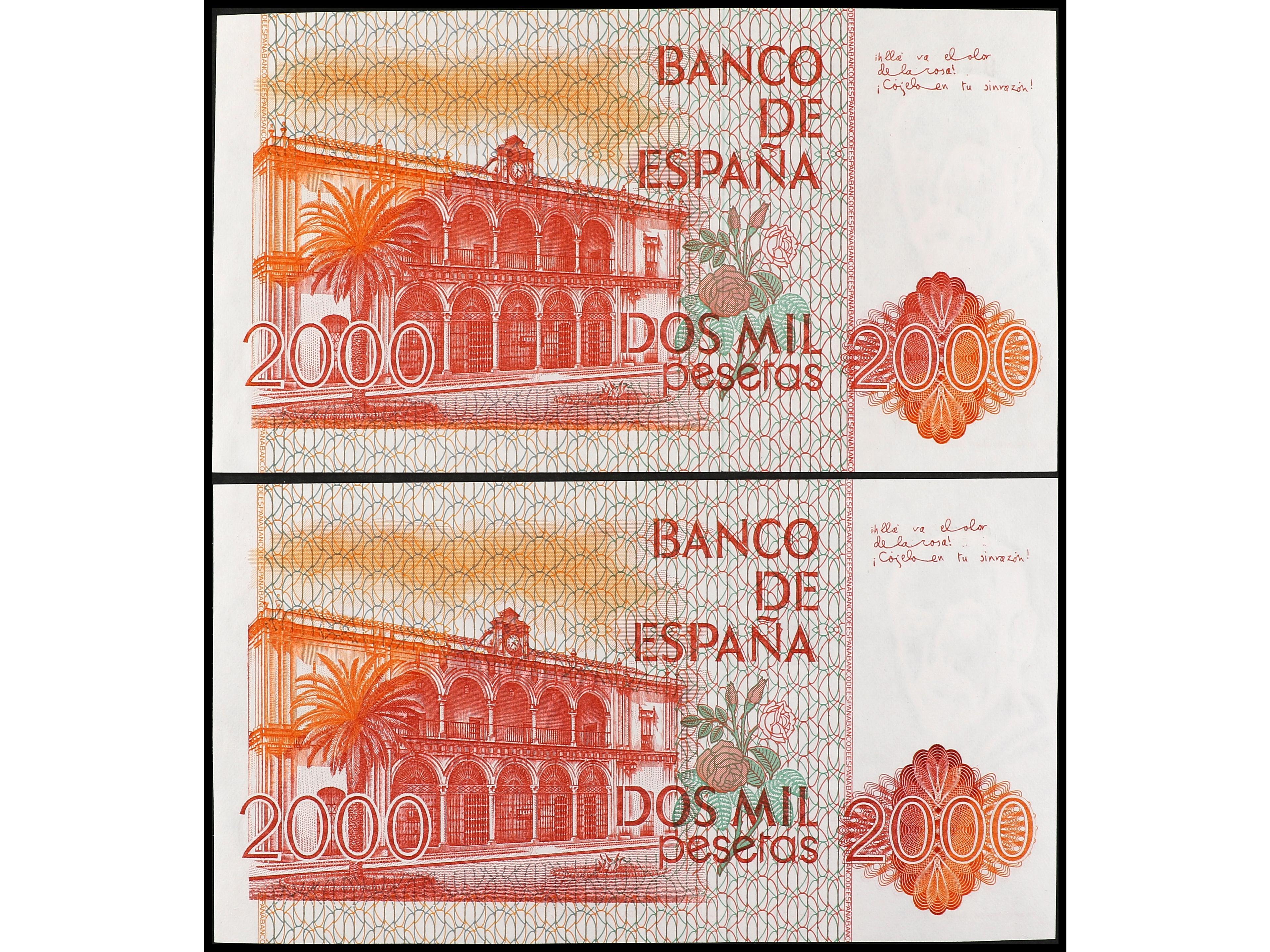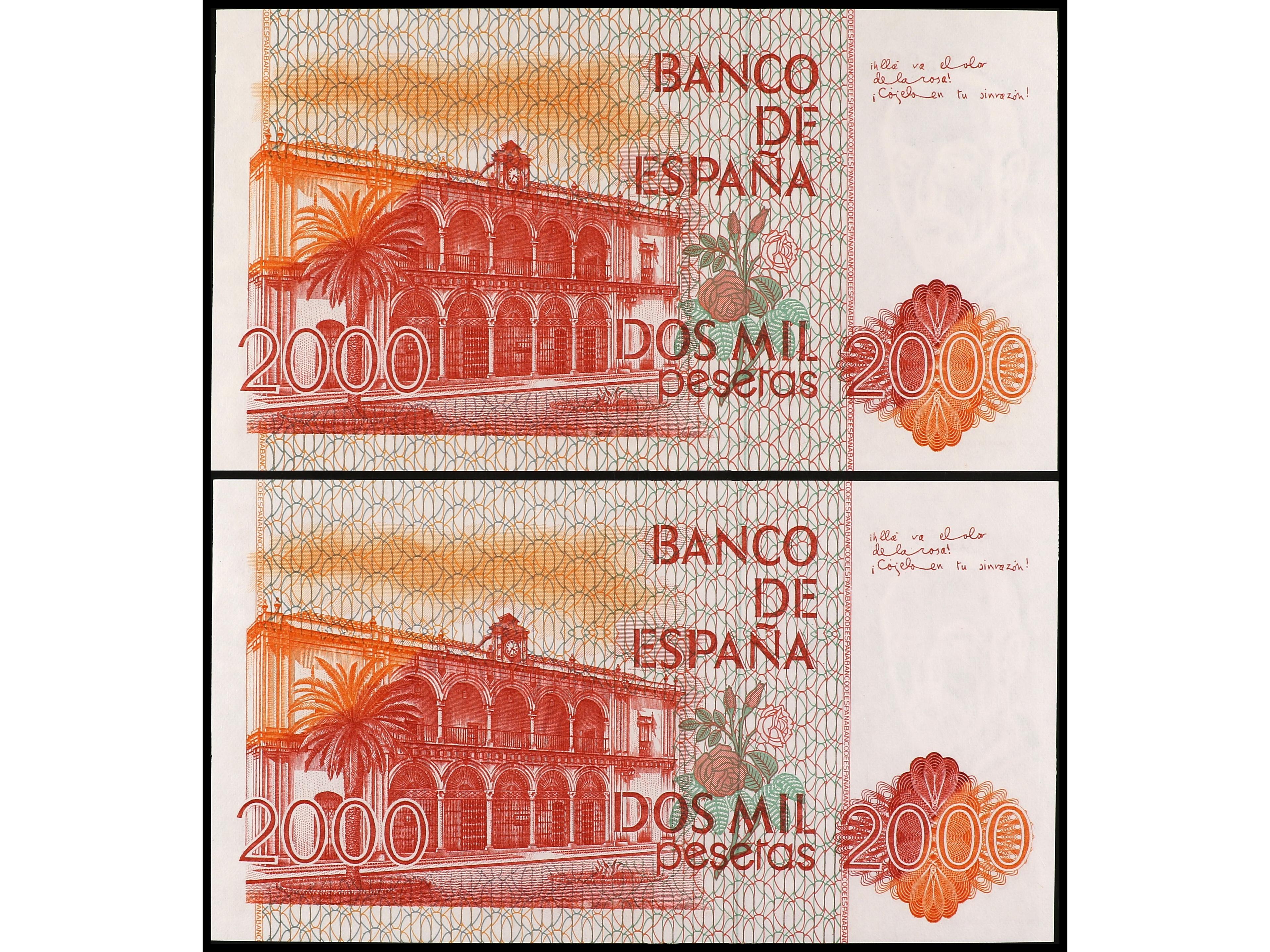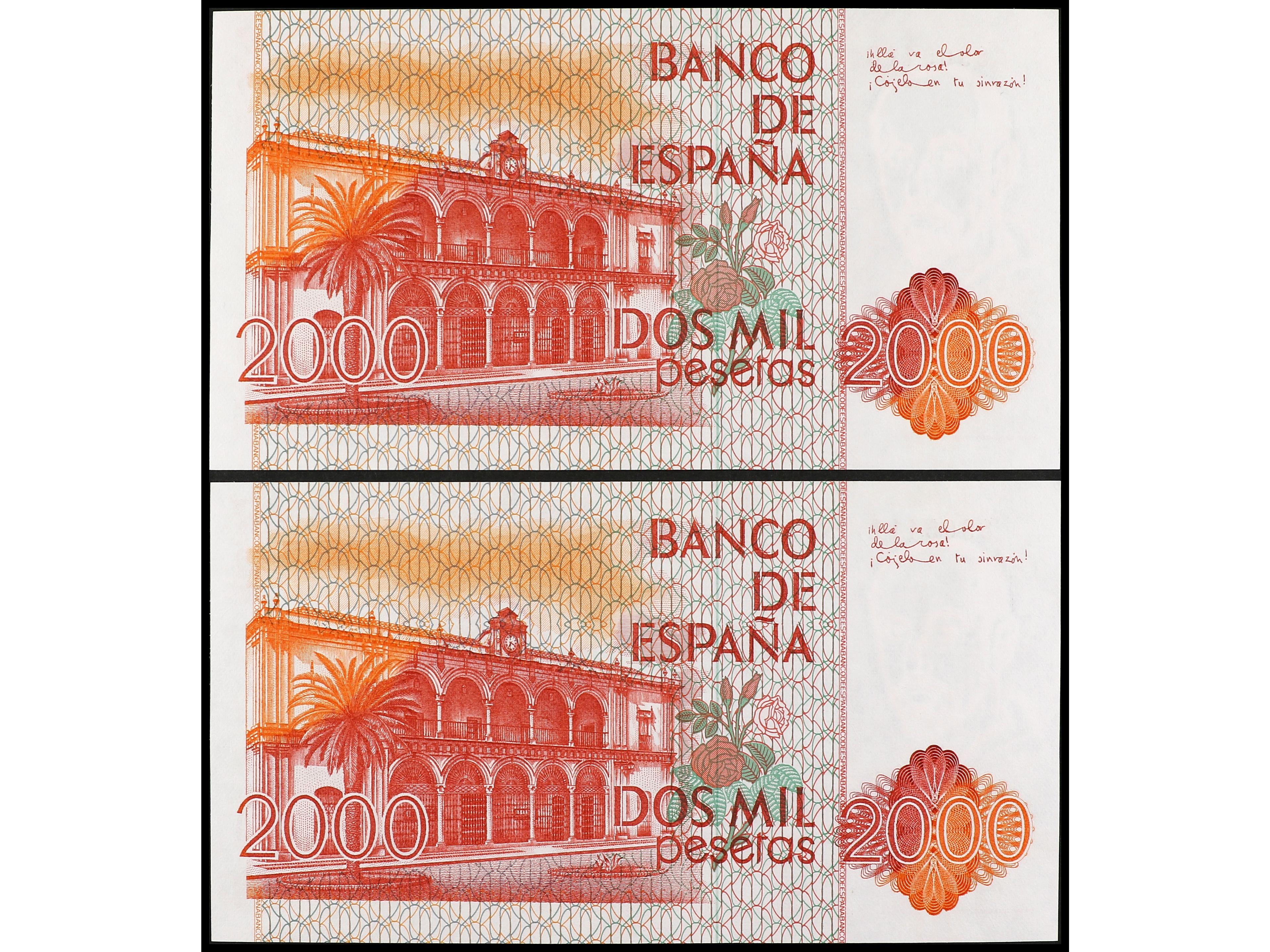 Lote 2 billetes 2.000 Pesetas. 22 Julio 1980. Juan Ramón Jimenez. Sin Serie. Pareja correlativa. Ed-479. SC. (Image1) (Image2)