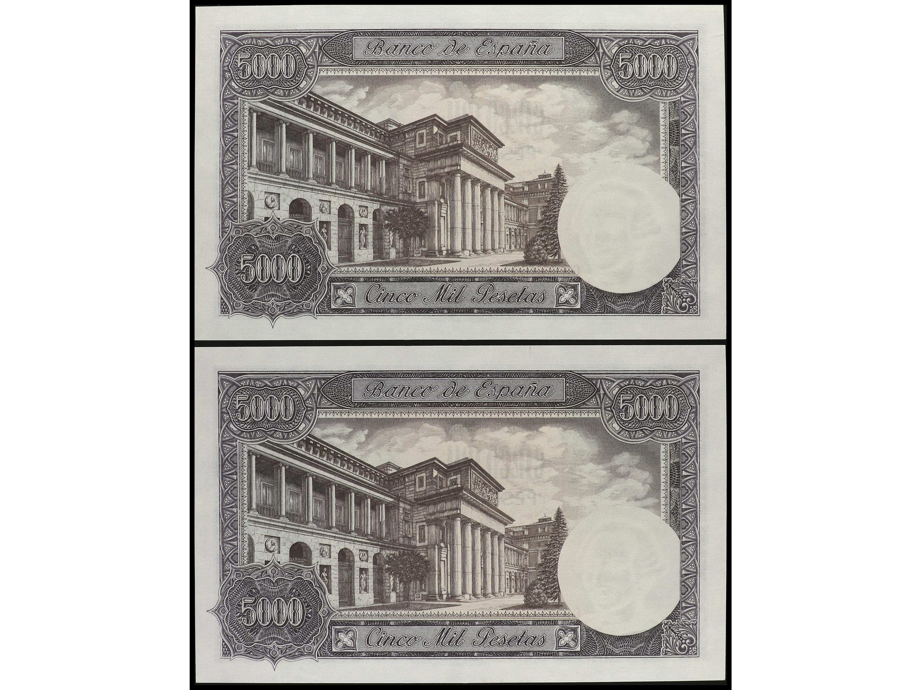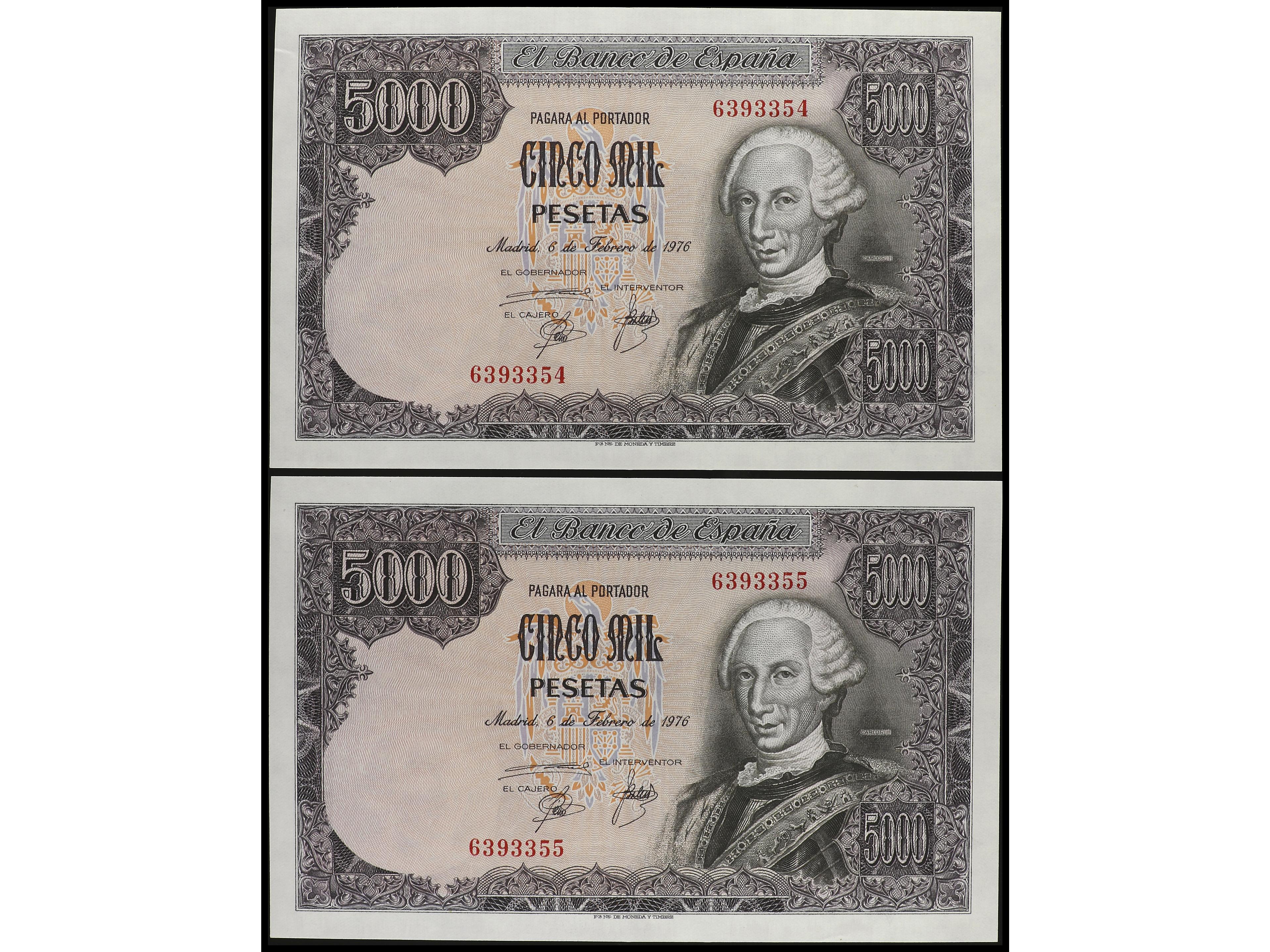 Lote 2 billetes 5.000 Pesetas. 6 Febrero 1976. Carlos III. Sin Serie. Pareja correlativa. Ed-475. SC. (Image1) (Image2)