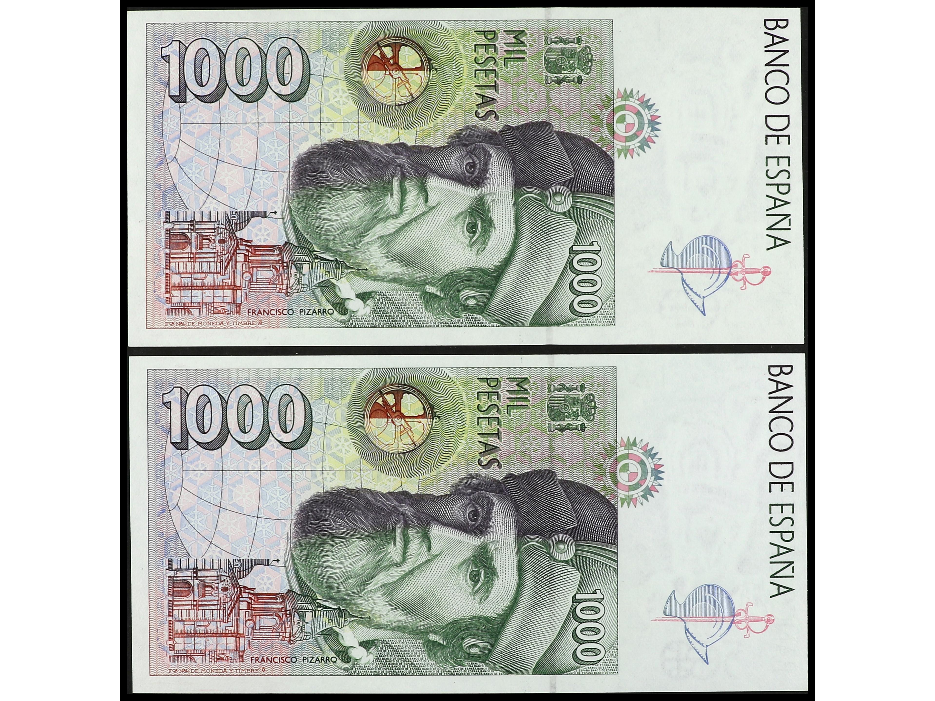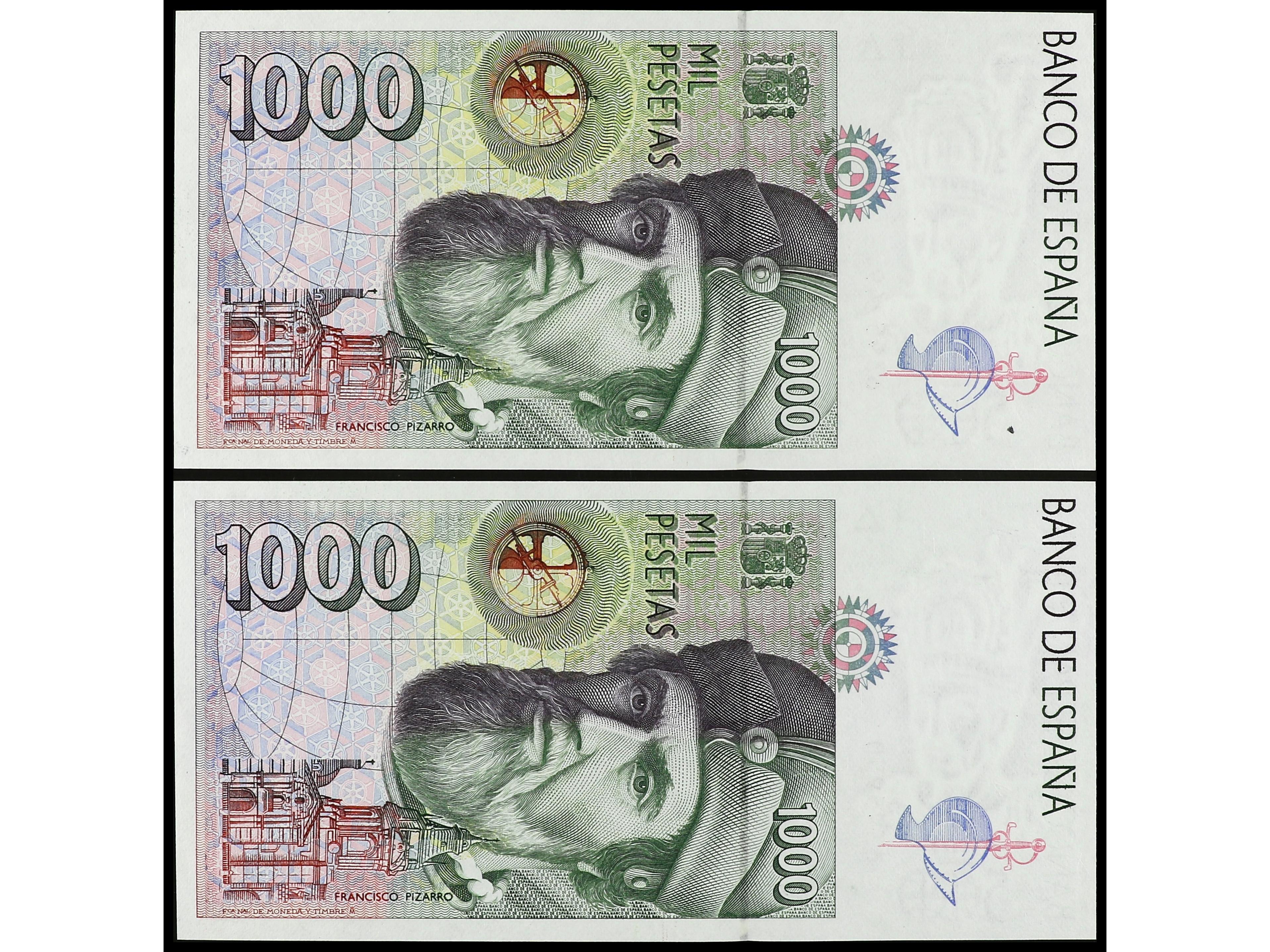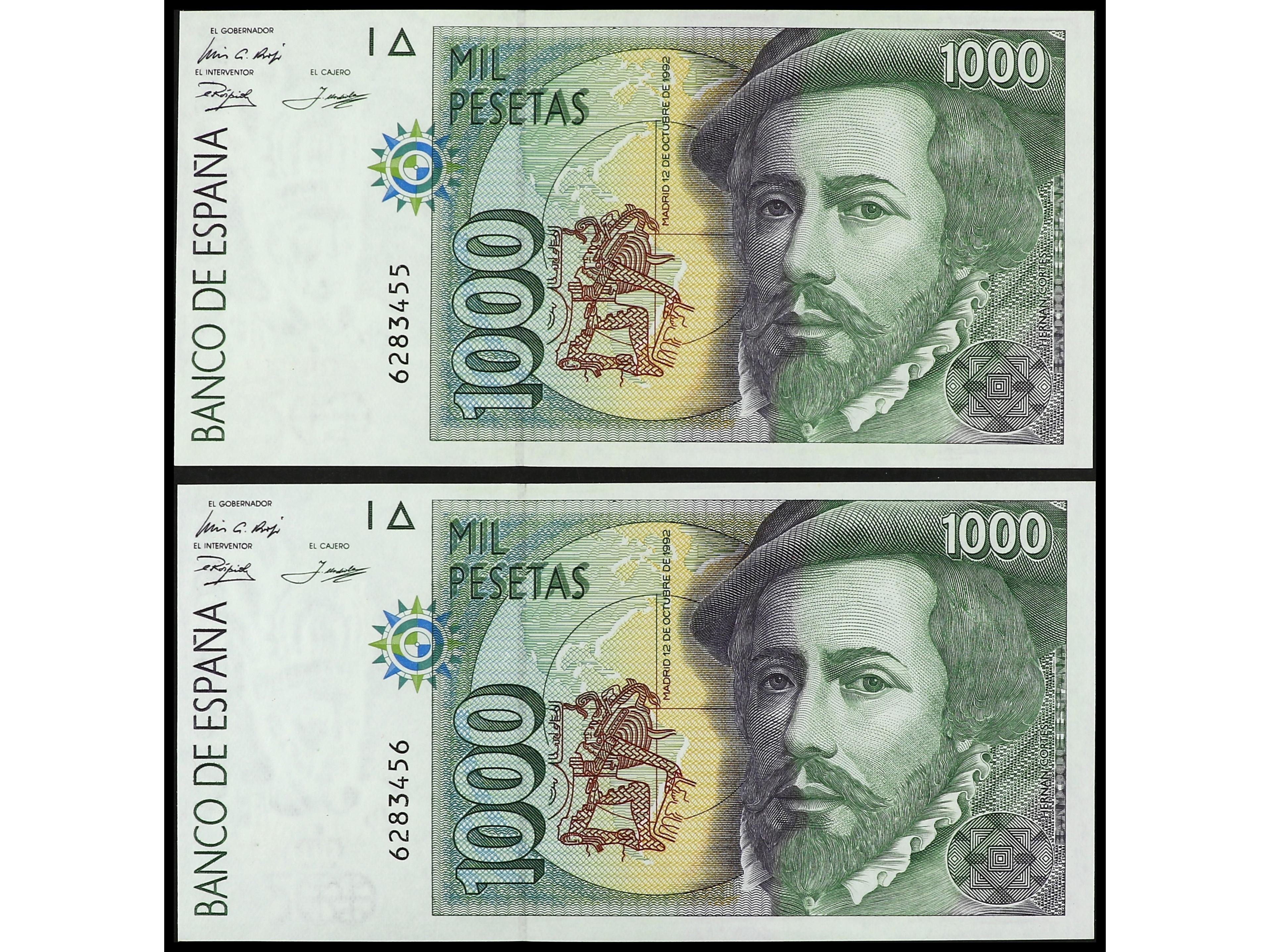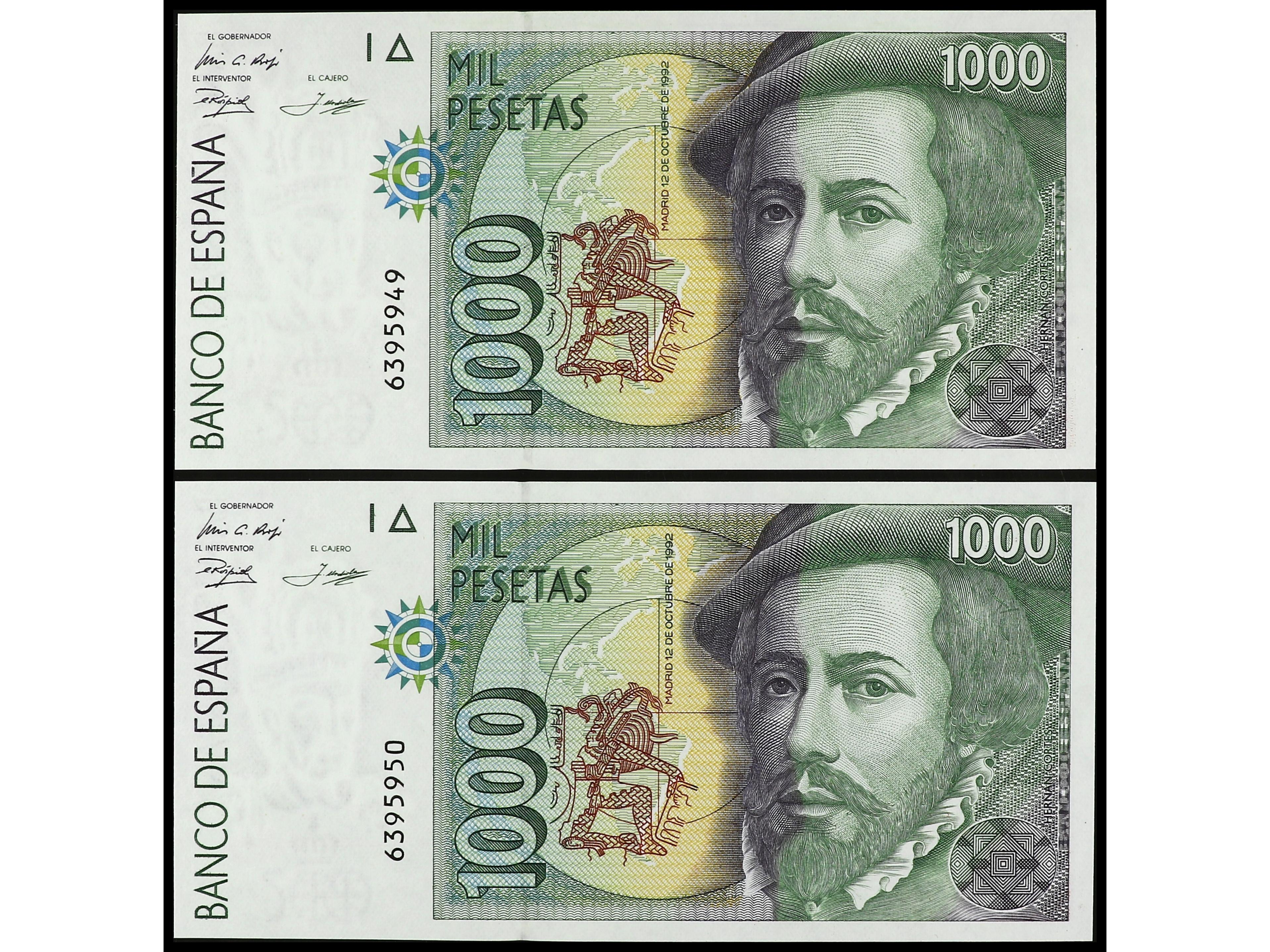 Lote 2 billetes 1.000 Pesetas. 12 Octubre 1992. Hernán Cortés. Sin Serie. Tipo I. Pareja correlativa. Ed-483. SC. (Image1) (Image2)