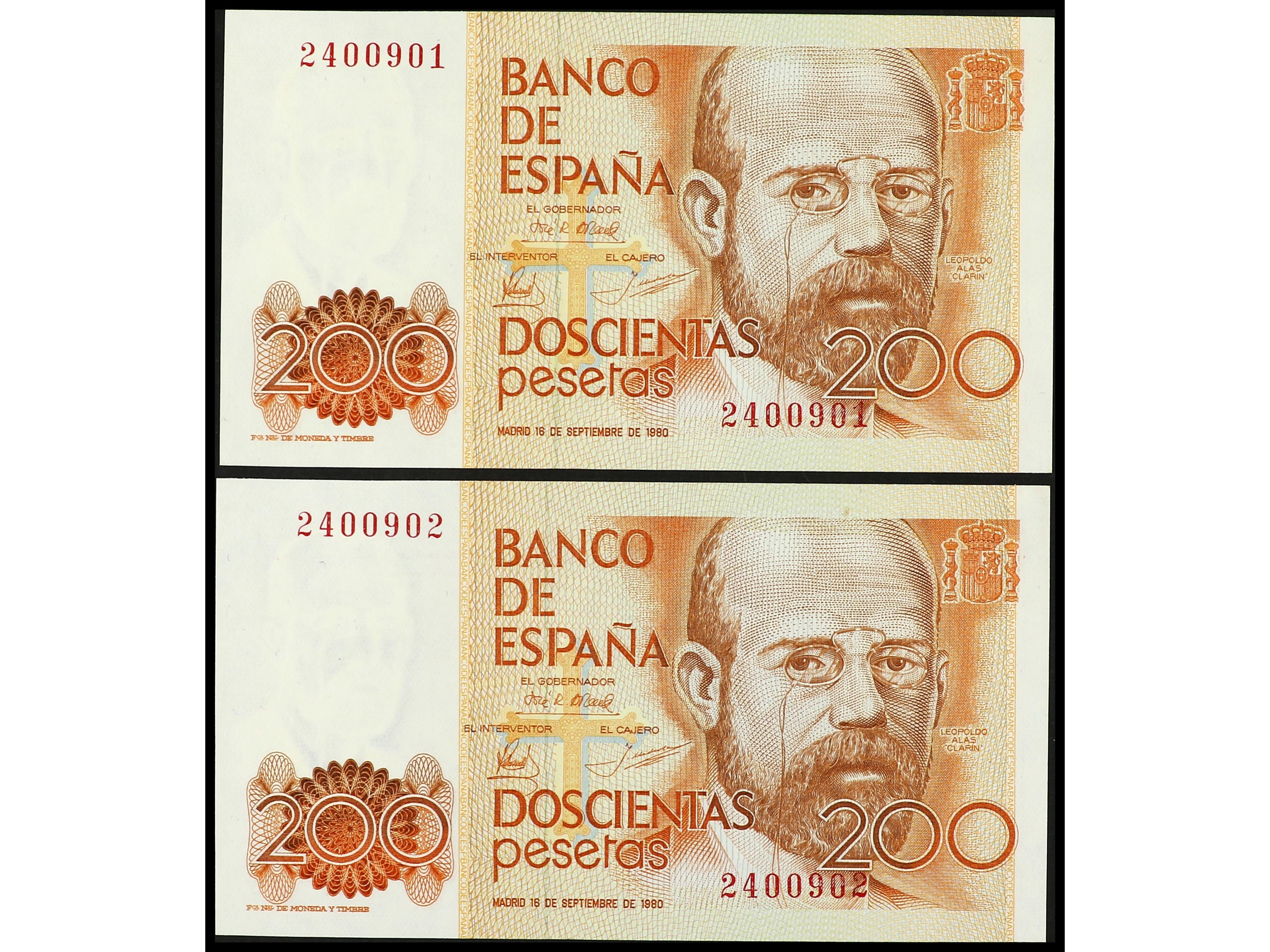 Lote 2 billetes 200 Pesetas. 16 Septiembre 1980. Clarín. Sin Serie. Pareja correlativa. Ed-480. SC. (Image1) (Image2)