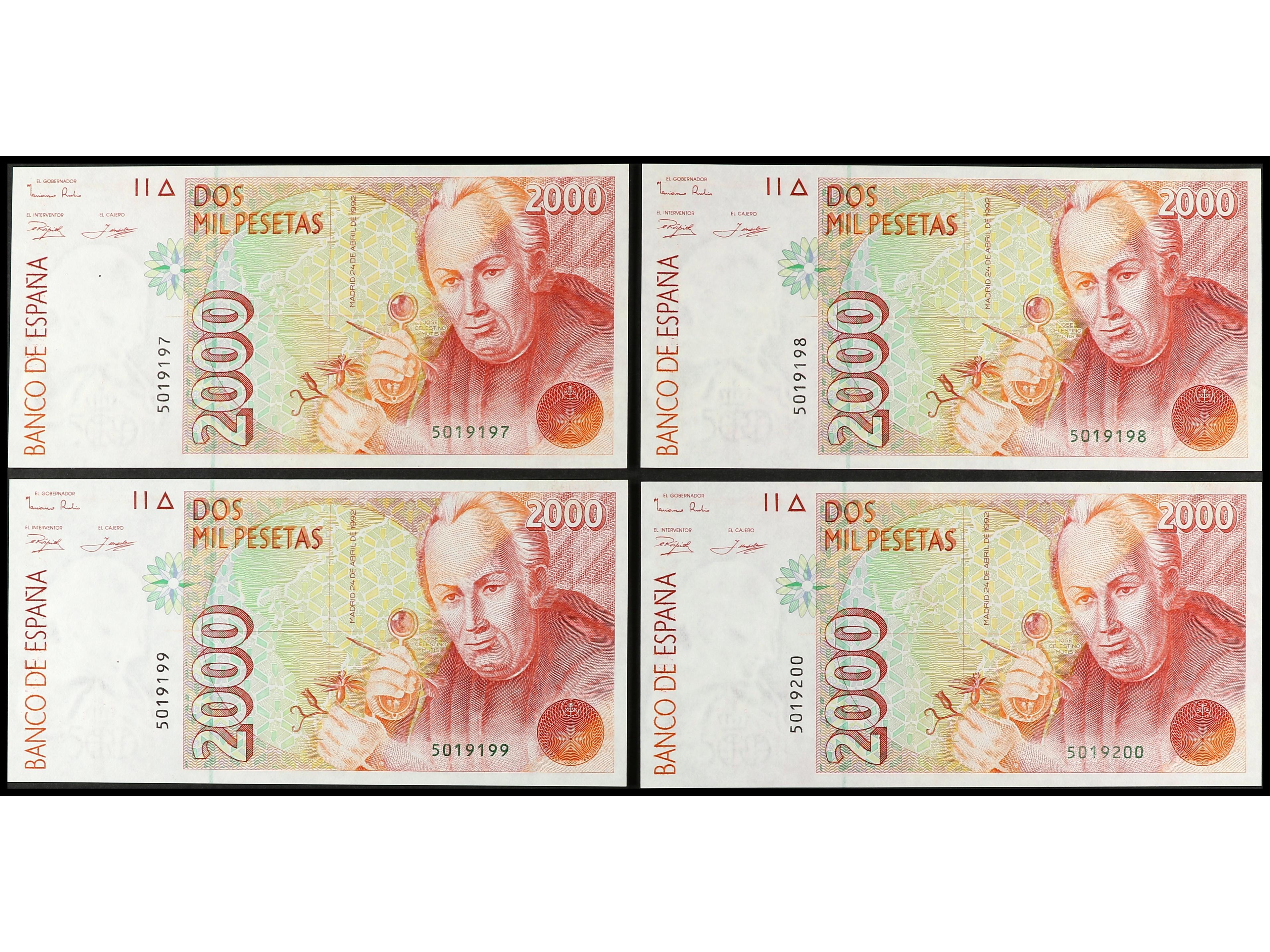 Lote 4 billetes 2.000 Pesetas. 24 Abril 1992. Celestino Mutis. Sin Serie. Todos correlativos. Ed-482. SC. (Image1)