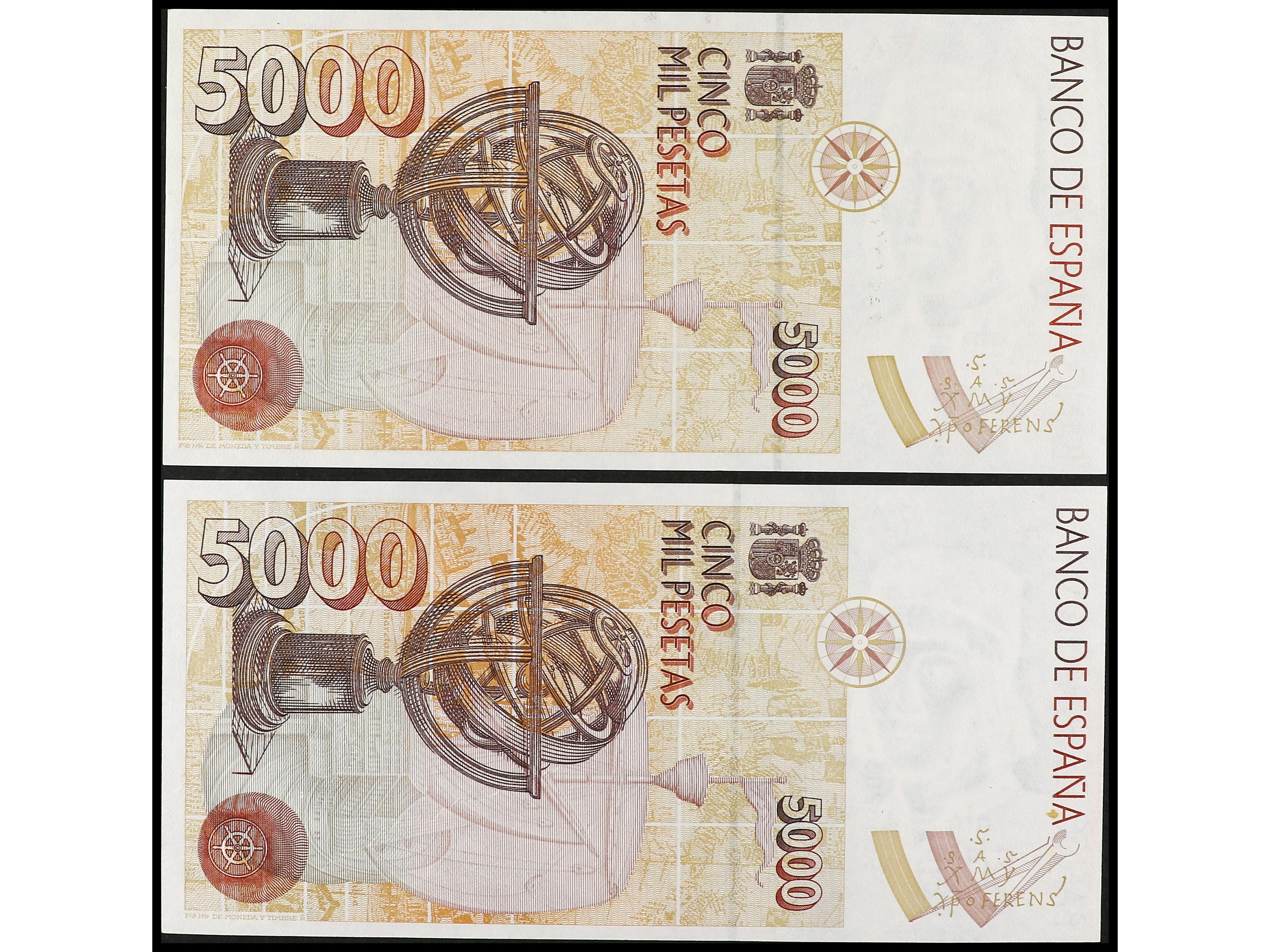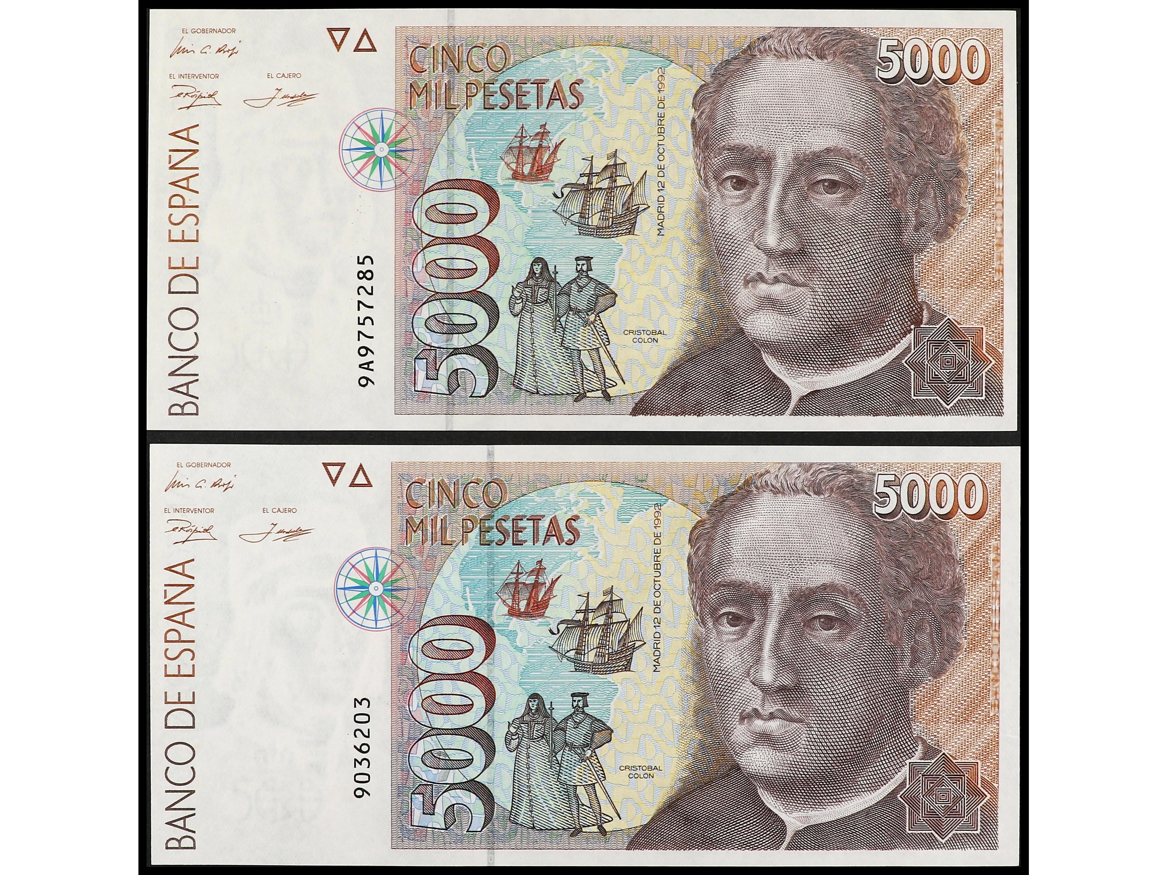 3246 imageLote 2 billetes 5.000 Pesetas. 12 Octubre 1992. Colón. Sin Serie y Serie 9A. Ed-484 y 484b. EBC a SC-. (Image1) (Image2)