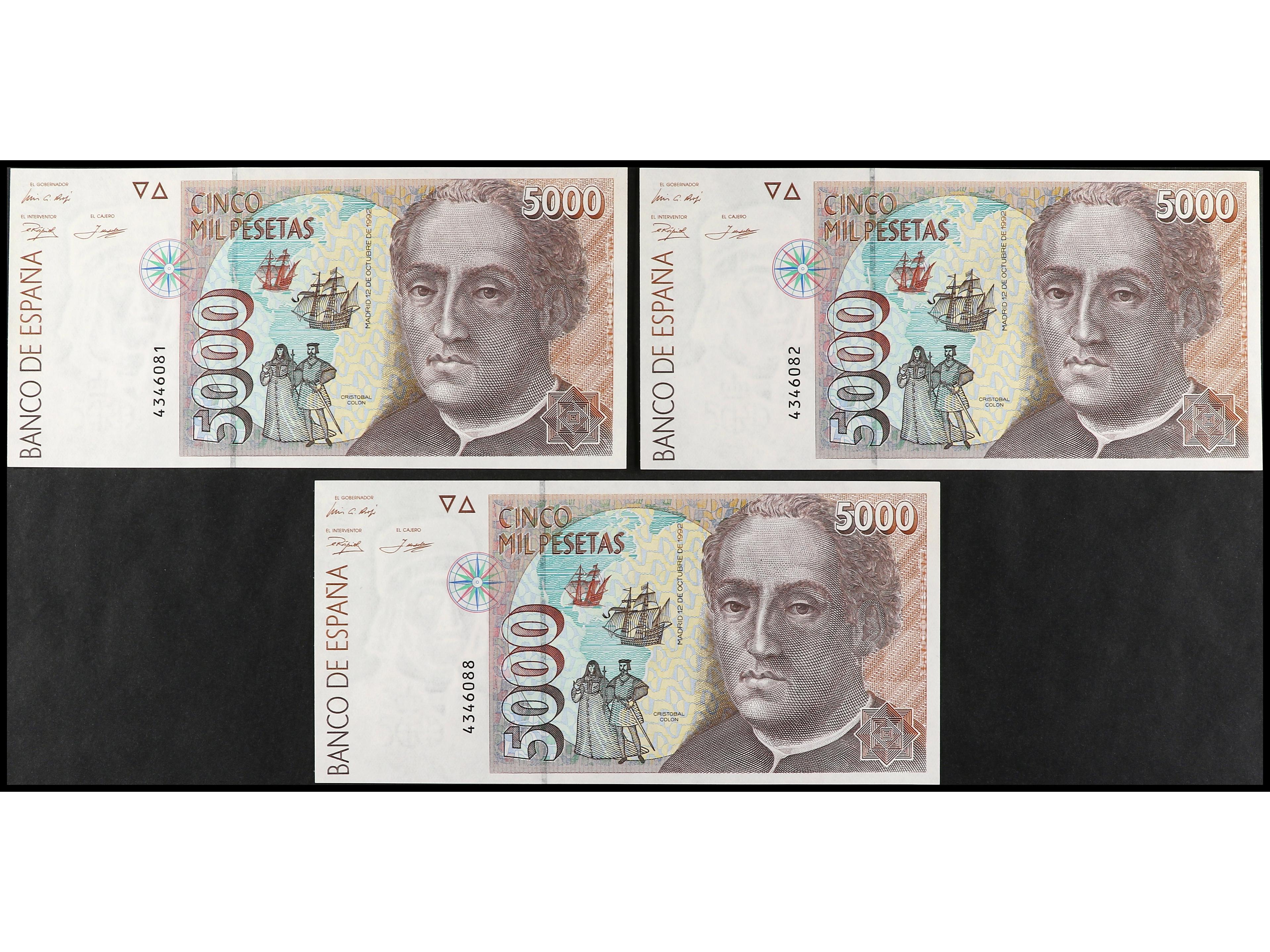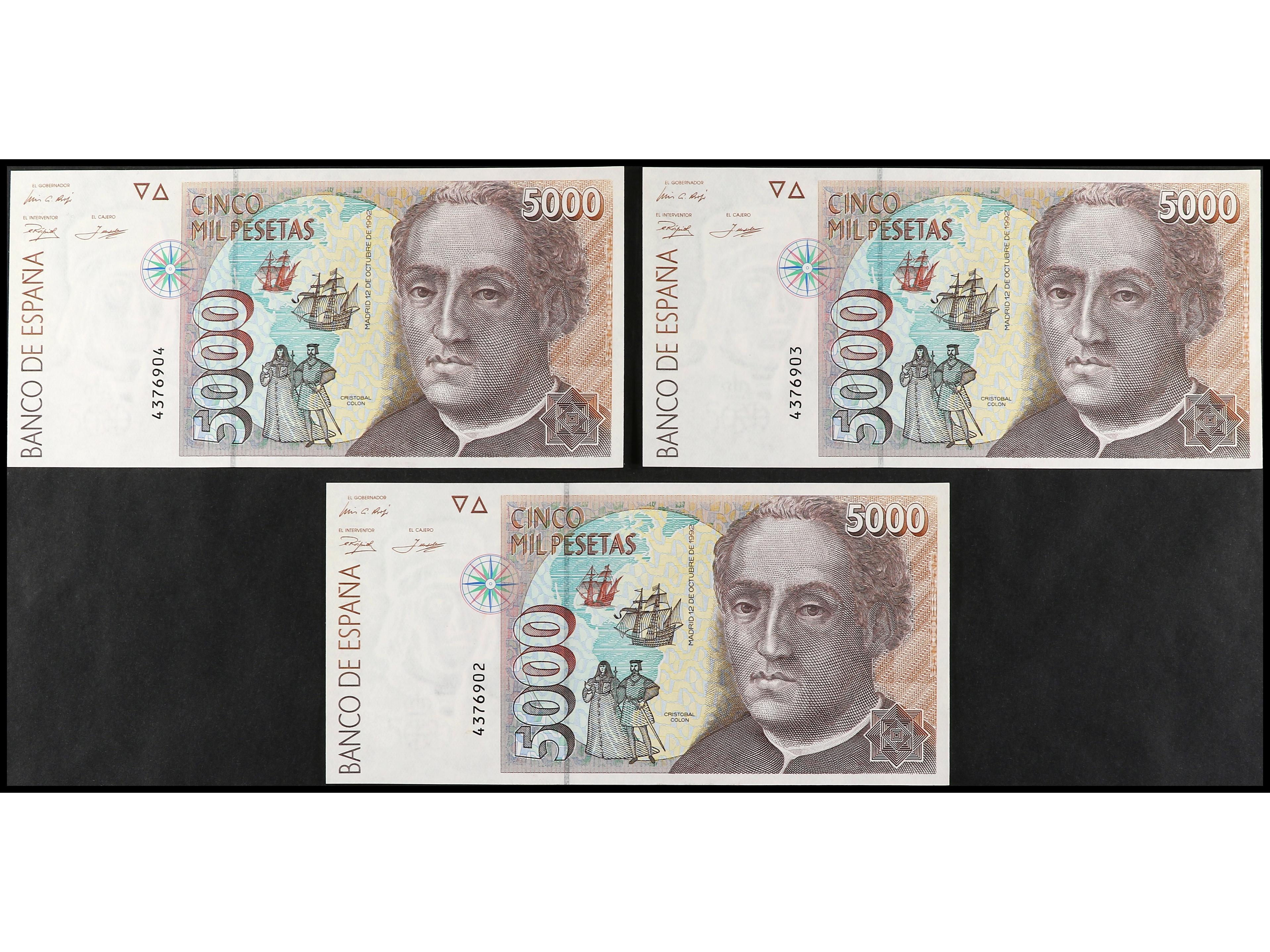 3247 imageLote 3 billetes 5.000 Pesetas. 12 Octubre 1992. Colón. Sin serie. Trío correlativo. Ed-484. SC- a SC. (Image1)